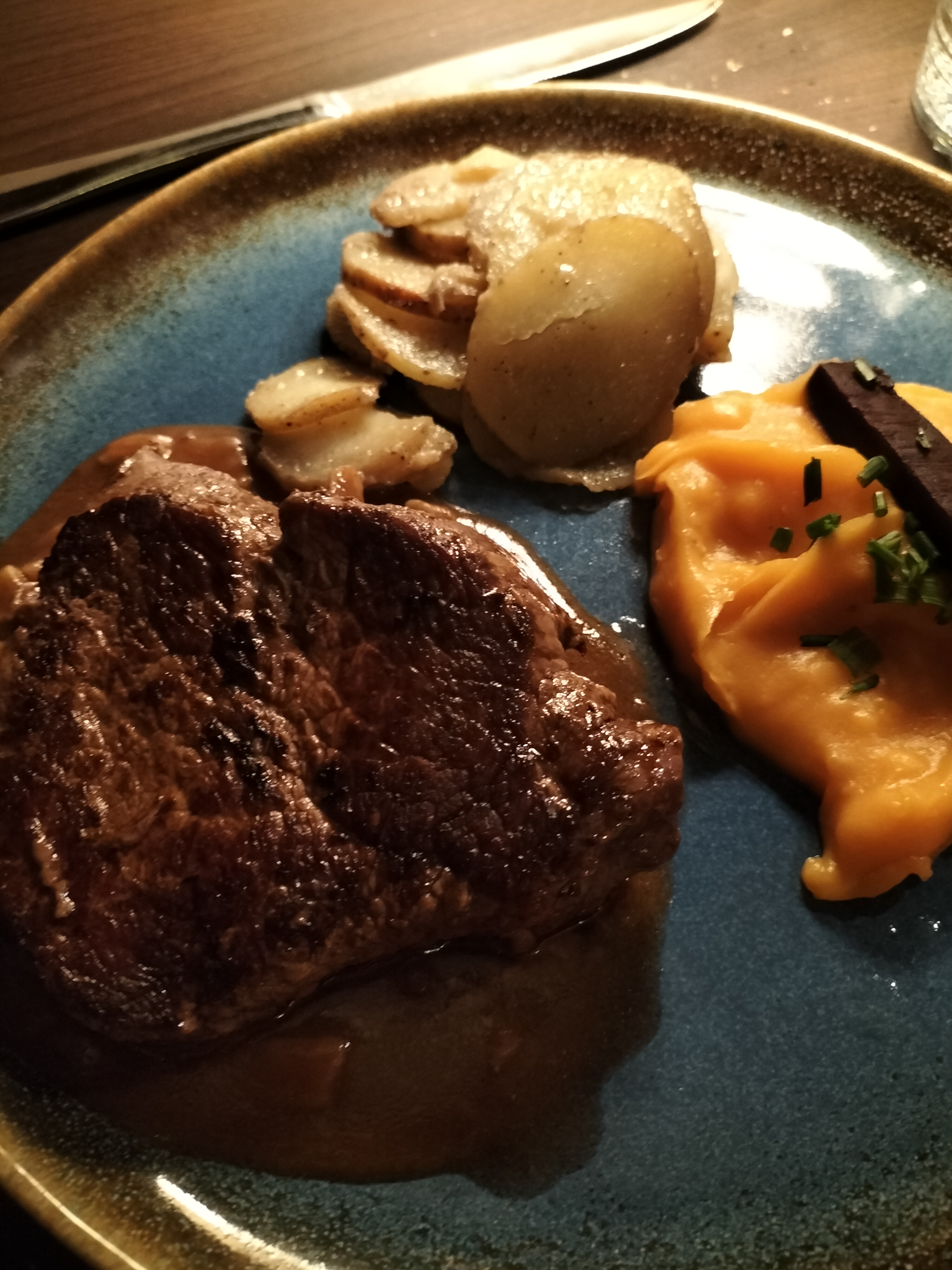 Adore tarte tatin revisite et pièce de boucher à tomber par terre excellent