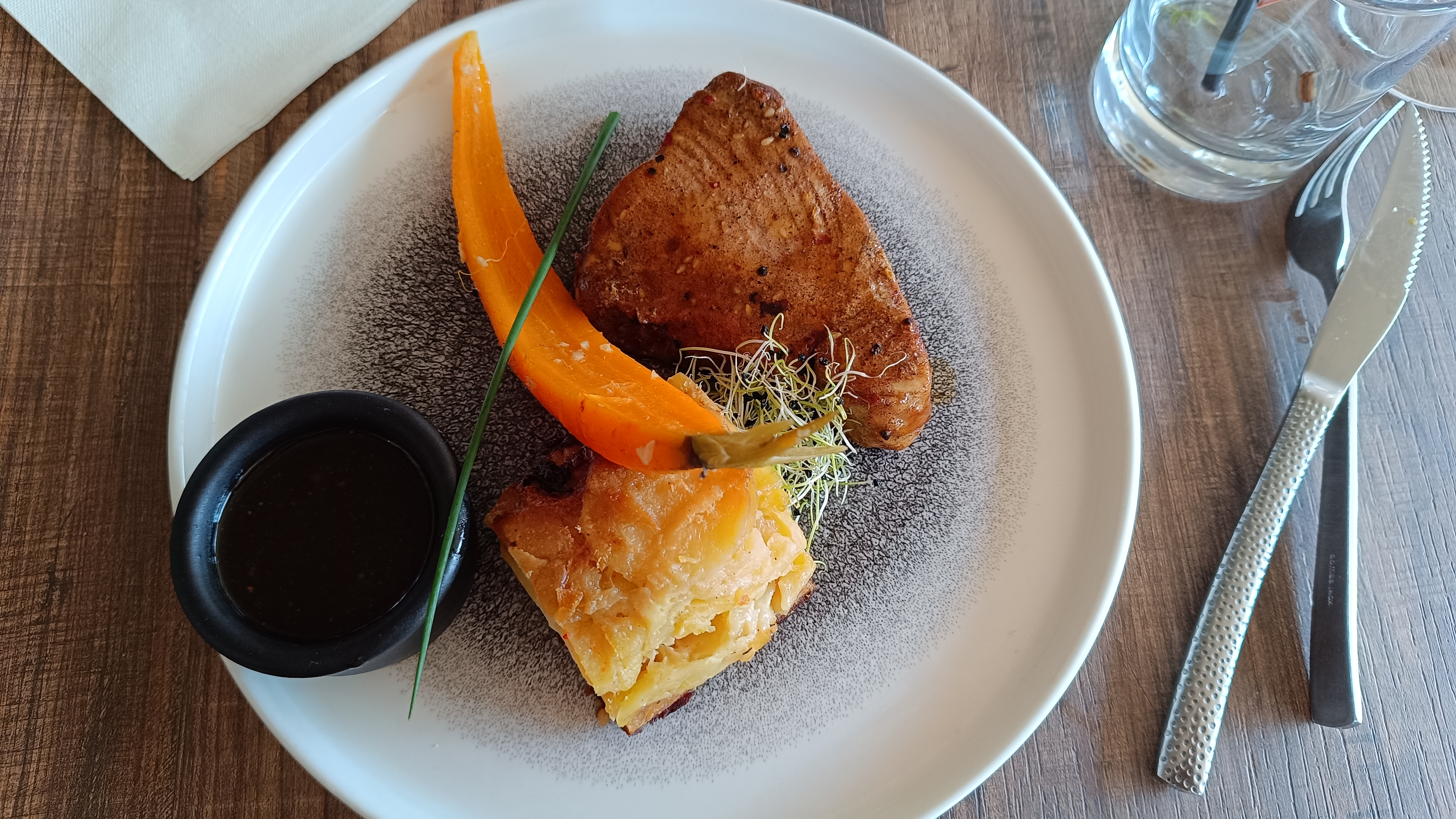 Joli cadre le poisson est excellent ainsi que le gratin L'assiette est belle et bonne Je recommande