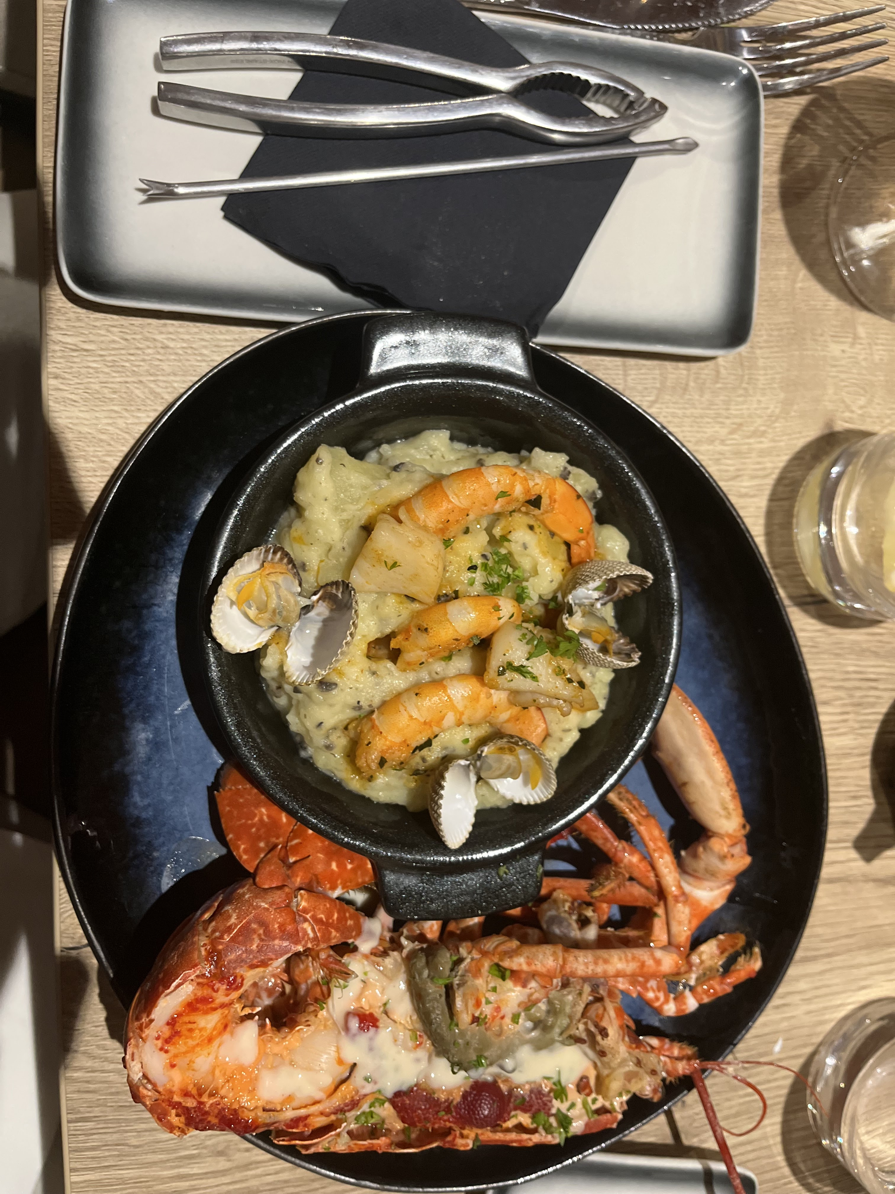 Plateau de fruits de mer 🦞 très bon sauf que les pattes de l'araignée étaient sèches donc immangeable 😭 Le patron nous donne comme version : cuite ce matin, mise au frais en attente du service donc elles ont trop séchées ?? Pas de geste commercial, dommage .... Pour le reste très correcte 👍