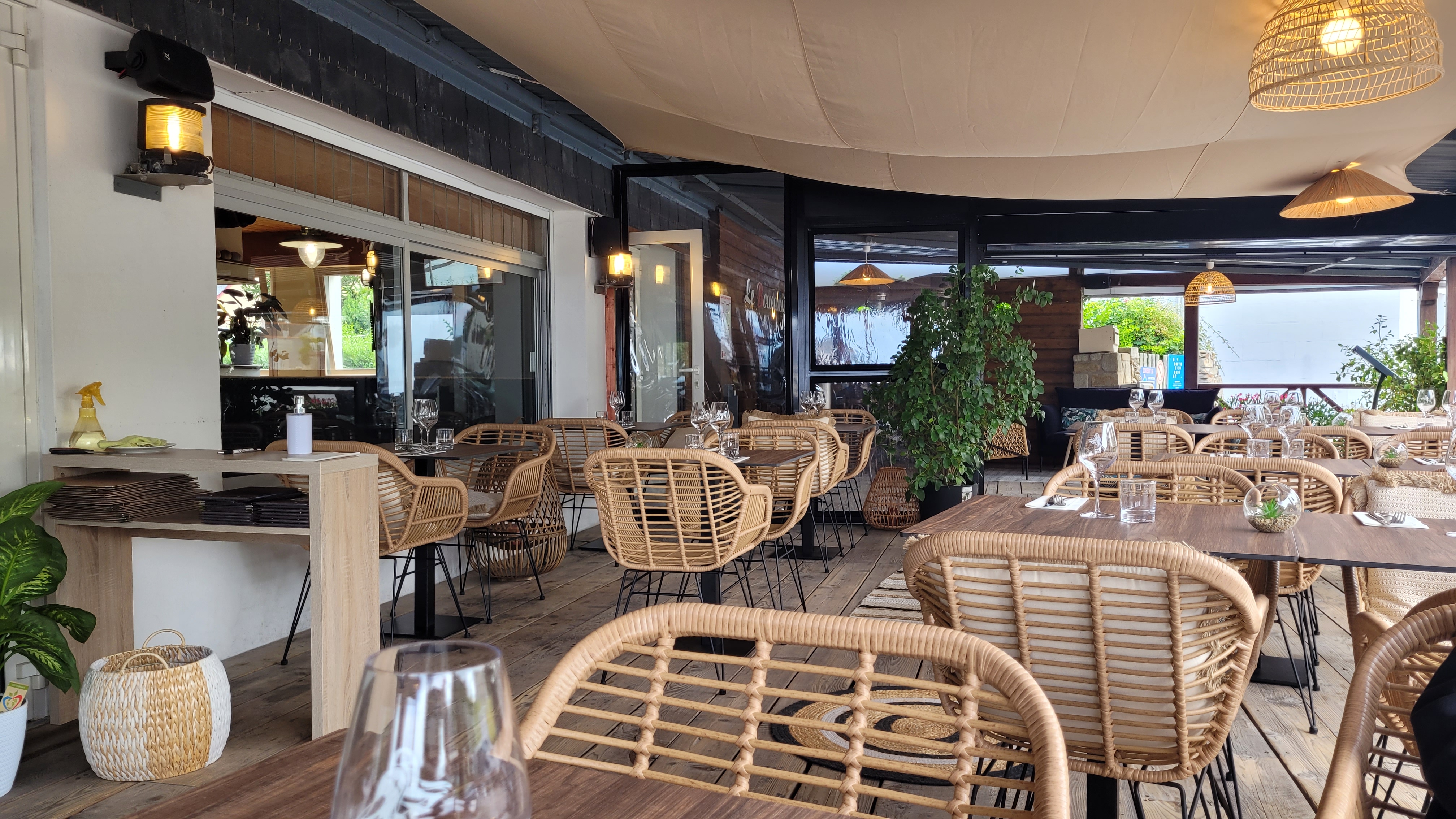 Salle ou terrasse abritée, la vue est agréable donnant sur la baie et petite plage. Accueil souriant et très aimable. Carte variée. J'ai adoré la raie au beurre et câpres. Le tartare excellent!