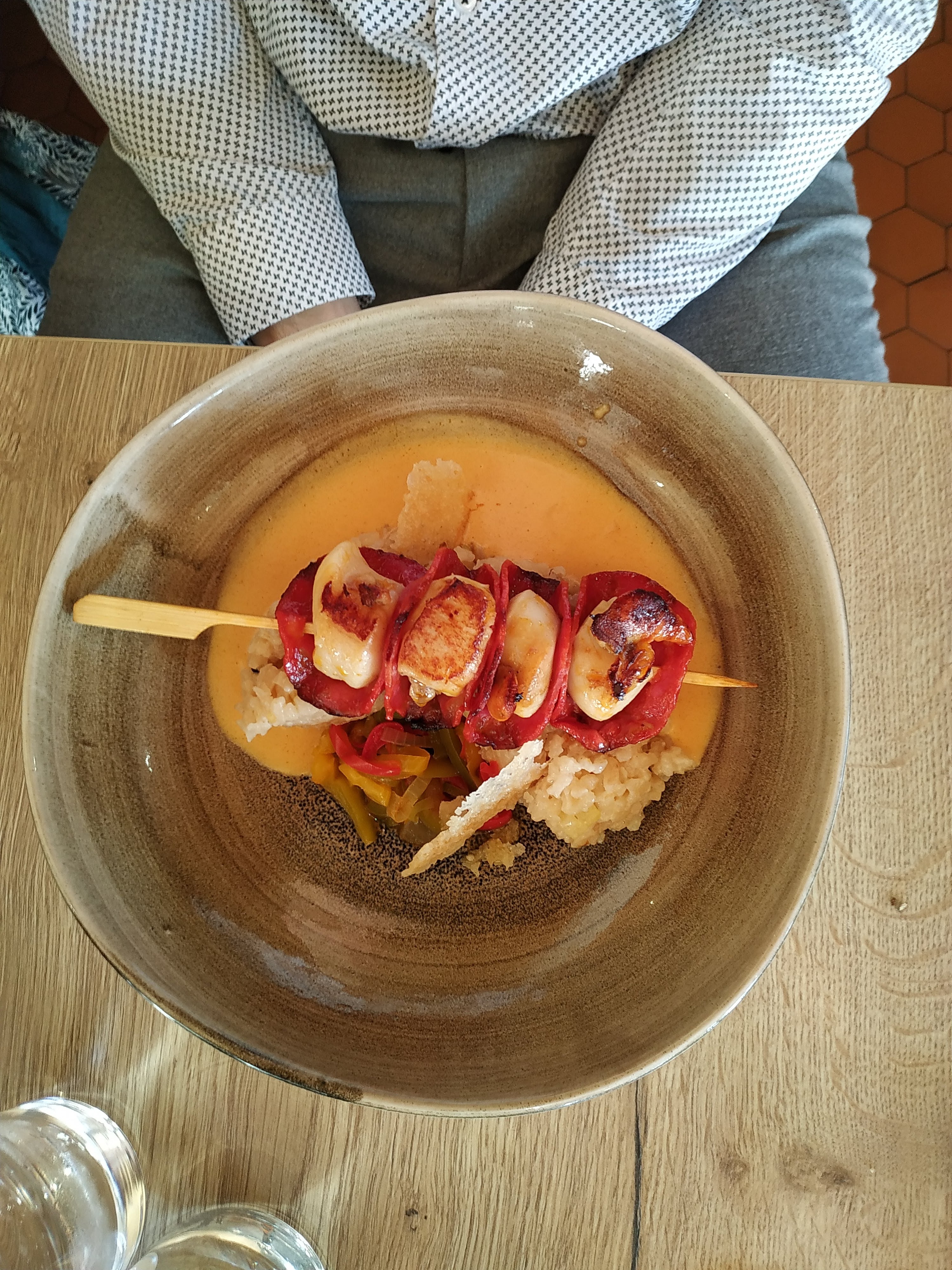 Service très bien, agréable et souriants. On m’a juste demandé 4 fois par plats si tout ce passait bien, ça m’a un peu stressée j’avais l’impression d’être un gars du guide Michelin. Sinon, j’ai pris un ceviche de saint Jacques, goût extra mais assez grossier et servis avec les gros pipous oranges un peu bizarres ne se mangent pas (je savais pas mais j’me disais bien aussi)… J’ai pris en plat la raie au grenailles et aux câpres; les petites pommes grenailles étaient bien grasses et fondantes à souhait ahah ! C’était très bon mais un chouillat trop gras et ça manquait un peu de piment d’espelette sur les PATATES pour relever un peu car très beurré. En dessert la crème brûlée vanille. Rien à dire j’adore ça et elle était très bien réalisée. Merci !
