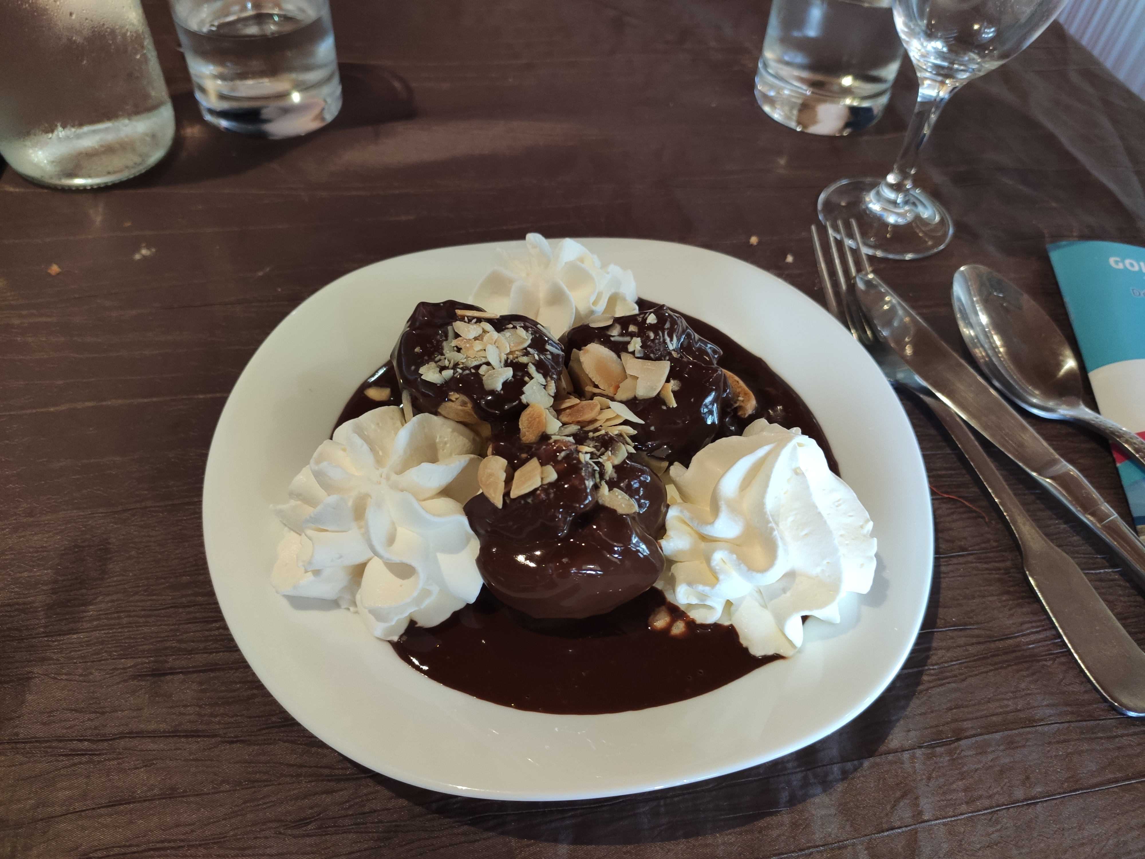 Service sympa. Mais les plats sont arrivés avant l’apéritif !!! Une pavlova pleine de chantilly industrielle et peu de meringue. Dommage on aurait bien pris du vin rouge en mangeant.