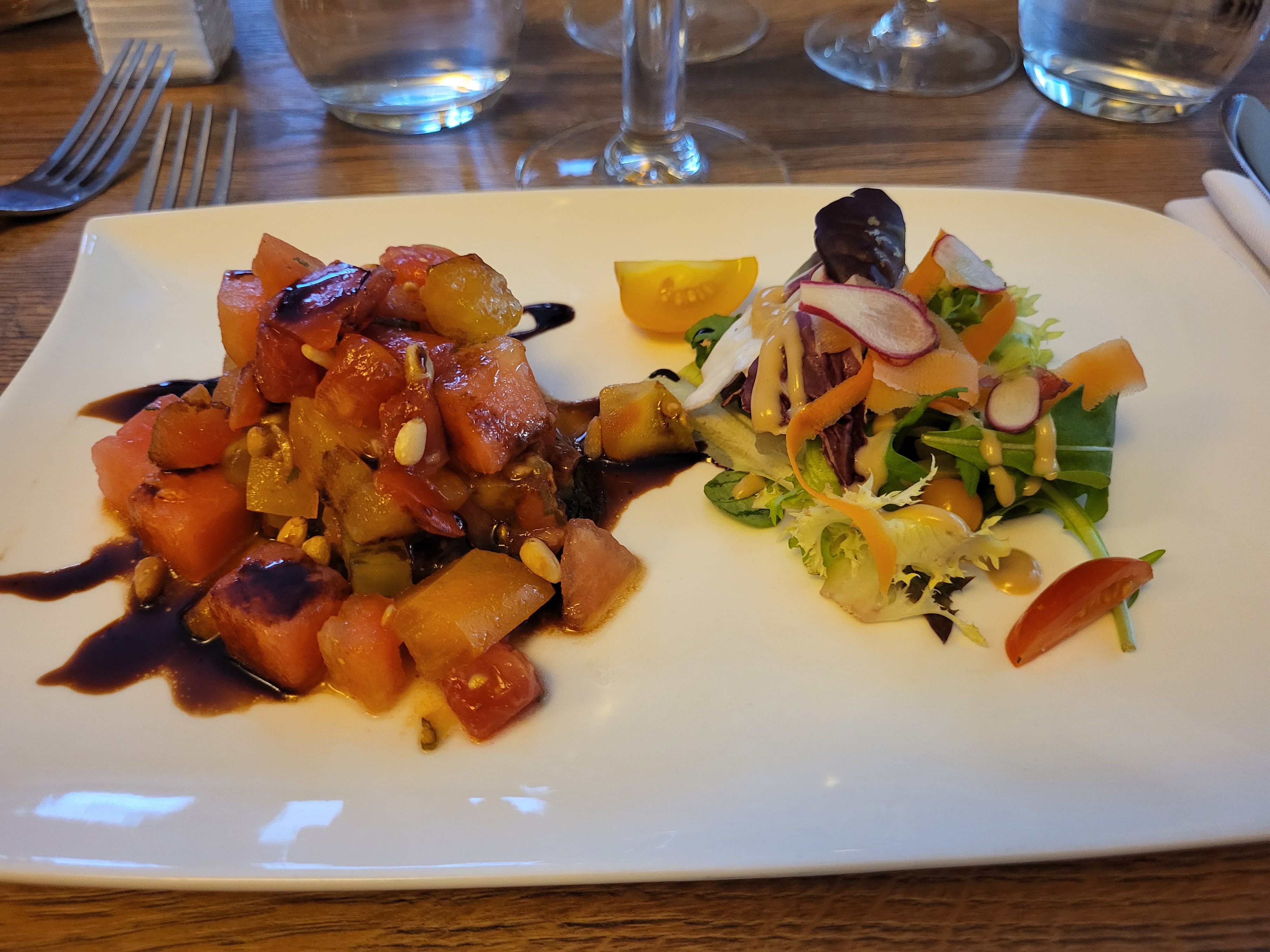 Accueil agréable. Entrée au top. Plat et dessert moyen. Canard sans saveur, légumes excellent.