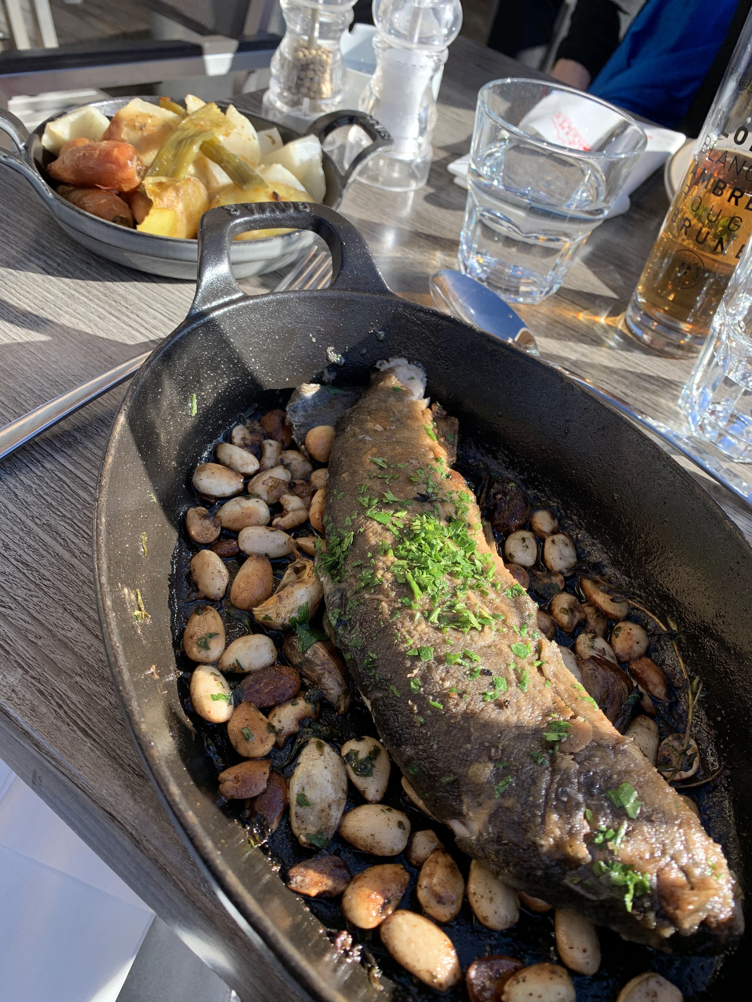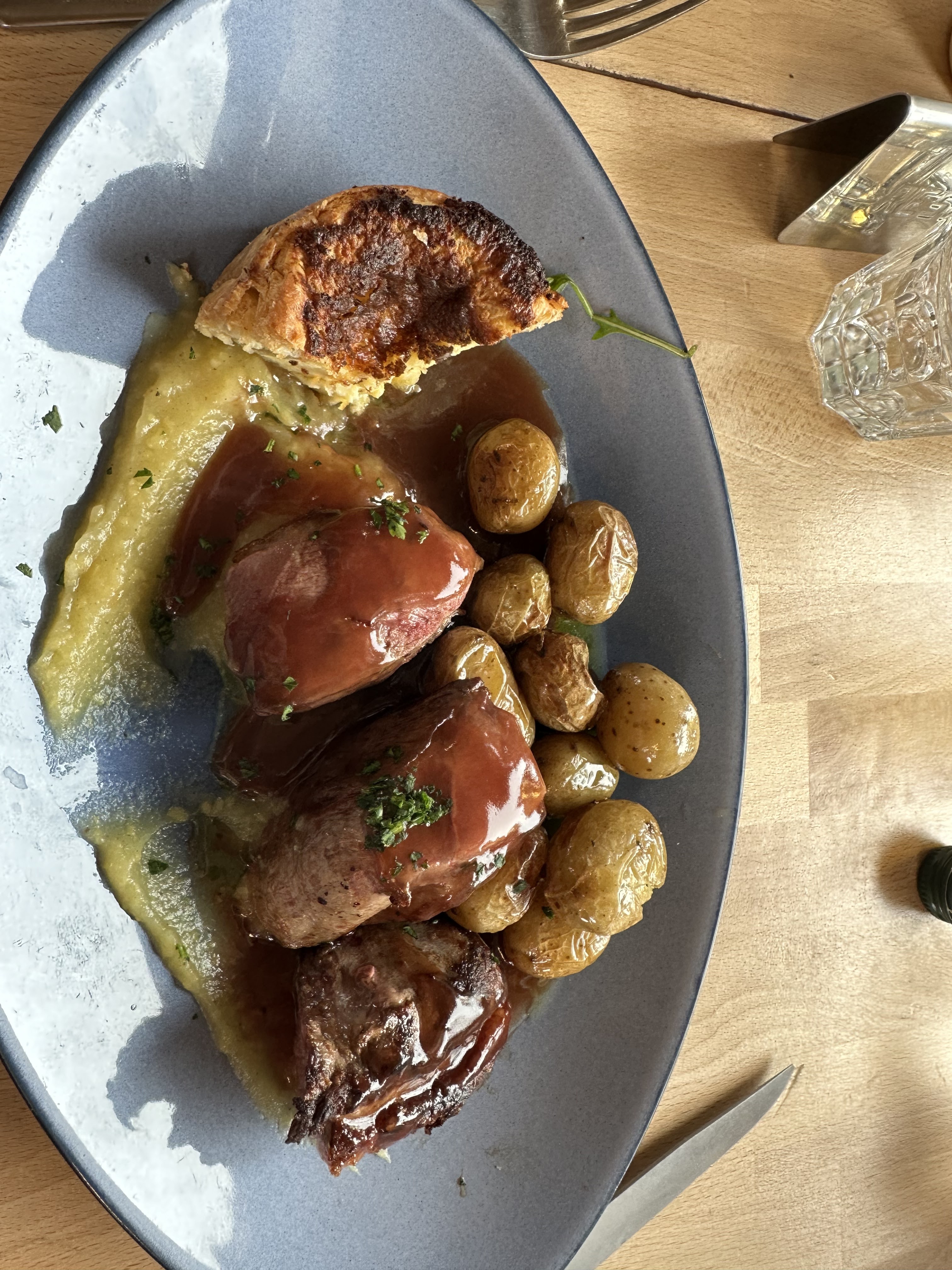 Le carré de cochon et le dessert étaient vraiment succulents. En plus d’une belle vue sur la montagne, le personnel est vraiment super sympa et de bon conseil