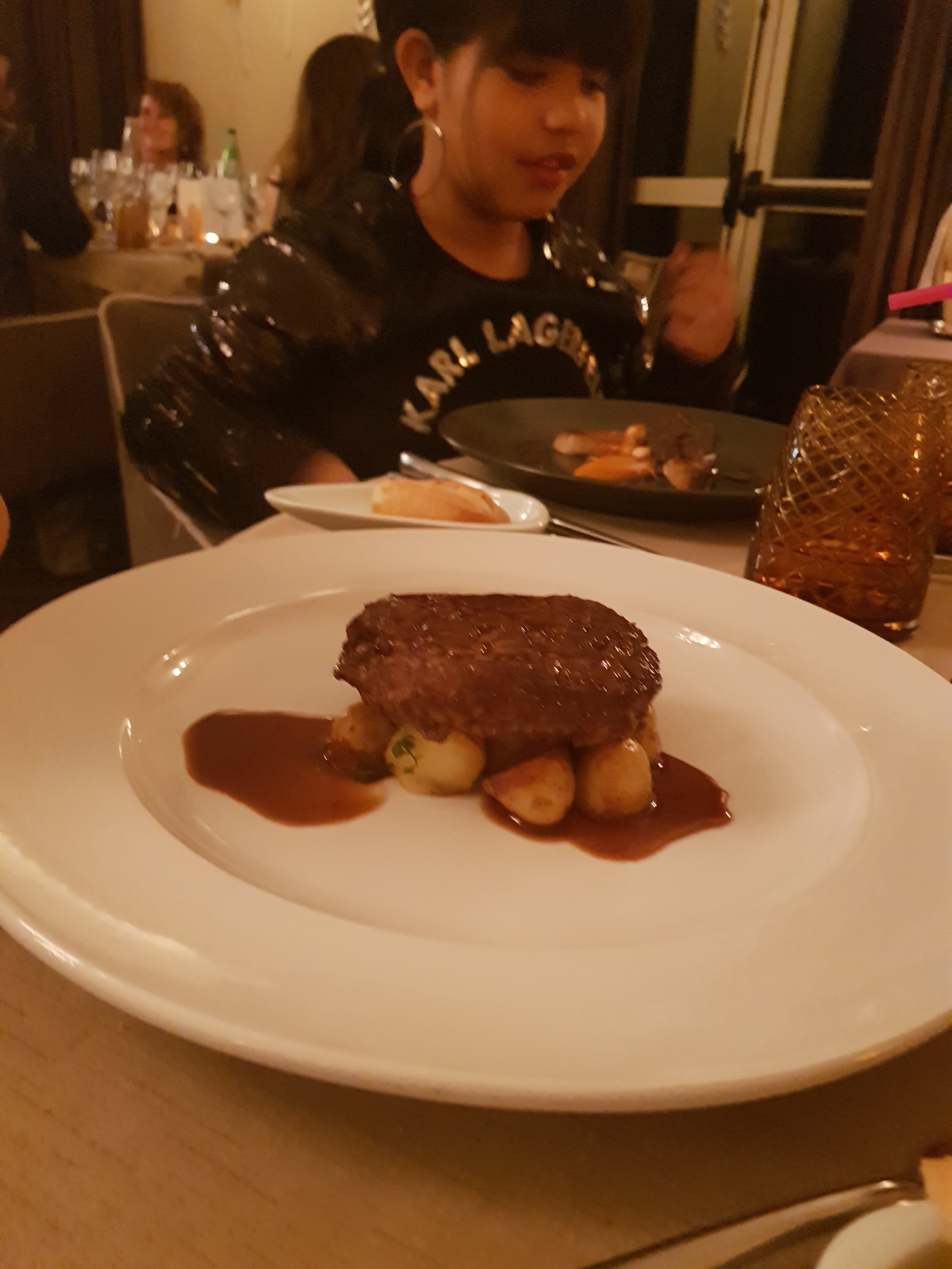 Jamais déçu par ce restaurant qui a déménagé il y a peu. Le menu à 58 est très copieux mais il n'y a que deux choix d'entrée plat dessert. En plus il y a le champagne les amuses bouches et le plateau de fromage. Il manquait juste au plat le petit plus surprenant et magique qu'on aimerait retrouver dans tous les plats d'un tel restaurant. C'était assez basique filer mignon avec des frites entourées de chorizo et sauce. Les plats a la carte ont l'air divin aussi mais c'est un autre budget ! La Salle est moderne bien décoré . Il y a beaucoup de personnel au petit soin . J'ai apprécié le pain sans gluten et le menu adapté sans gluten. Je recommande à 200%