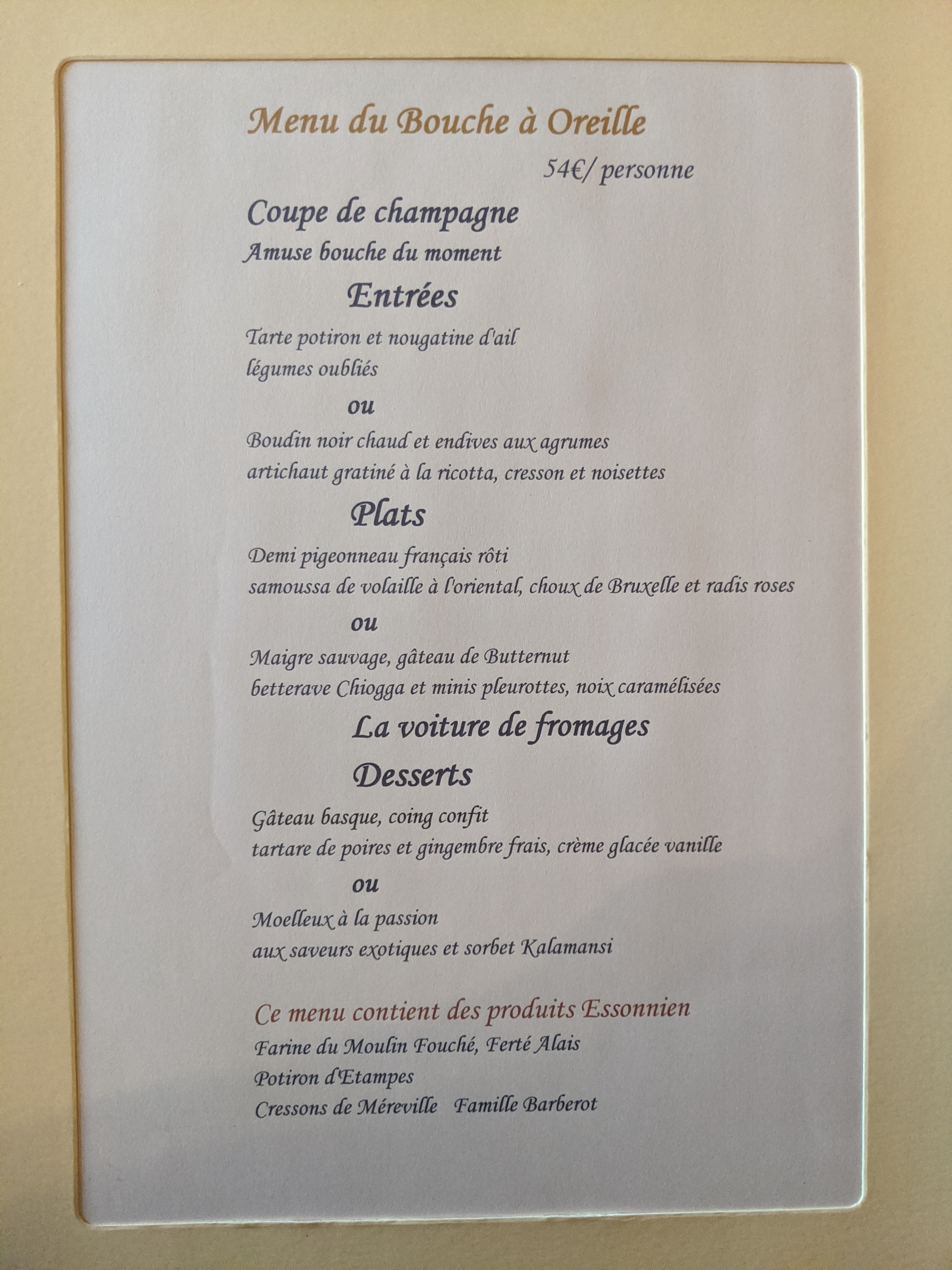 Menu dégustation offert ! Ne connaissait pas ce qui vous sera servi ! Très bon accueil. Au moment du plat, pas d'annonce du met suivant ! Lièvre à la royale ! Goût très sauvage et sauce ferrugineuse car réalisée avec le sang de l'animal ! Pas aimé du tout! C'est dommage car nous y serions bien retournés!