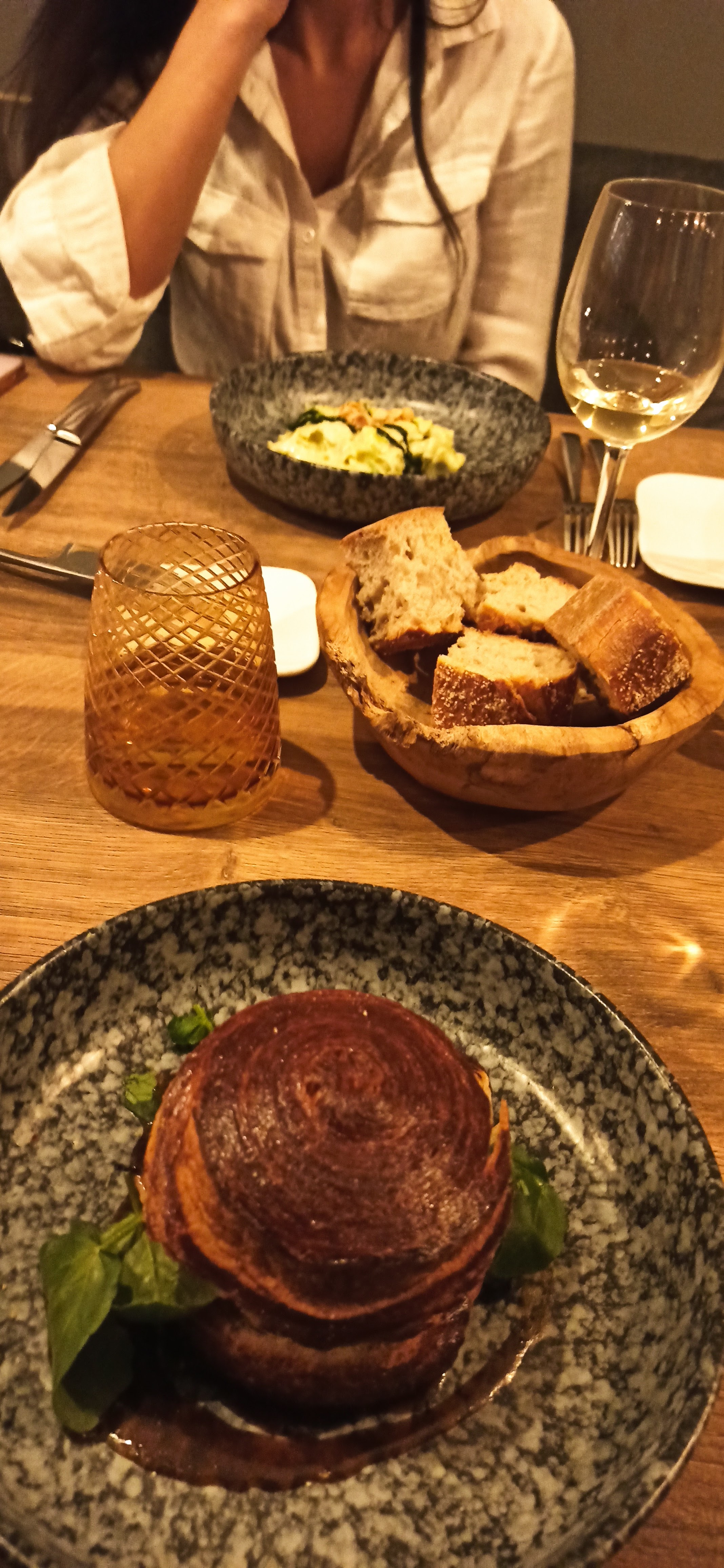 Bon accueil Ambiance chic Belle déco Rapport , qualité prix moyen personnellement je suis un peu déçu je m'attendais à mieux pour un restaurant gastronomique. Mon entrée un buns de poulet trop cuit comme vous pouvez le voir sur la photo légèrement noirci c'est qui donnait un goût de cramé trop présent malheureusement. Mon plat onglet de bœuf que j'avais demandé à Point est arrivé tout juste retourné plein de sang J'ai dû le faire renvoyer en cuisine Hormis ça une fois à la bonne cuisson la viande était bonne et fondante. Le désert par contre rien à dire très bon (Mille feuille revisité)