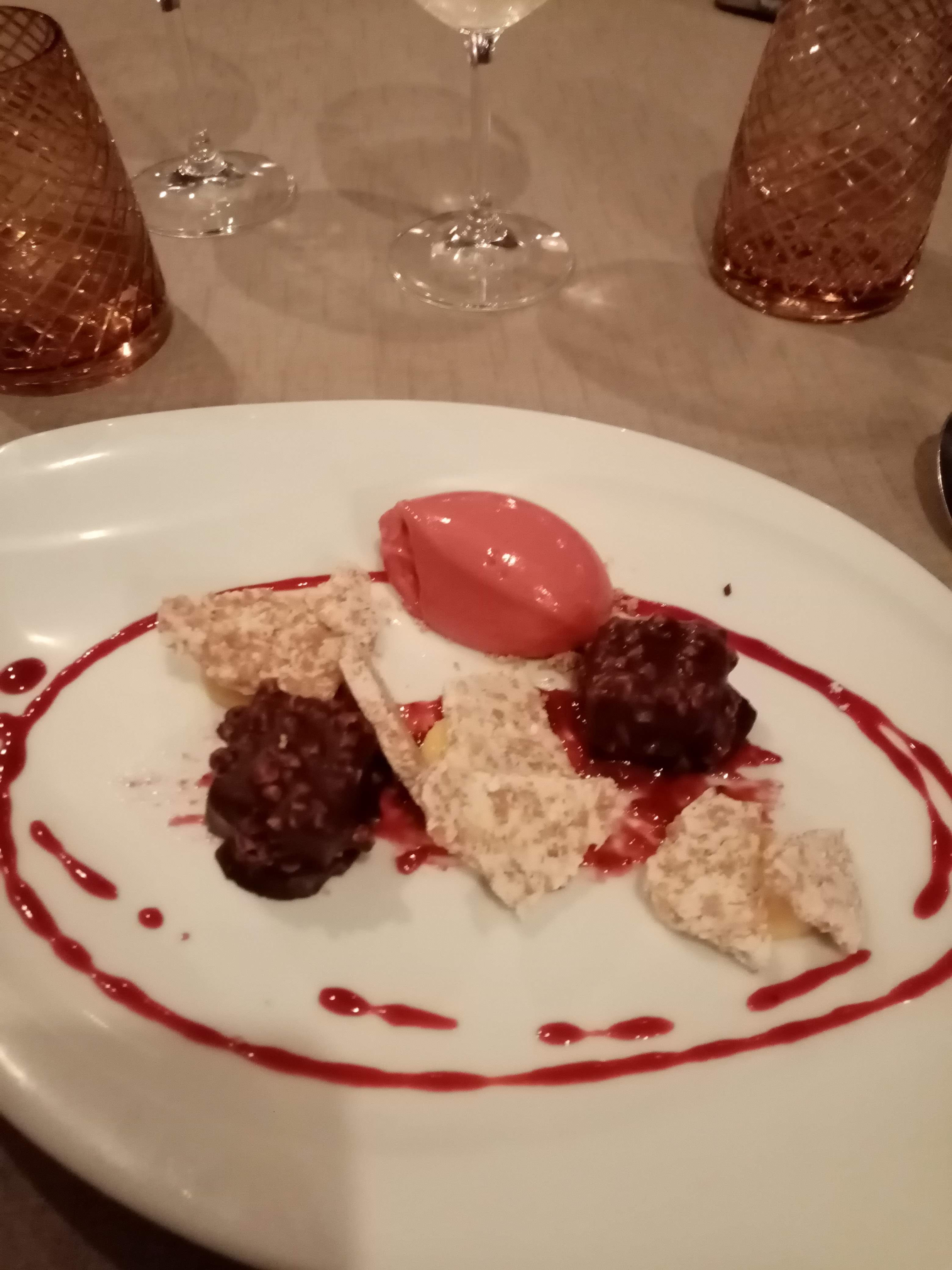 C’est vraiment à la hauteur de l’étoile et les prix restent très raisonnables. Une suggestion : remplacer la mignardise après le dessert par quelques cl de digestif. Nous avions l’estomac rassasié après le premier dessert et cette seconde douceur nous a un peu alourdi.