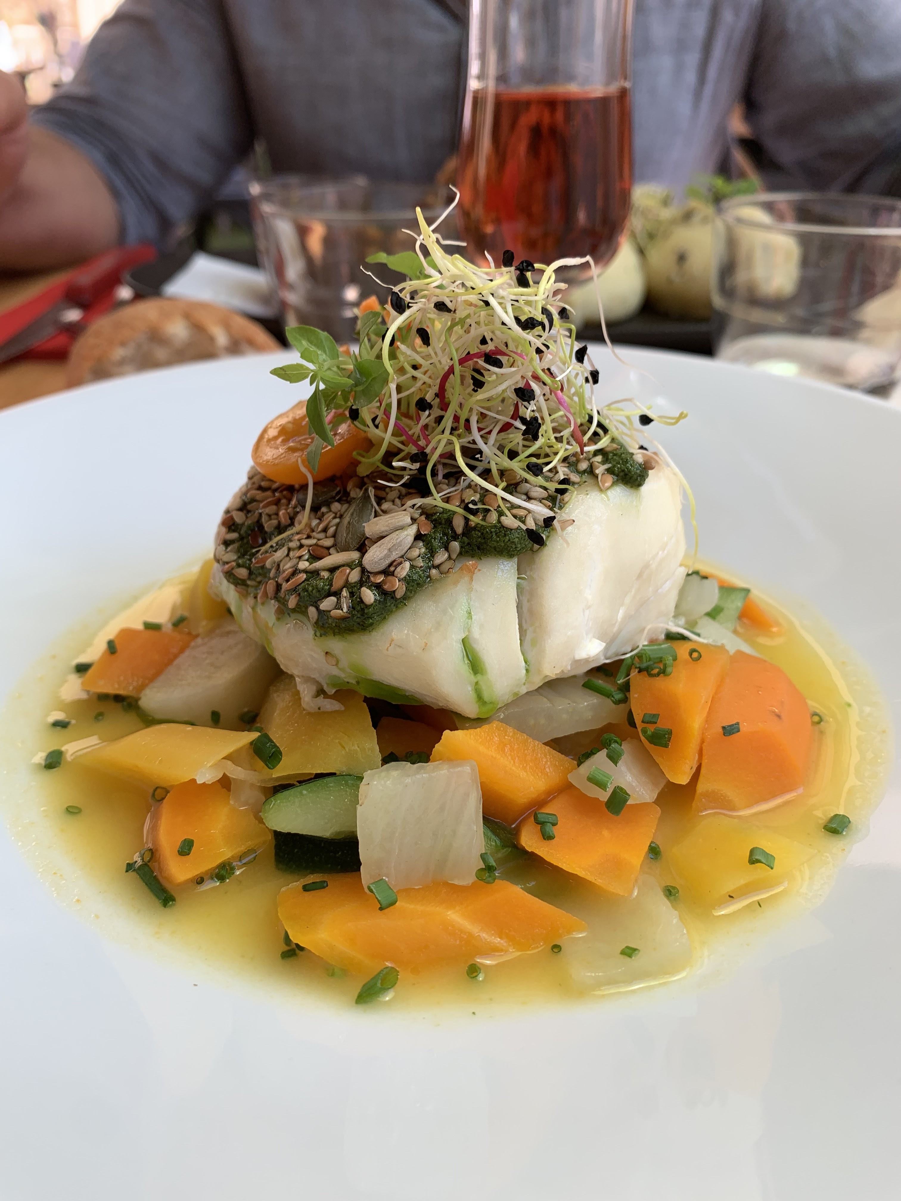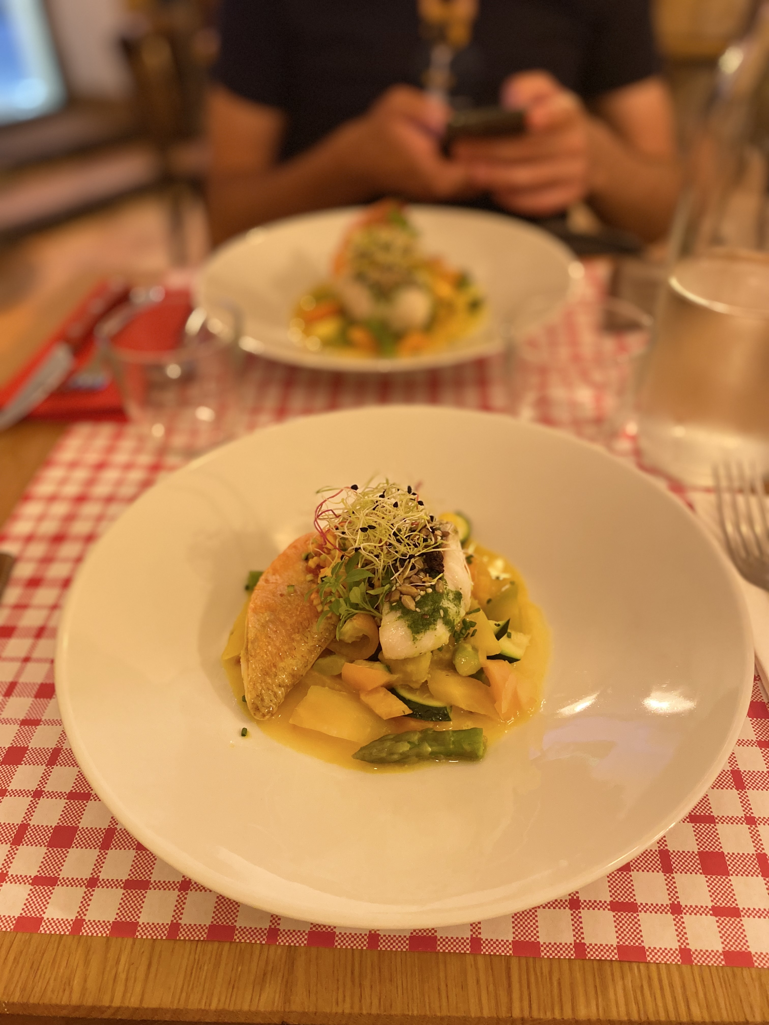 OK....on n'avait pas réservé...table en pein courant d'air , l'œuf parfait était tiède et la sauce très gluante...le poisson tiède..mais cuisson bien .le dessert vegan..un peu écœurant. .le verre de bandol rouge....imposé à 10 euros..limite... .à ne plus refaire malgré les avis élogieux ....un piège à touristes....ou pour les personnes ne sachant pas cuisiner....