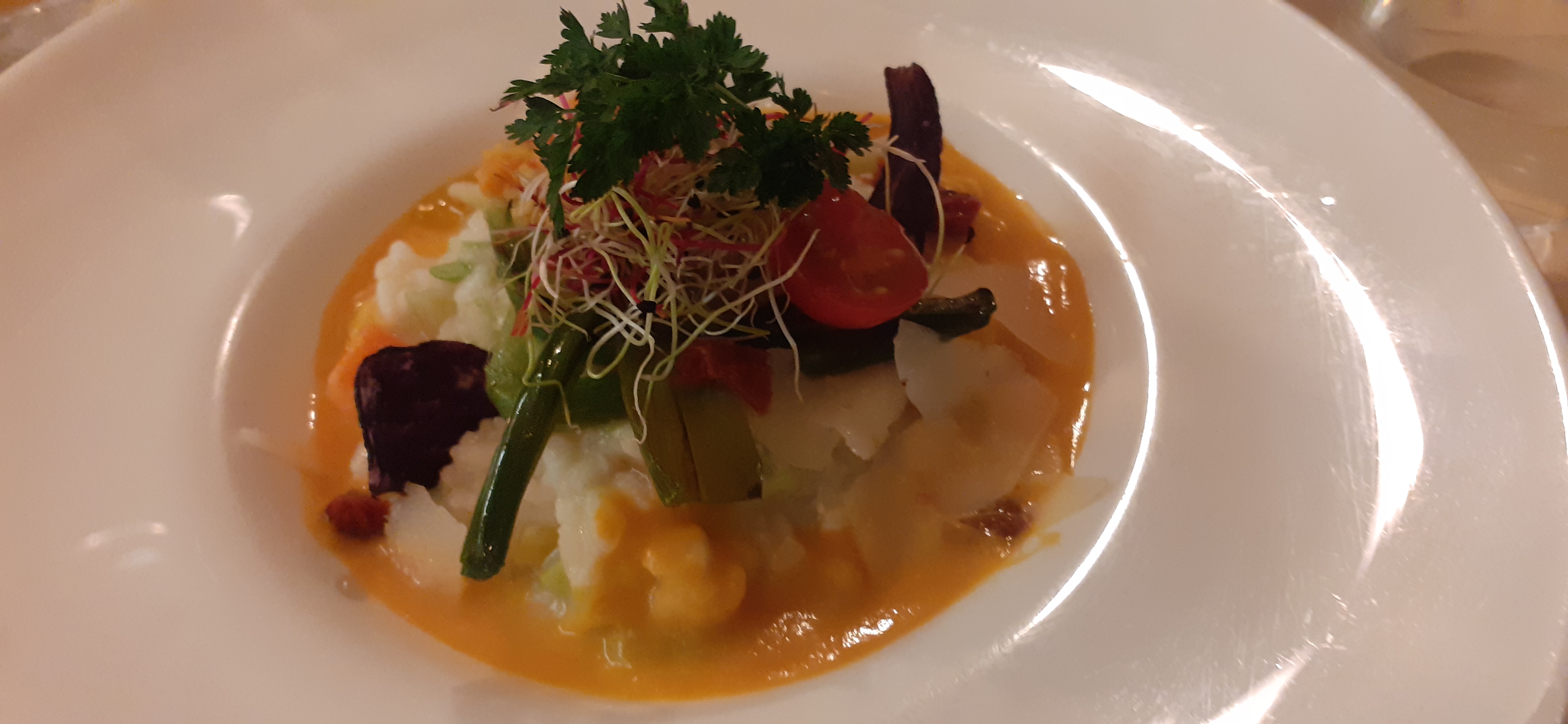 Ne vous attendez pas à trouver des assiettes gastronomiques overbookées avec tout et n'importe quoi, là, il s'agit de vraie cuisine, de mélanges subtils, de saveurs inexplicables. Et puis, le service est au top du top et les plats merveilleusement délicieux. Ne soyez pas effrayé non plus par la petite taille de l'entrée, ce n'est qu'une mise en bouche pour la suite du repas. Encore merci au Chef, à toute l'équipe en cuisine et au super serveur pour sa bonne humeur, ses excellentes connaissances culinaires et ses formidables explications sur l'art de la table.