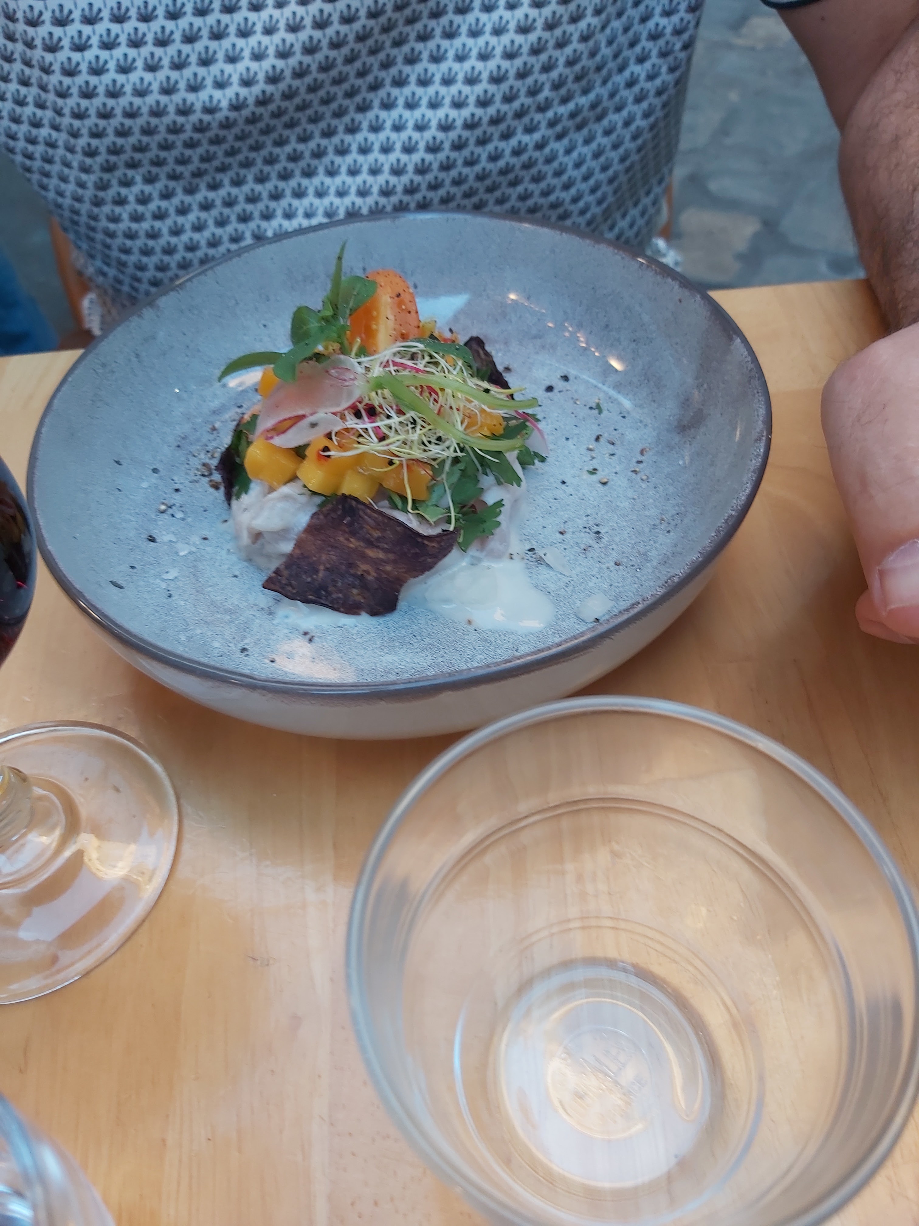accueil très sympathique cuisine simple et fraîche mais hétérogène selon les assiettes. L'addition peut malgré tout vite grimper. Service long ce soir là tables pleines mais alors ça fait pas très pro de faire une pause clope tous les quarts d'heure.