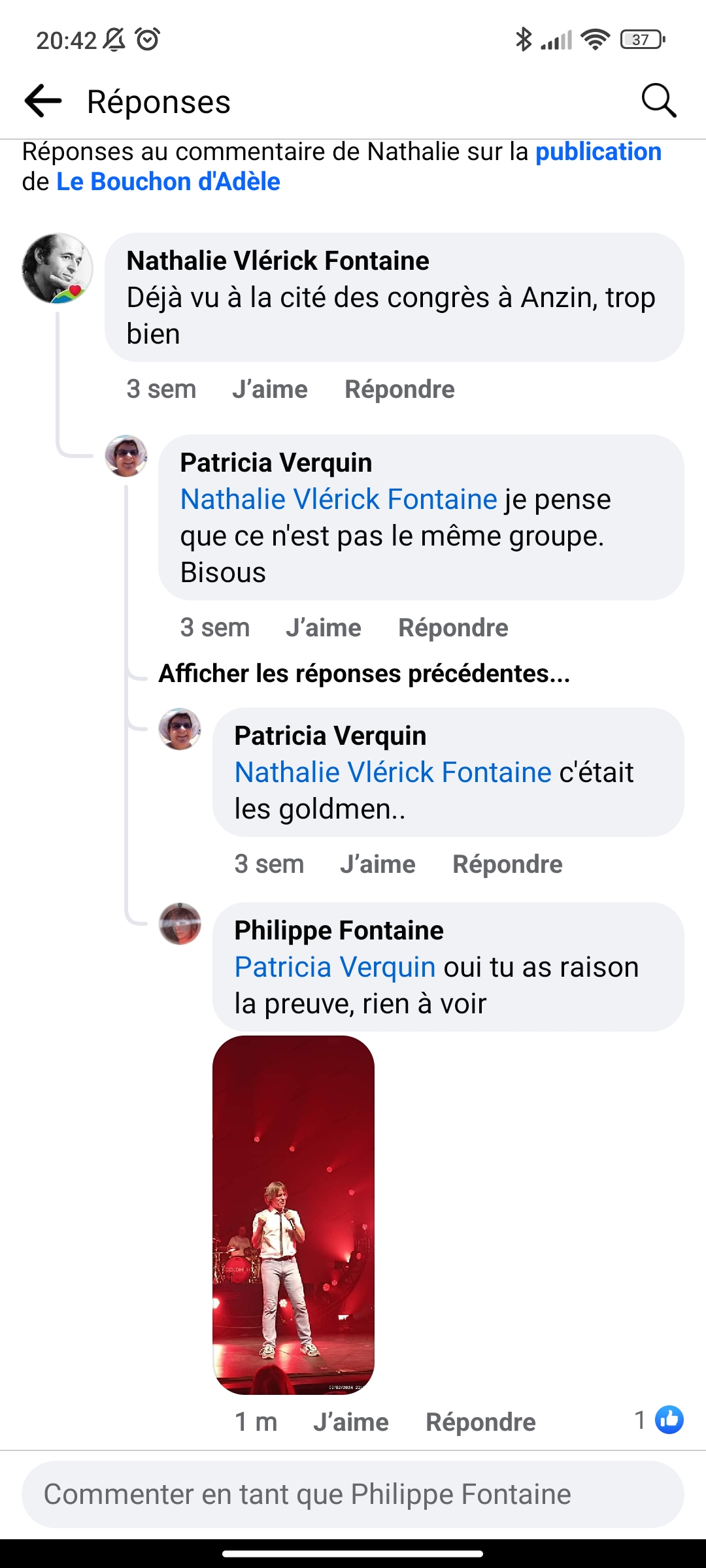 Bonjour, pour la fête des mères, cet endroit dit inviter un groupe qui chante Jean Jacques Goldman, et dit que Goldmen Tribute est le groupe qui se produira chez eux, et bien non j'ai apporté la preuve hier soir mais par deux fois mes commentaires et photo ont été retiré, et aujourd'hui je ne peux plus accéder a la page Facebook, bizarre non, attention il ne faut pas prendre les gens pour des imbéciles. Un peu de sérieux quand même. Je joint une photo des Goldmen Tribute, bonne journée