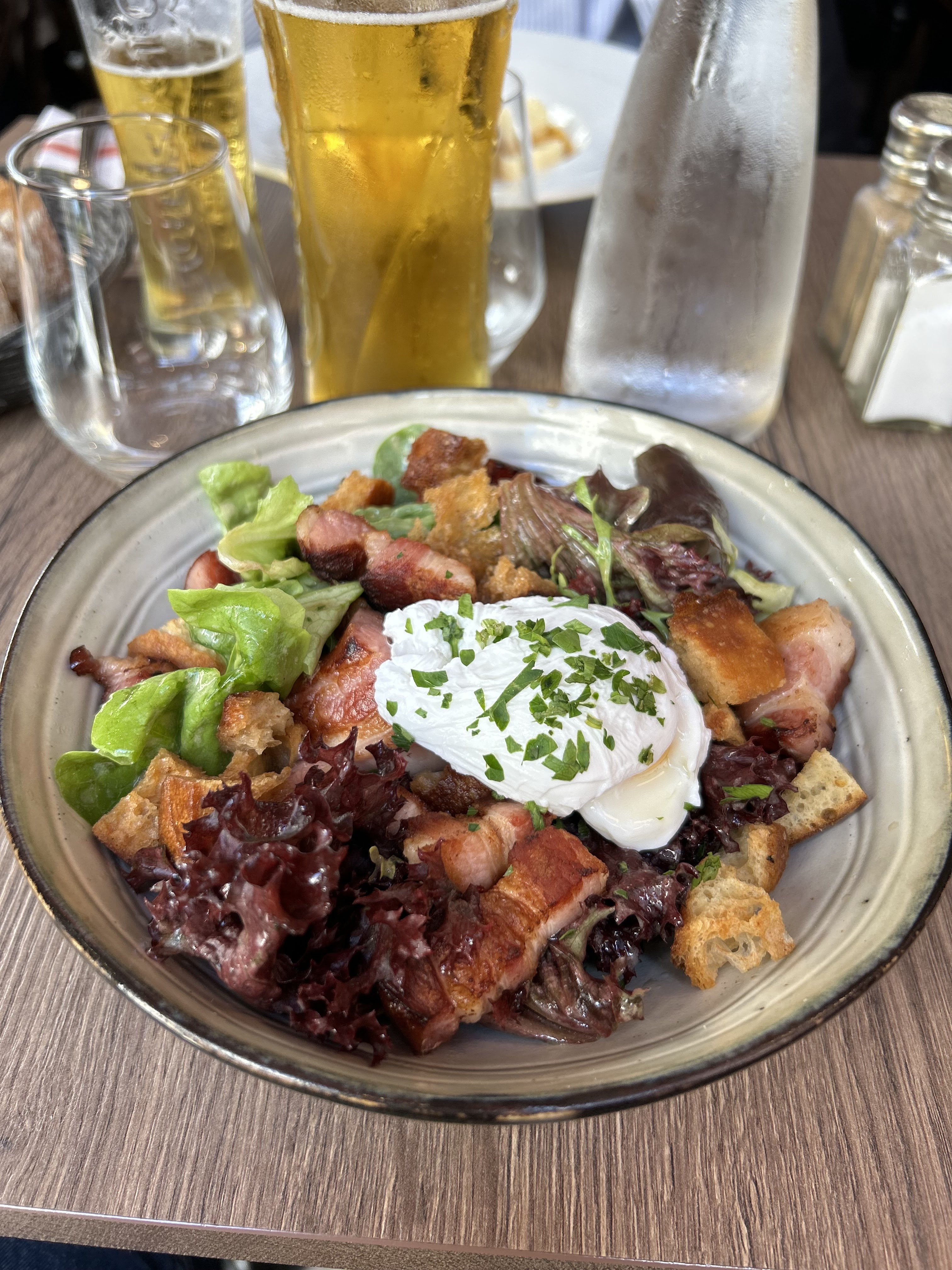Un Bouchon comme on les aime La quenelle de brochet délicieuse Une salade lyonnaise parafaite Des bons vins à la carte Un régal