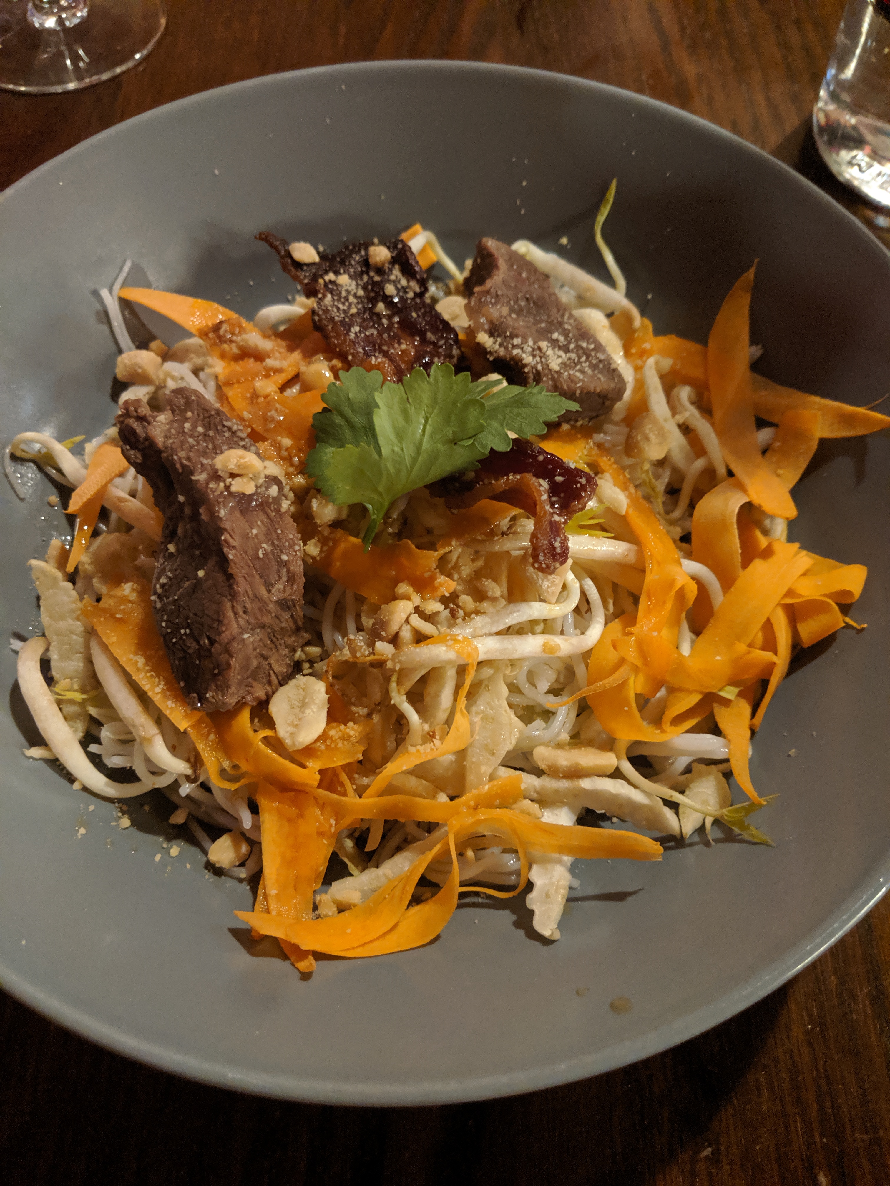 Dans l’ensemble, la qualité n’est pas à la hauteur du prix ici. Les entrées étaient sans émotion et instantanément oubliables. Le plat principal était bon, mais ma petite amie et moi étions d'accord sur le fait qu'ils étaient sous-épicés et fades. C'est un menu très discret qui pourrait nécessiter un peu d'inspiration. Le fromage avait plus le goût d'une tasse de yaourt acheté en magasin et le dessert était également fade au point que je me dégageais les sinus pour tenter de le goûter (comme cela ne devrait jamais être le cas pour un gâteau au chocolat et au caramel). Le service était cependant assez bon et l'atmosphère rendait la soirée intéressante, mais si vous recherchez une nourriture mémorable, ce n'est tout simplement pas l'endroit idéal.