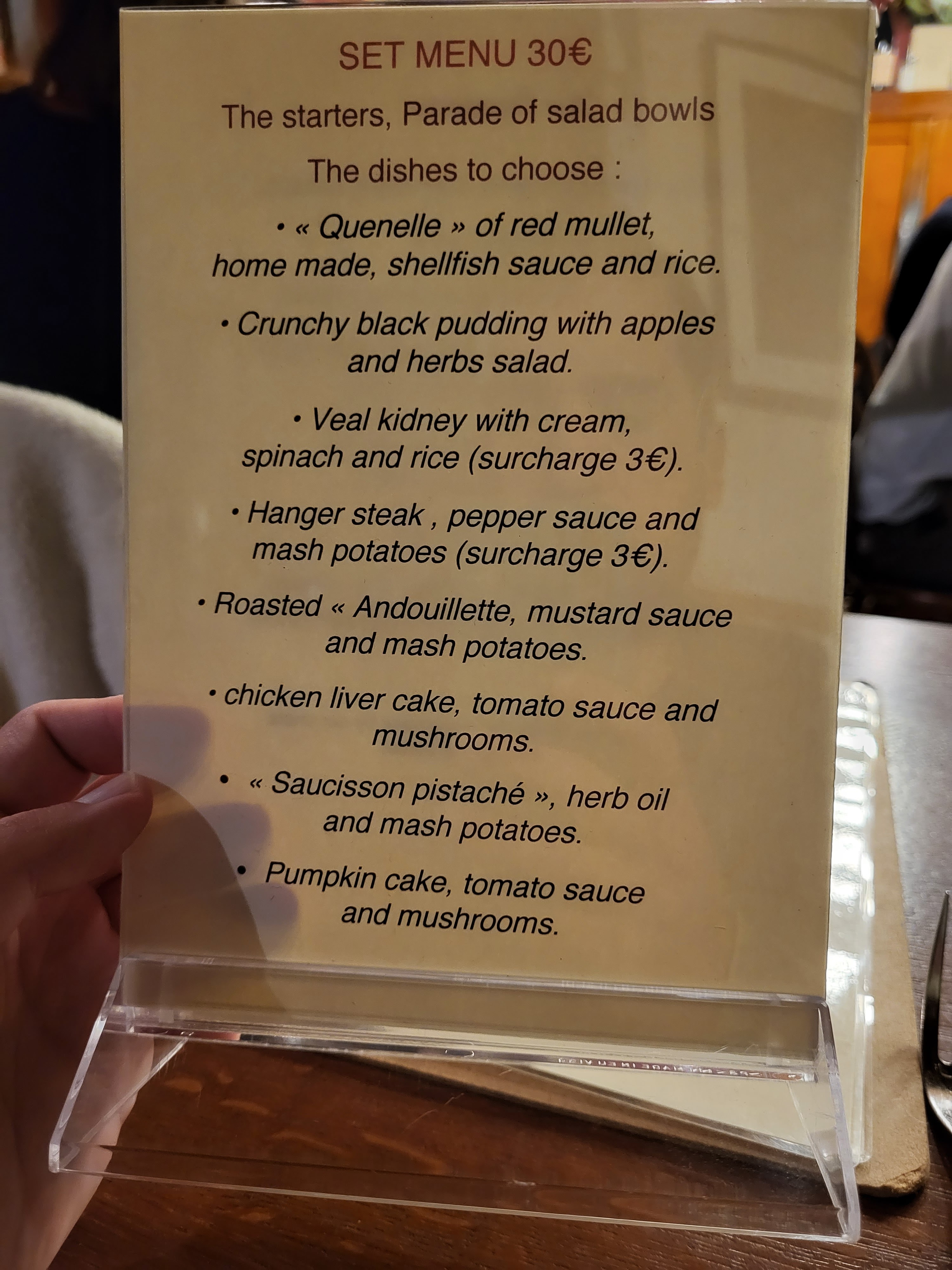 Vous pouvez essayer ce que vous attendez de la cuisine française la plus délicieuse. Personnel cool et serviable. Bon service . Nourriture savoureuse . Ambiance chaleureuse. Bonne variété de nourriture. J'y suis allé avec mes amis et nous sommes tous satisfaits du goût et de la qualité. Nous étions 8 alors ils nous ont donné une table près de la cuisine que c'était un problème à cause de la fumée de cuisson. Je recommande au restaurant de retirer la table juste à côté de la cuisine car il n'est pas agréable de sentir l'odeur et la fumée des aliments pendant 3 heures (car le menu comprend une salade, un plat principal, du fromage et un dessert, vous resterez donc au restaurant pendant 3 heures. au moins ) Les salades étaient très variées et vraiment savoureuses. La nourriture principale était délicieuse. Le fromage était super délicieux et à la fin le dessert était la meilleure fin de la soirée) Le prix du menu est de 28€ sans boisson (pour certains plats principaux il faudra payer 3€ de plus) Le gratin de pâtes qui accompagne le plat principal est super délicieux ) Je vous recommande d'y aller si vous avez vraiment très faim car la nourriture est lourde.