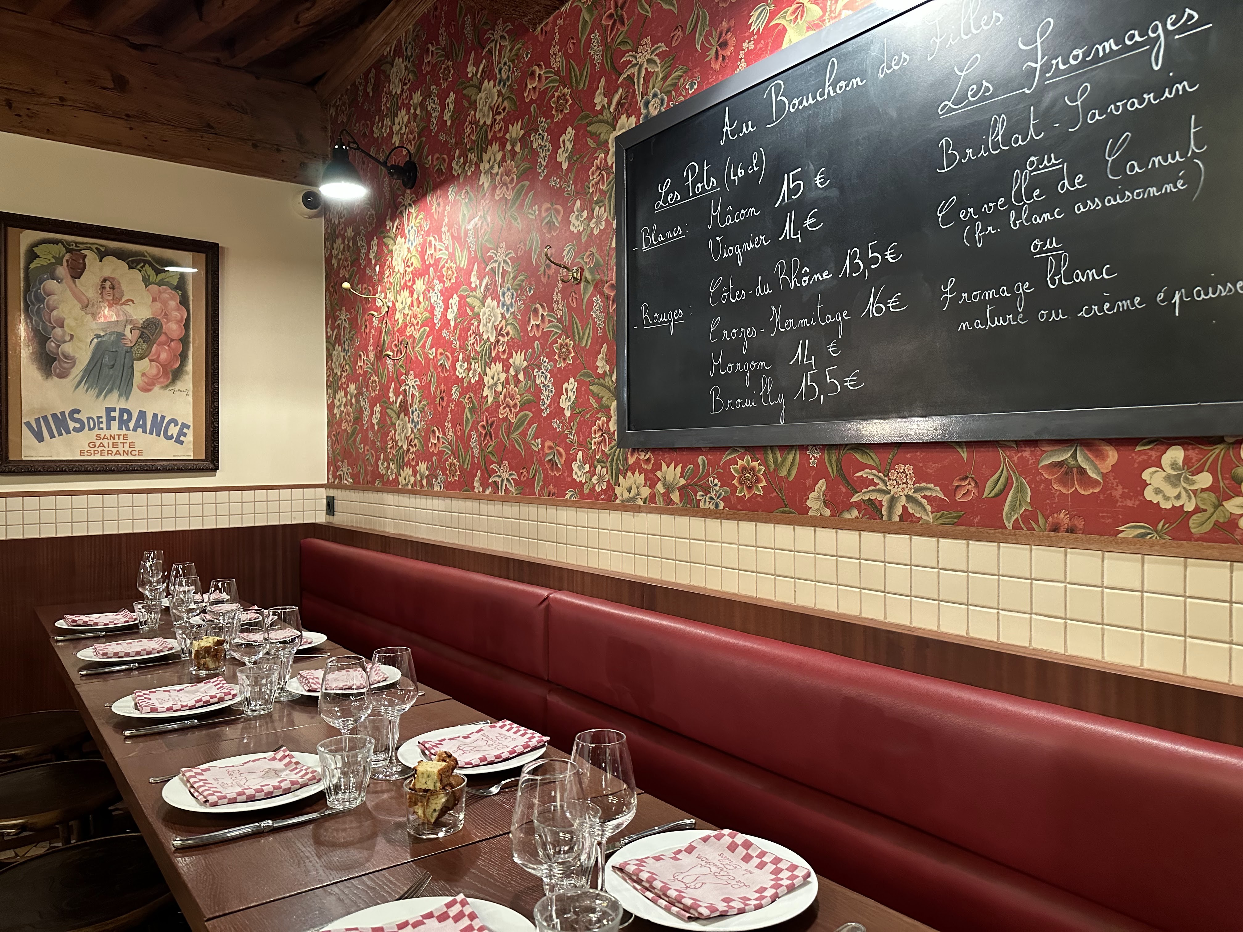 Très bon passage au Bouchon des Filles, un menu peu cher vu la quantité et la diversité des plats (même le fromage est compris dans le menu !). Une petite salle mais à l'ambiance tranquille, typique d'un bouchon. Pensez à réserver !