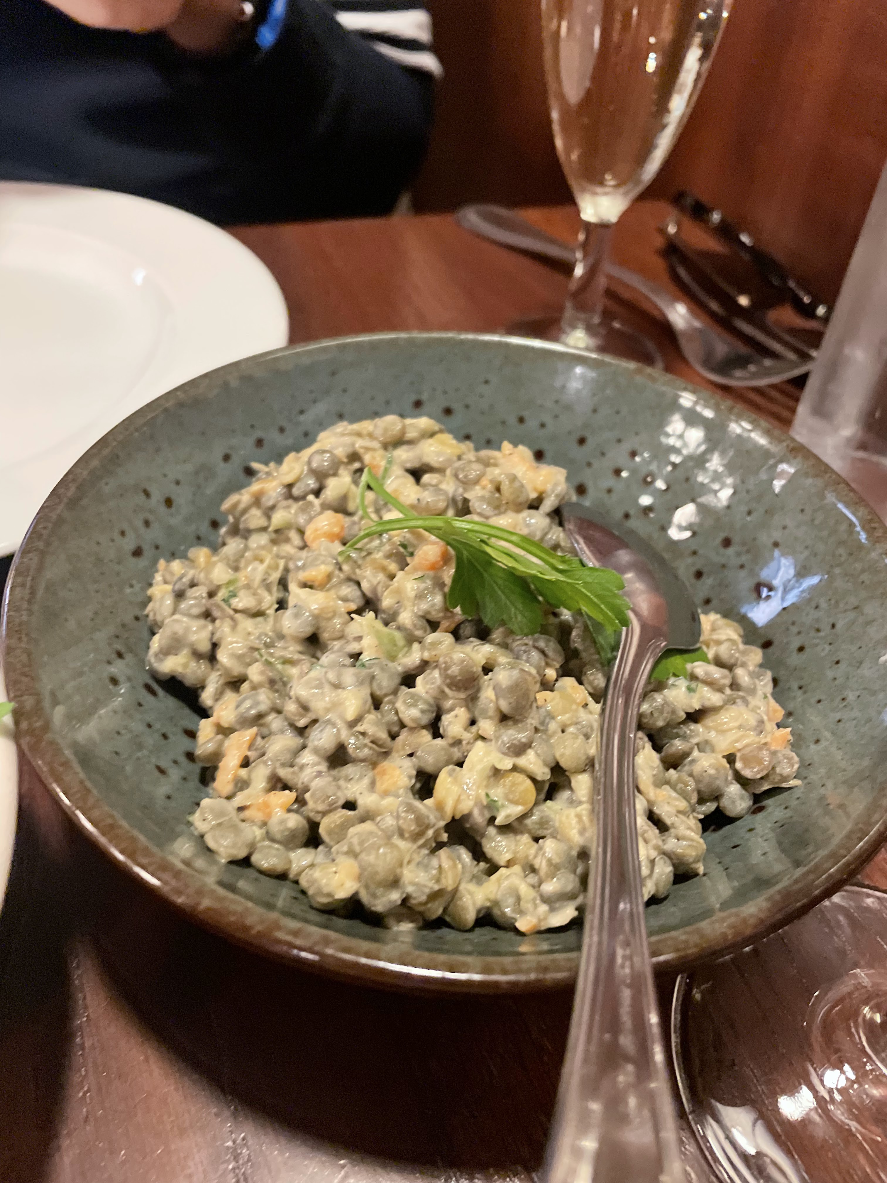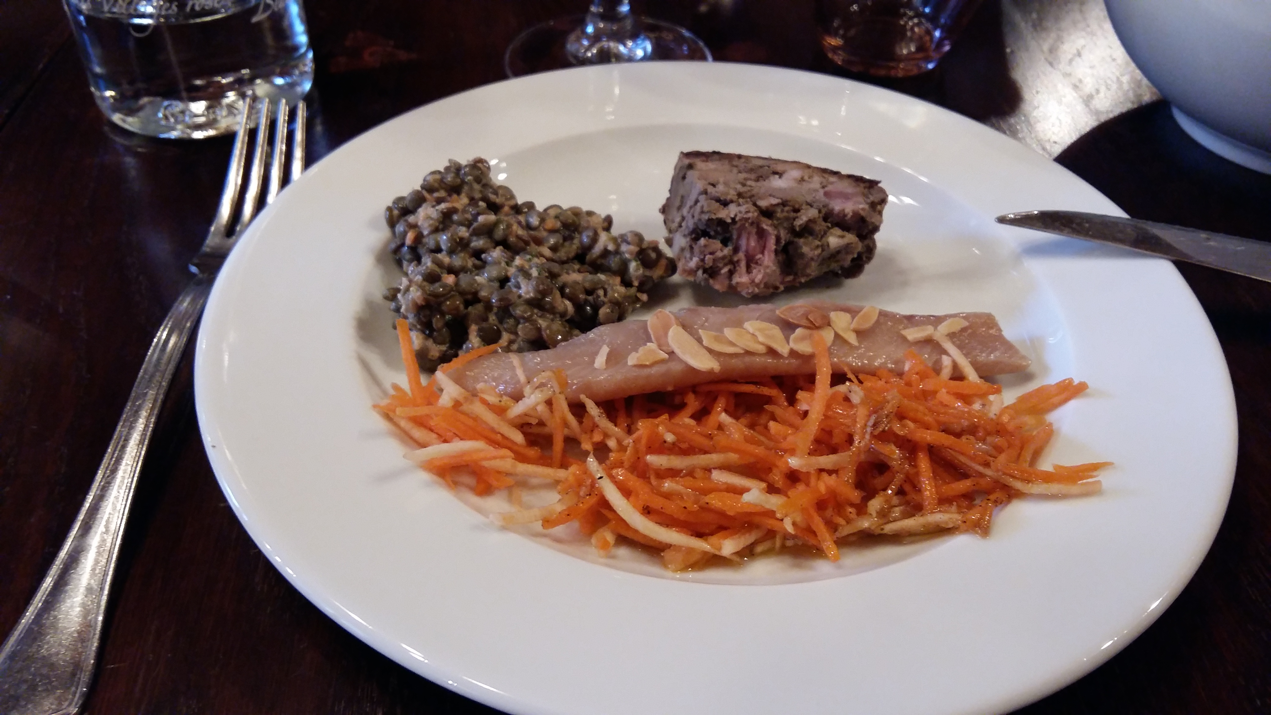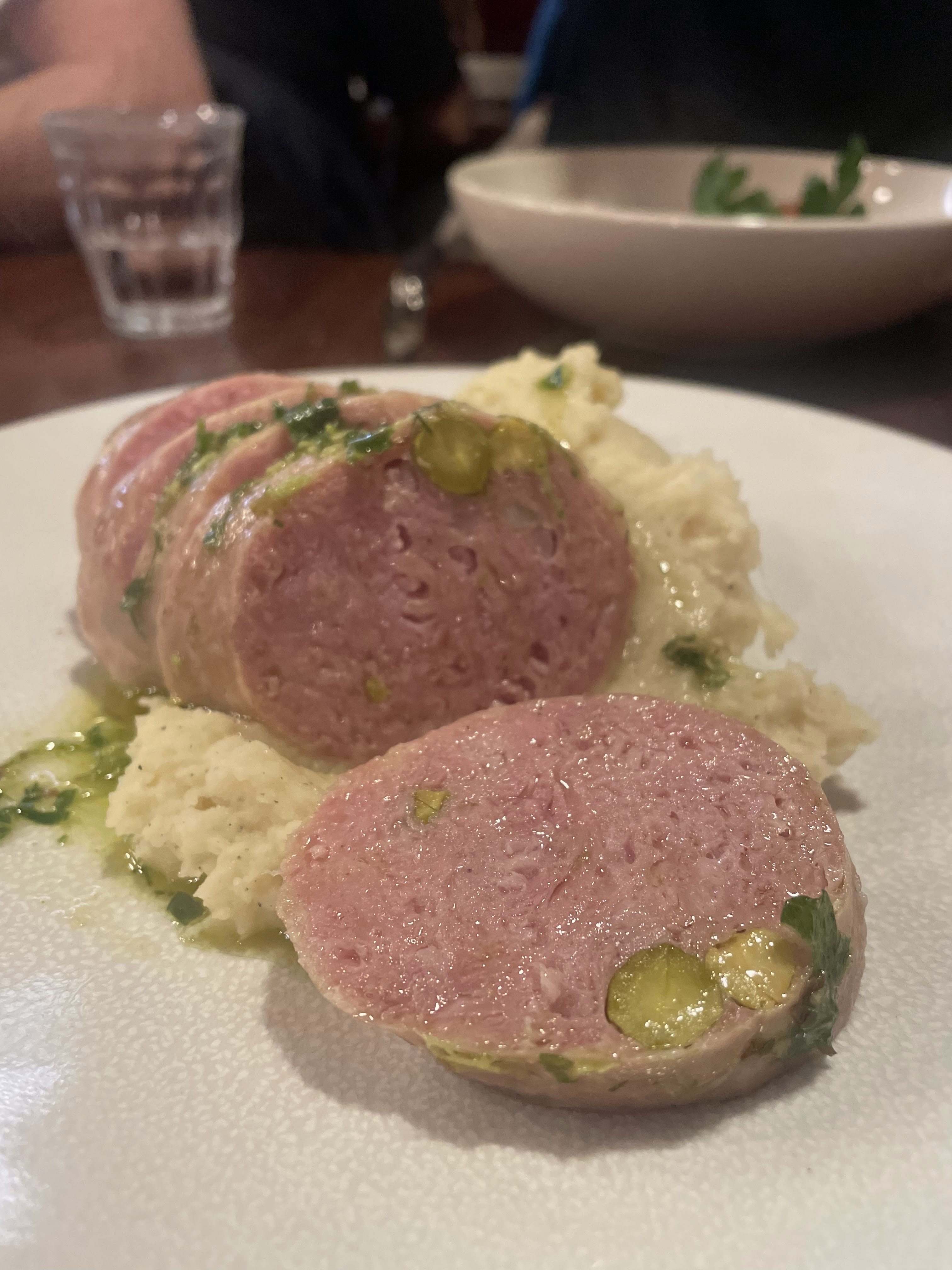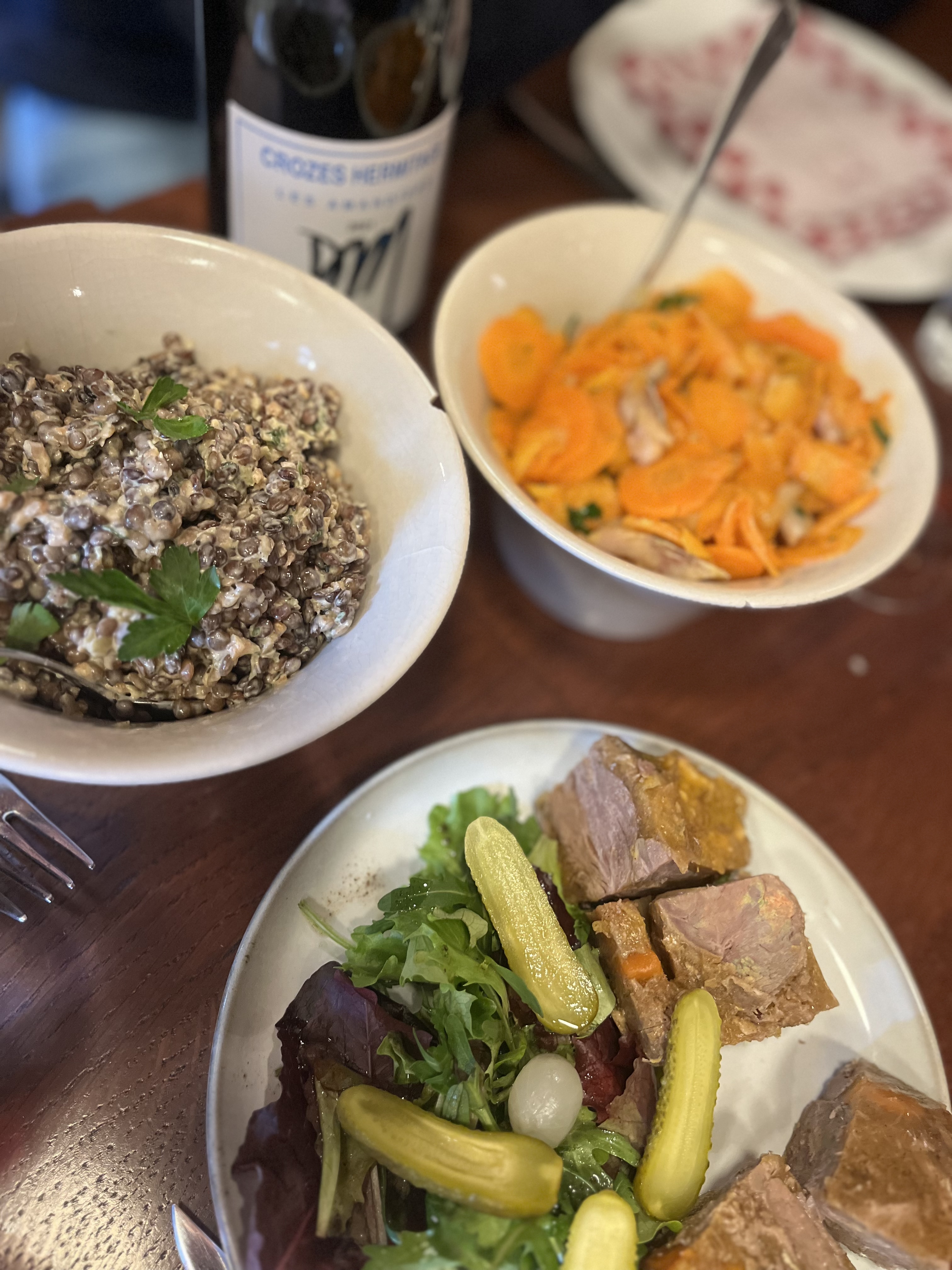 J'ai adoré le brouhaha de type restaurant ici ! Commandez simplement votre plat principal et tout le reste du menu commence à apparaître. Ils ont fait preuve d'une vraie classe avec quelques amuse-bouche, mais ont gardé la table agréablement rustique. Pas de climatisation mais nous l'avons adopté dans le cadre de l'atmosphère trépidante. Excellents choix de vins à des prix faciles à avaler. La nourriture était excellente ! Nous avons adoré les lentilles et le hareng mariné, mais la traditionnelle quenelle n'a pas déçu ! Miam! Assiettes de fromages + desserts immenses à suivre. Ouah.