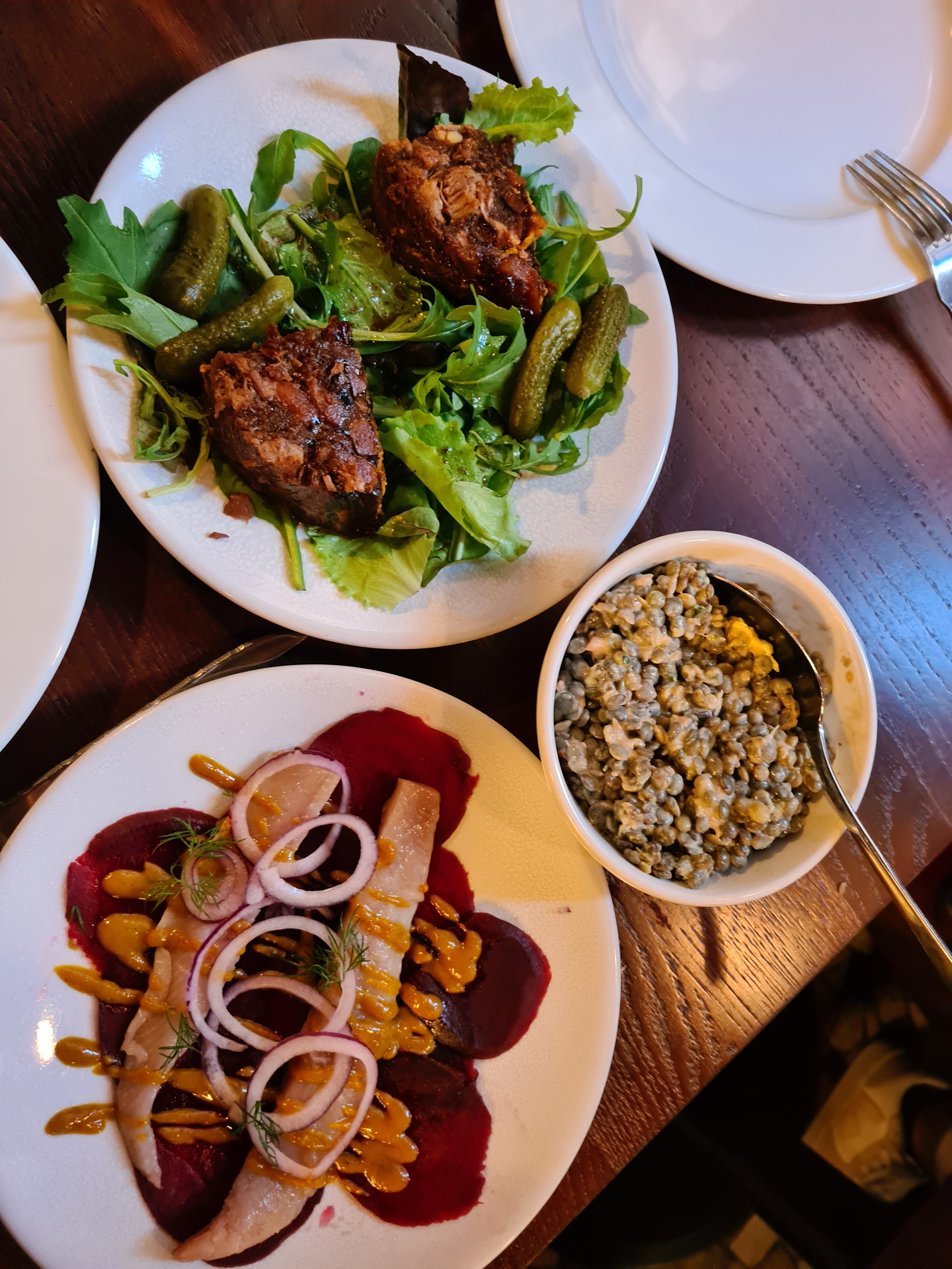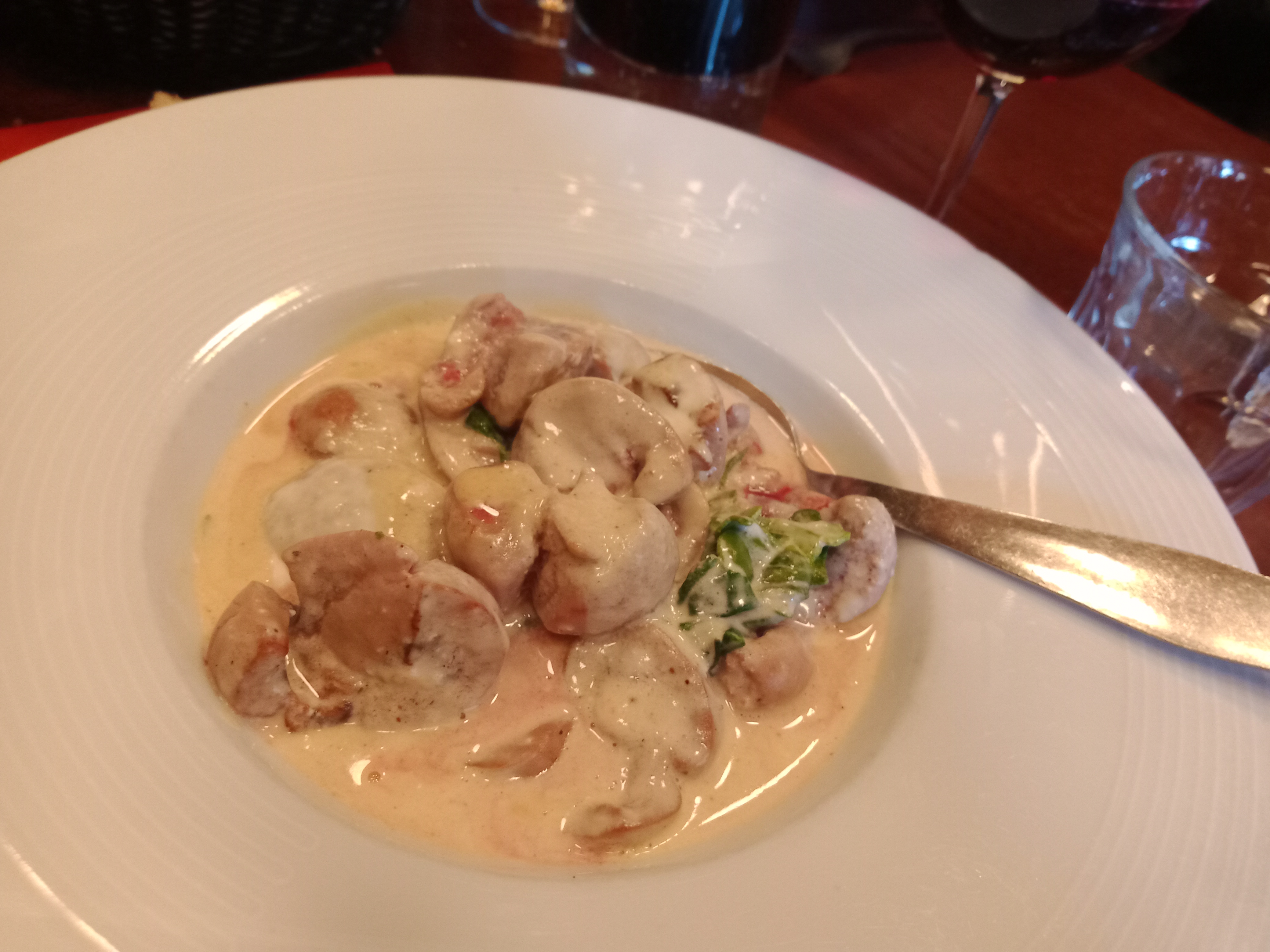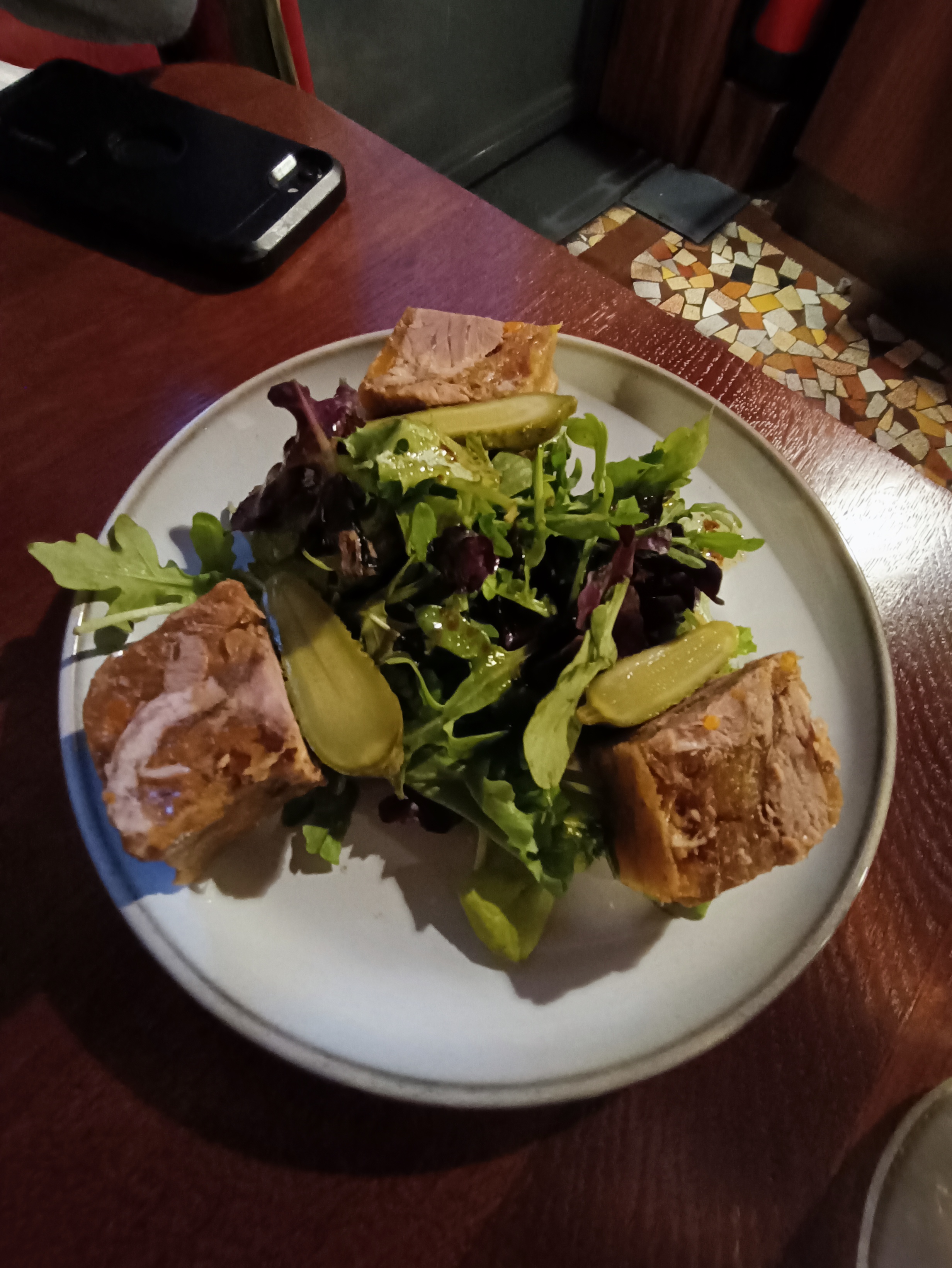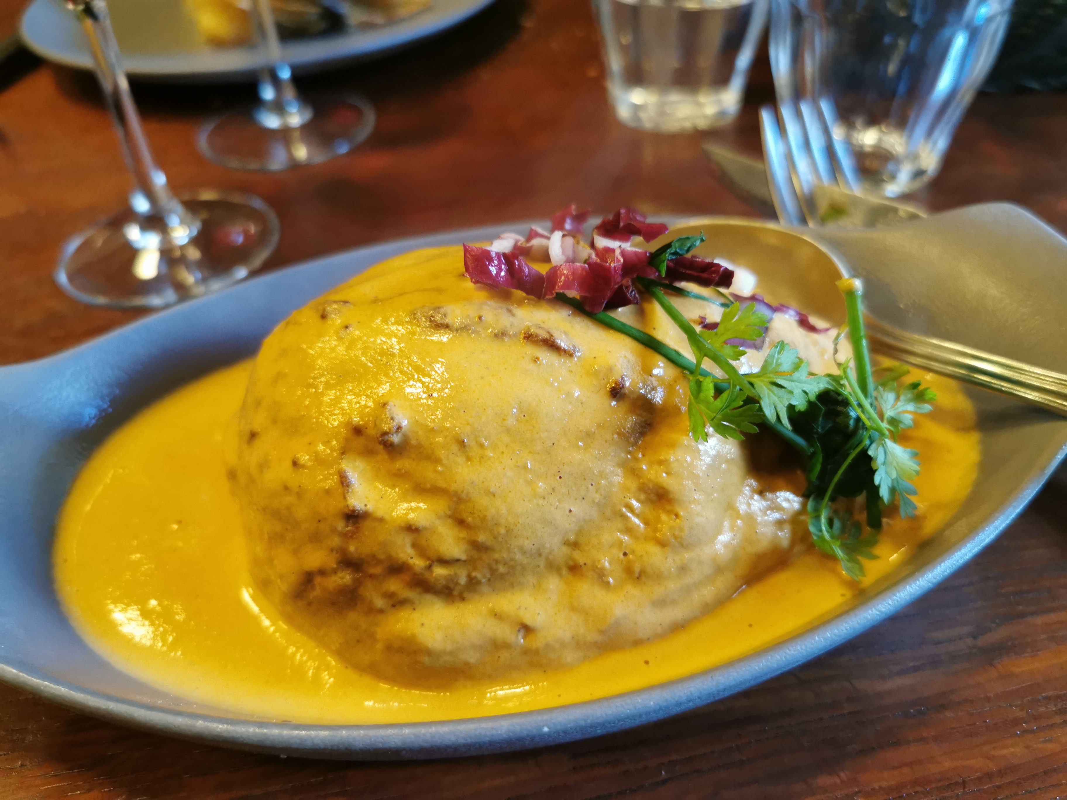 Menu à trois plats avec deux petits bonus pour un prix raisonnable. Ambiance chaleureuse et agréable, personnel serviable et gentil. En entrée, des salades maison du jour ont été préparées. Le plat principal et le dessert étaient au choix. Une friandise salée et du fromage sont des bonus après le plat principal. J'ai choisi les Quenelles comme plat principal.