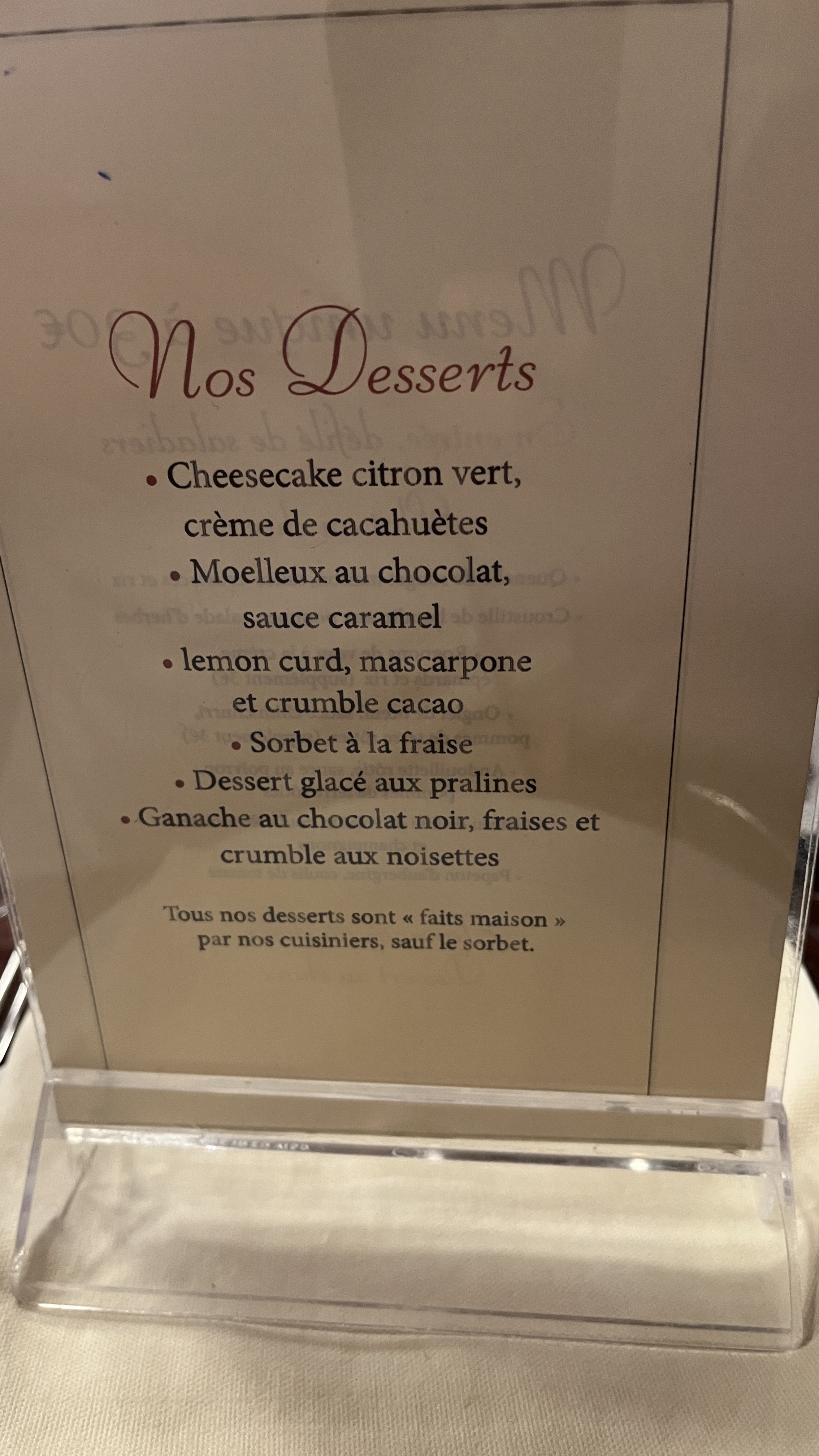 Très bon dîner à un prix abordable. Menu unique avec un bon choix de plats principaux. Service très efficace, et plein d'humour. Notre soirée a été malheureusement très bruyante à cause d'un grand groupe de congressistes... sinon l'évaluation aurait été 5.