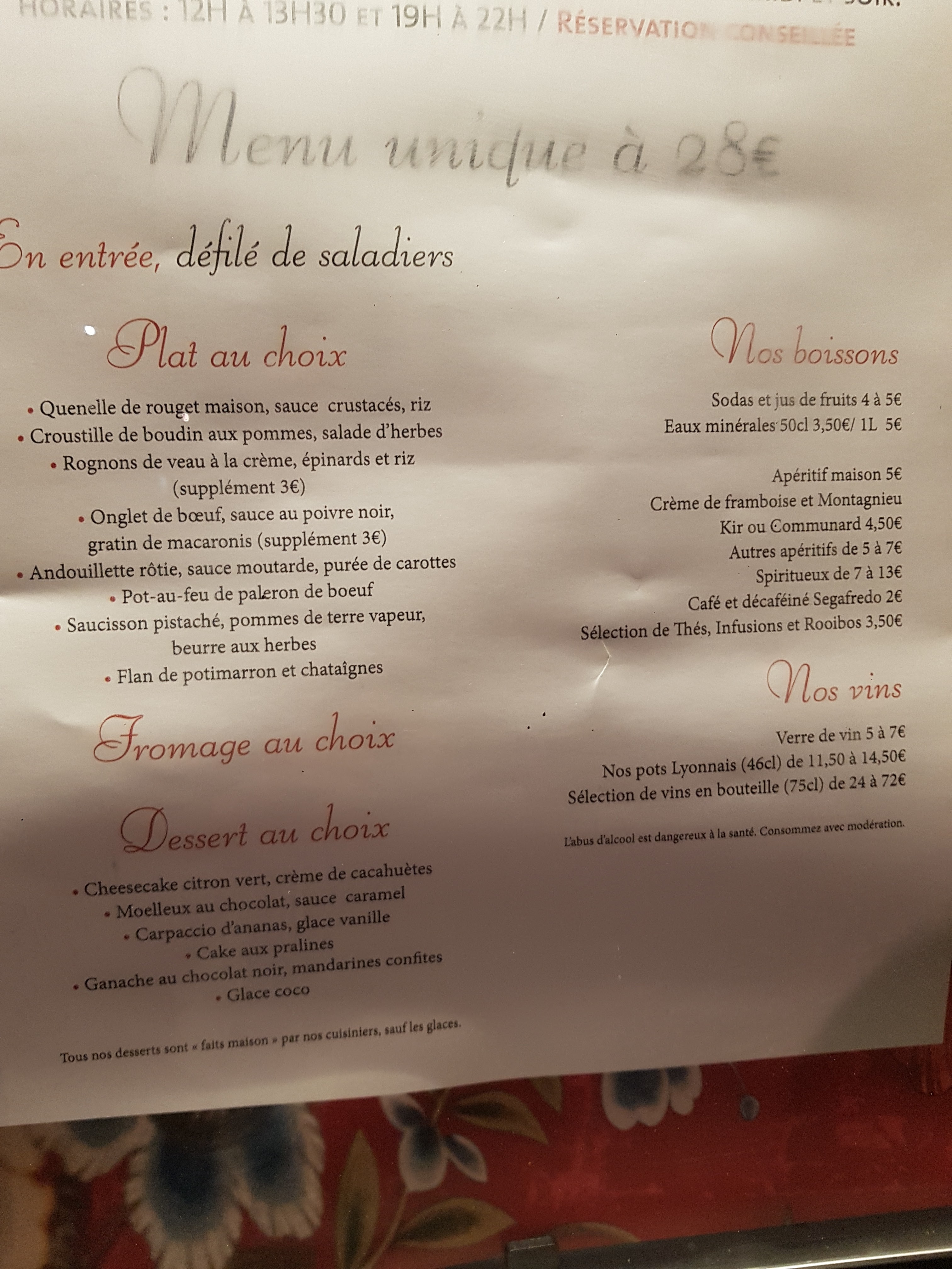Authentique bouchon lyonnais, un lieu chaleureux et un service qui l'est tout autant. Quant aux assiettes, elles sont généreuses et on se régale. Sachez néanmoins qu'un menu unique est proposé, à 28€. Il vaut mieux avoir bien faim ! Les entrées sont imposées mais choix sur les plats, fromages et desserts.