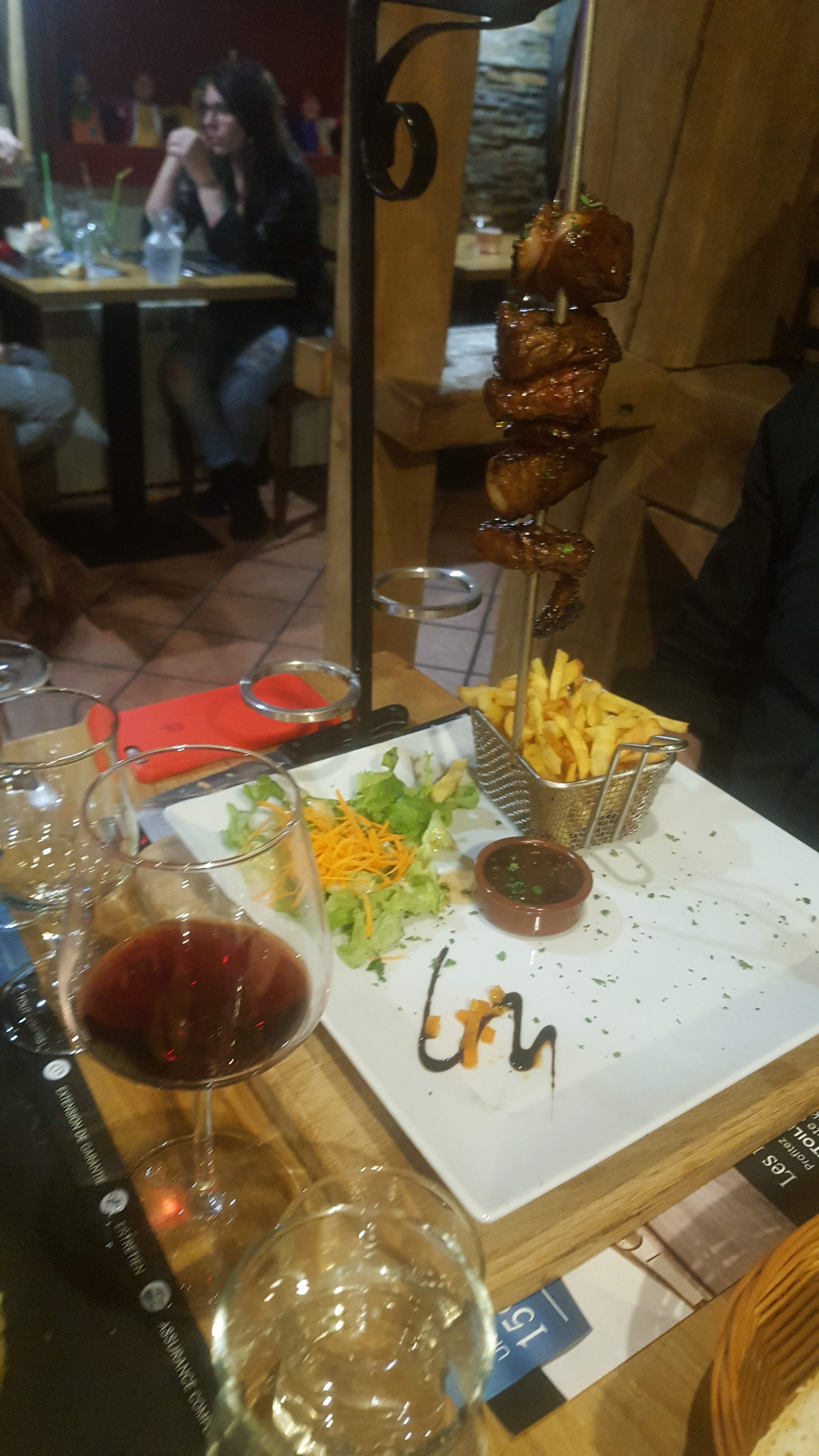 07/2017 : Rien a dire sur le service et sa rapidité. Mais, bière servie chaude, demie oeuf en entrée alors que mentionné oeuf dans le menu, brochette servie bien cuite alors que demandée saignante, vin rouge servie a température ambiante, soit 27 degrés. Les legumes étaient très bien, ainsi que le dessert, la vaisselle est originale. 12/2022 : Bonjour l'avis date de 2017, je suis heureux de savoir que votre carte a changé, j'espère que des nouveaux avis remonteront la note rapidement.