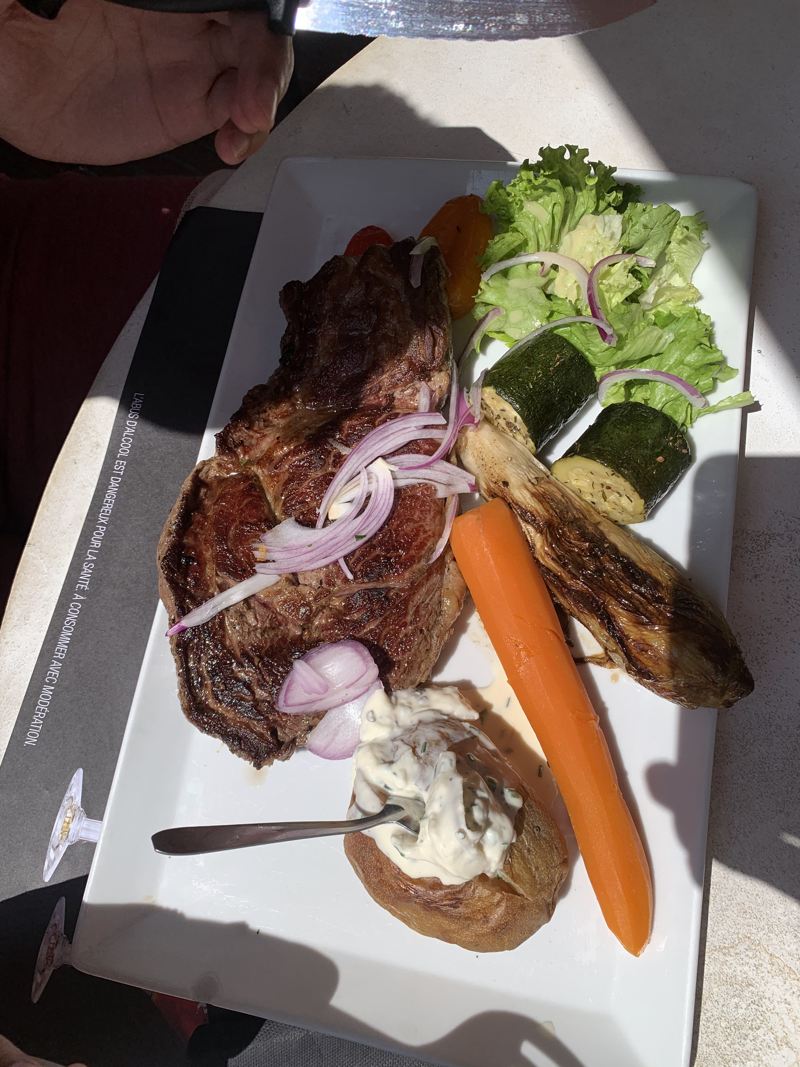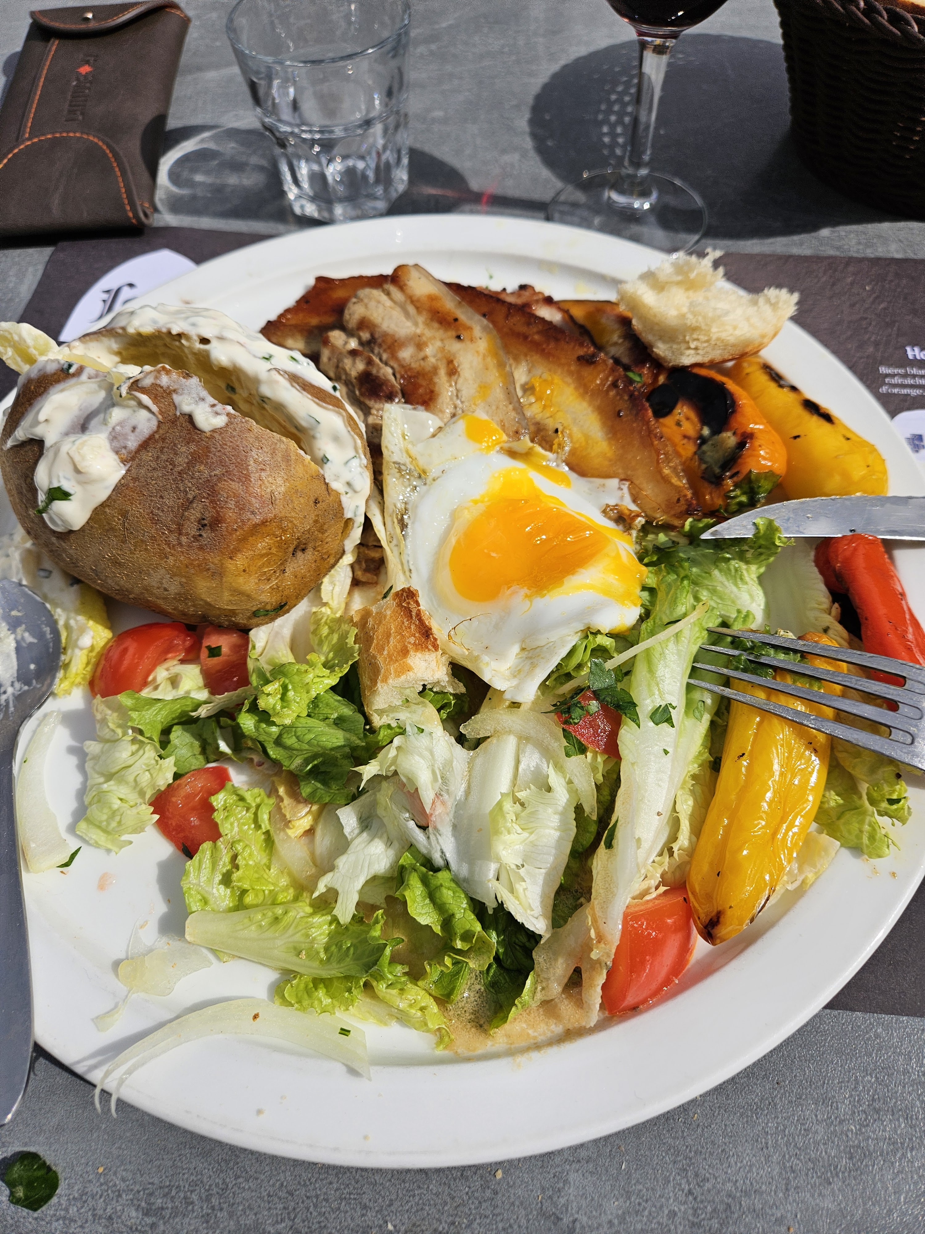 Plusieurs plats indisponibles, jusque là rien de grave. Les plats commandés sont arrivé à moitié chaud, la viande bien mais la patate au four froide !! L’assiette était rempli de différents légumes plus ou moins tiède. Il y avait trop de sauces différentes dans l’assiette : au poivre avec la viande, une autre pour la patate, une autre pour la salade. Ça gâche un peu le plat.