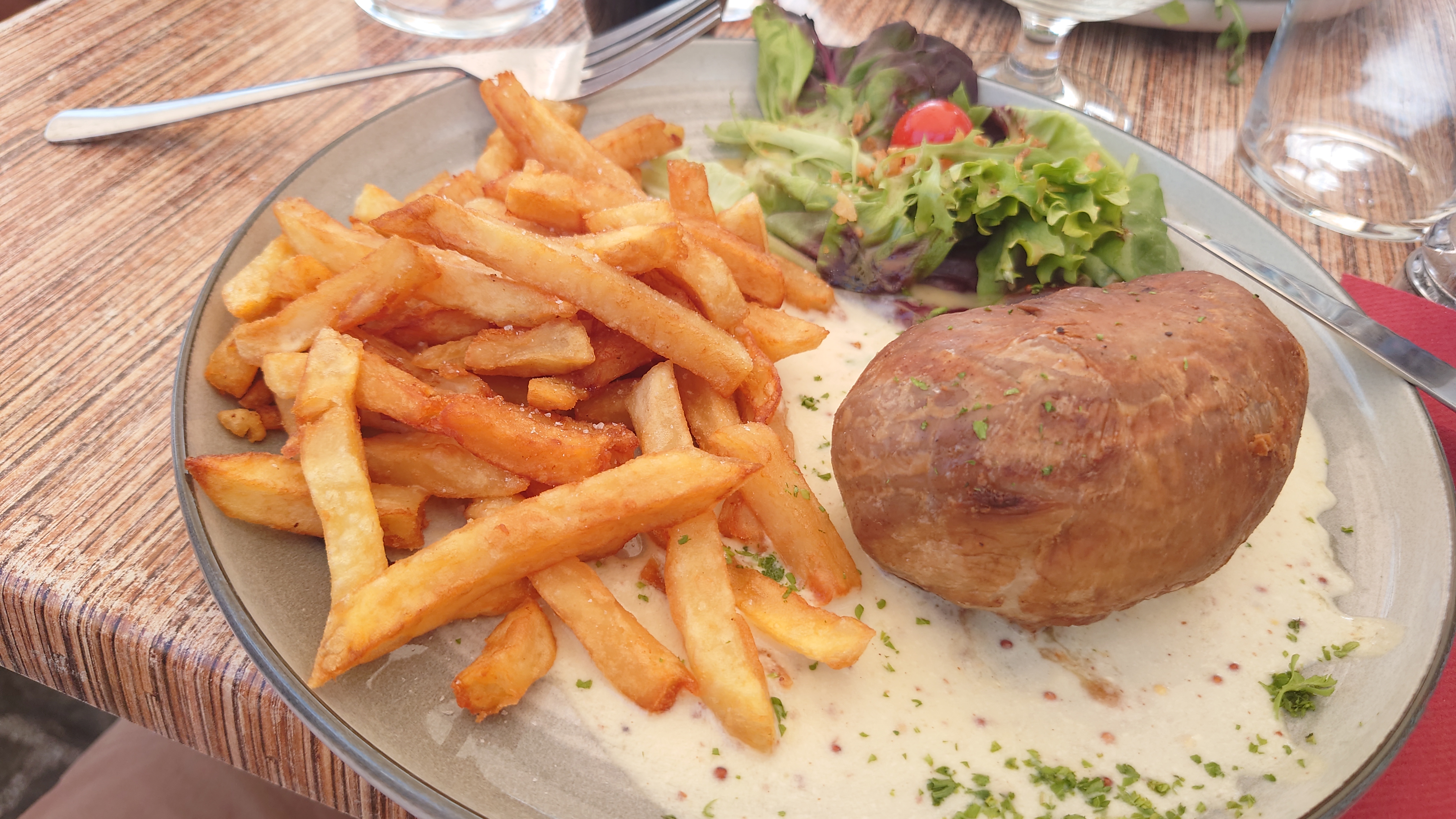 Le service était un peu long mais le plat était très bon, nous étions ravis d'avoir été acceptés vers 15h pour le repas du midi, nous avons pu manger en terrasse avec une jolie vue et dans une rue plutot calme.
