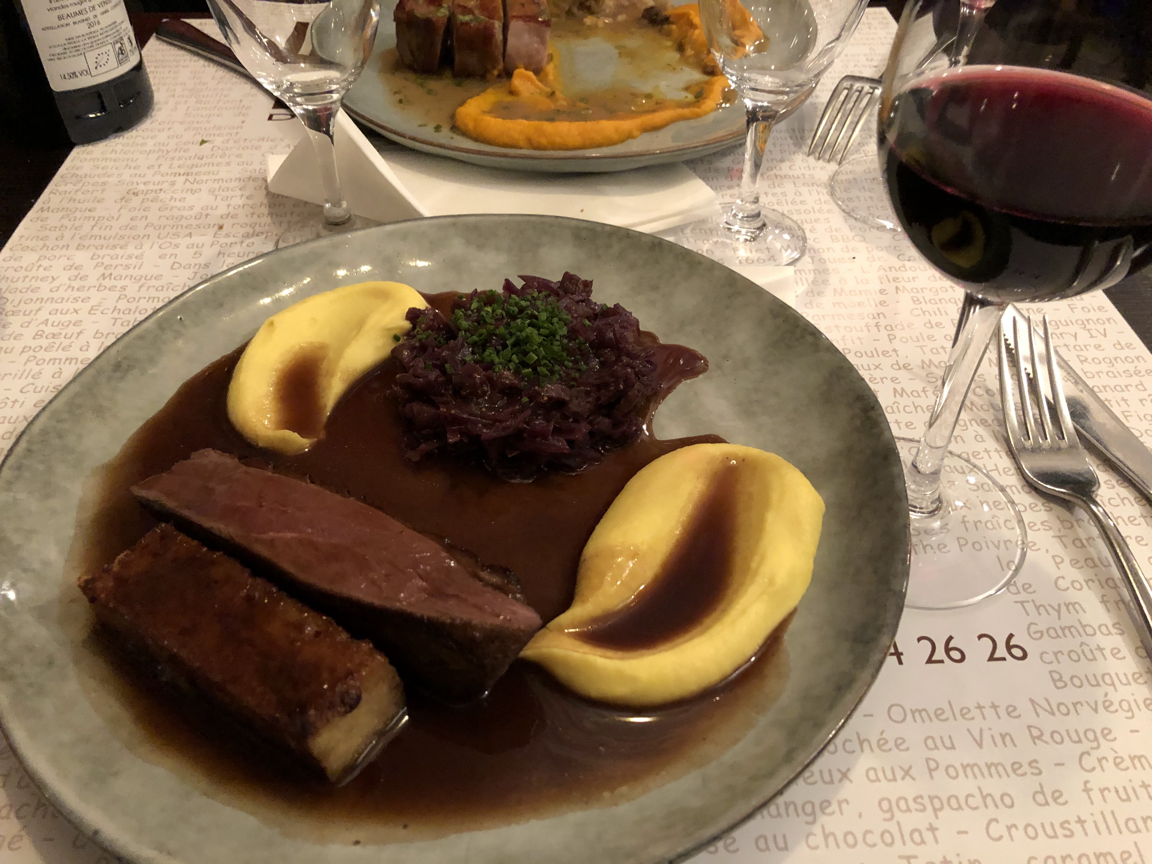 Nous avons été déçue par la qualité de la viande rouge un peu dure que nous avons signalé à la serveuse qui a reconnu qu effectivement nous n étions pas les seules à le constater. Dommage que la patronne ne soit pas venue nous voir et également fait un geste commercial. Ensuite nous avons été surprises de constater que le café sort d une machine Nespresso, pour un établissement comme celui-ci c'est très surprenant. La carte des vins est excessive. Nos entrées étaient bonnes, le croustillant de porc aussi. Les desserts chocolat très bons.