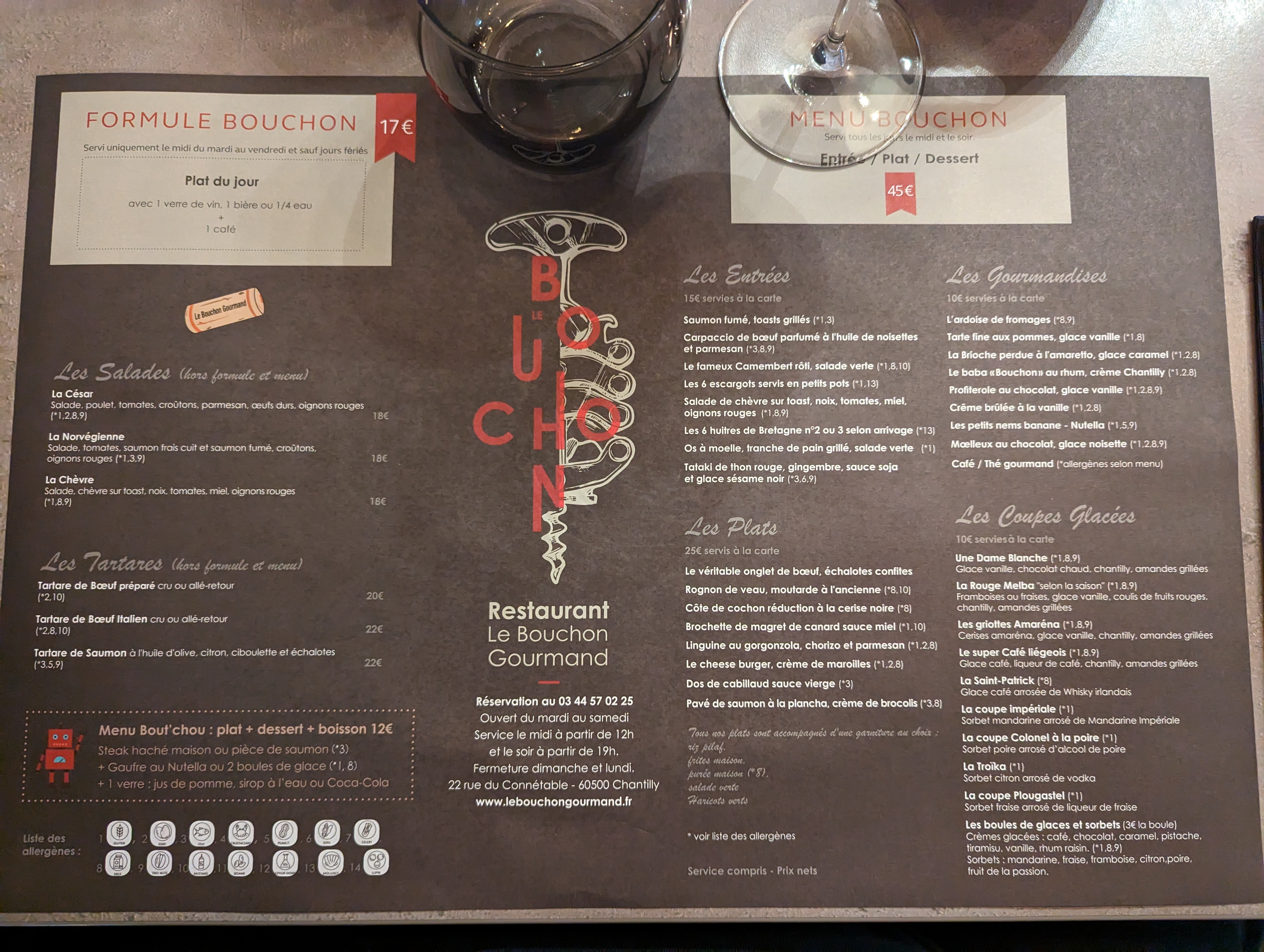 Endroit agréable près du château de Chantilly. Le prix tout à fait abordable et à la hauteur de la qualité. Menu enfant bon et découpage de la carte des menu est très bien pensez avec 4 formules le soir à la carte ou plat entrée ou plat dessert ou plat entrée dessert avec possibilité de prendre des choux dans la carte. Ptit punch très bon. A renouveler
