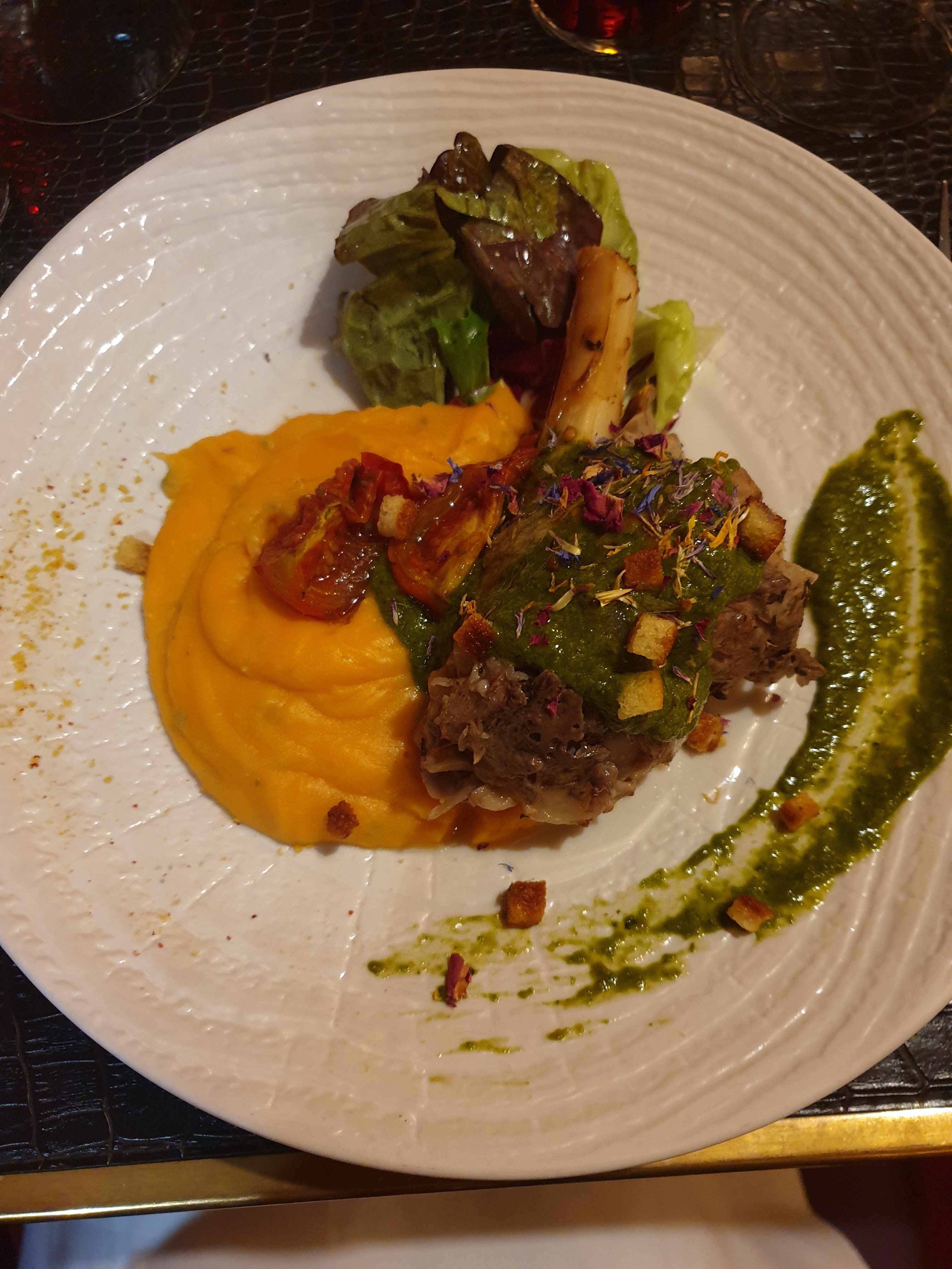 Souris d'agneau trop cuite pas laquée, purée d'accompagnement dessinée dans le fond de l'assiette, le tout avec un assaisonnement sans saveur . Café gourmand bien présenter, correct. Prix 25€ avec un verre de vin.