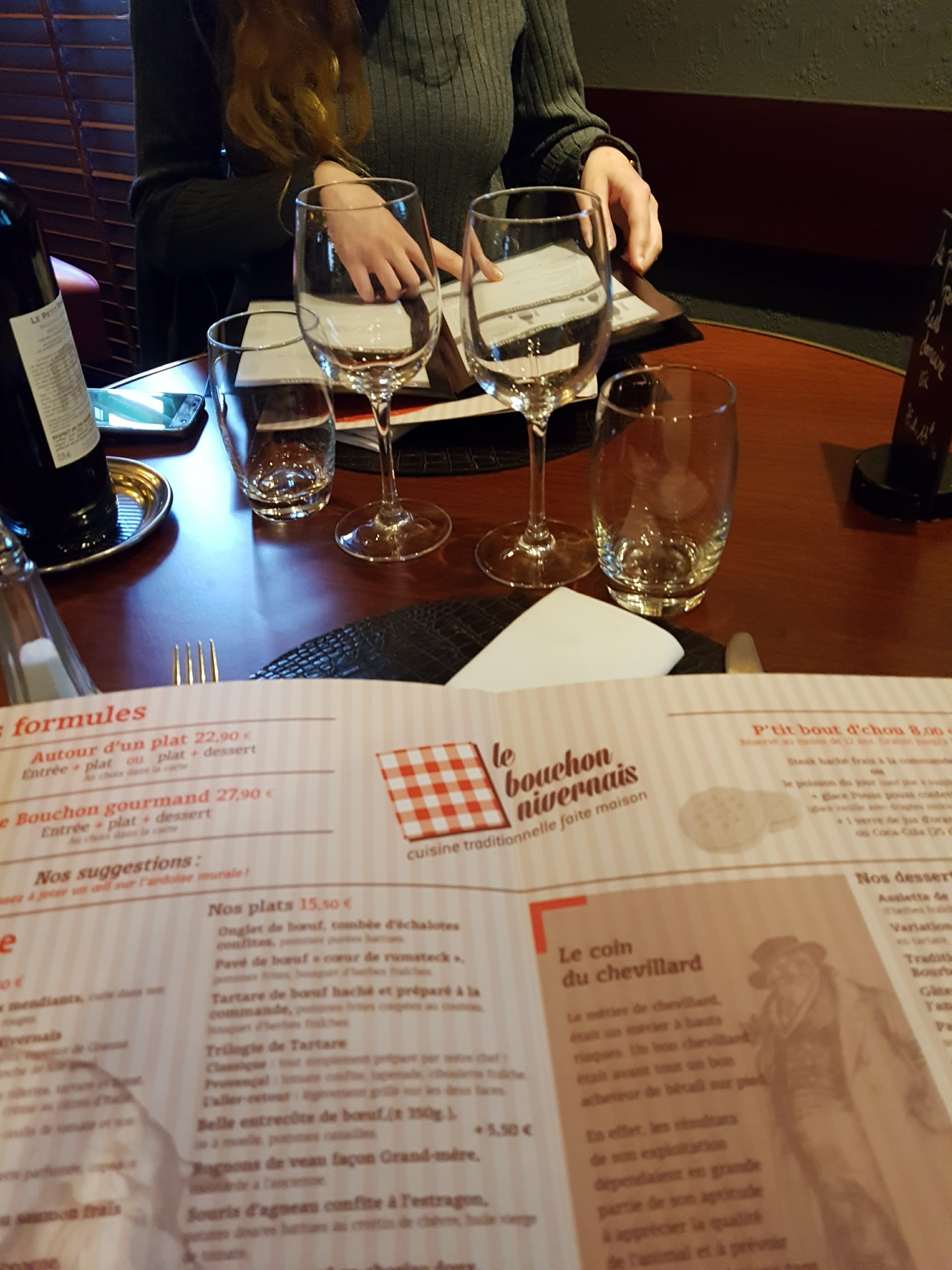 Nous sommes venus dîner en décembre nous réjouissant de goûter les rognons ou encore le carré de veau, manque de chance, il n' y en avait plus, c'est possible .... Nous revenons tenter notre chance hier soir le 22 février, pas de bol, encore plus, selon la serveuse, tout à été mangé le midi...... Donc les clients du soir doivent faire avec ce qui n'a pas été commandé le midi !!!!!! Très bien, nous irons dîner ailleurs, bien que cela nous fasse dépit, nous aimions le cadre et la carte, mais c'était avant.... De plus la quantité de certains plats ( salade du bouchon, et petits encas servis lors de l' apéro) ne sont plus ce qu'ils étaient auparavant, sans compter sur l'attente très très longue, 1h30, alors qu'il n'y avait que 12 clients !!!!! Petite note positive tout de même au serveur avec son attelle qui était très souriant et avenant, d'ailleurs ses 2 collègues féminines ferait bien de s'en inspirer. Enfin bref, le bouchon était mieux avant.