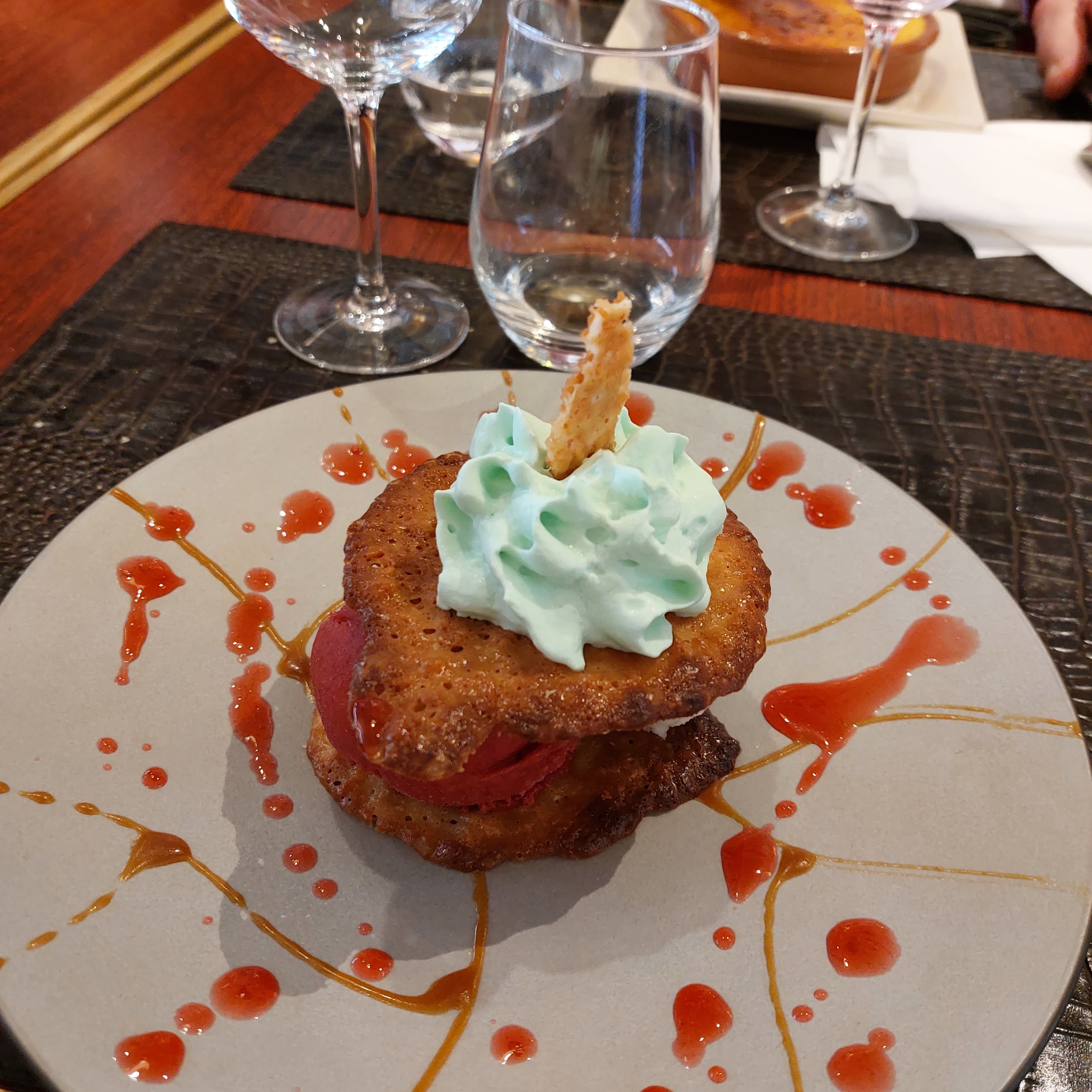 Nous avons passé un excellent moment avec ma.fille Plat: magret de canard un DÉLICE et en dessert crème brûlée et profiteroles super bon également. Copieux, bonne présentation, serveur très aimable et très bon conseil pour le vin Bref.. on a été très contente et on recommande