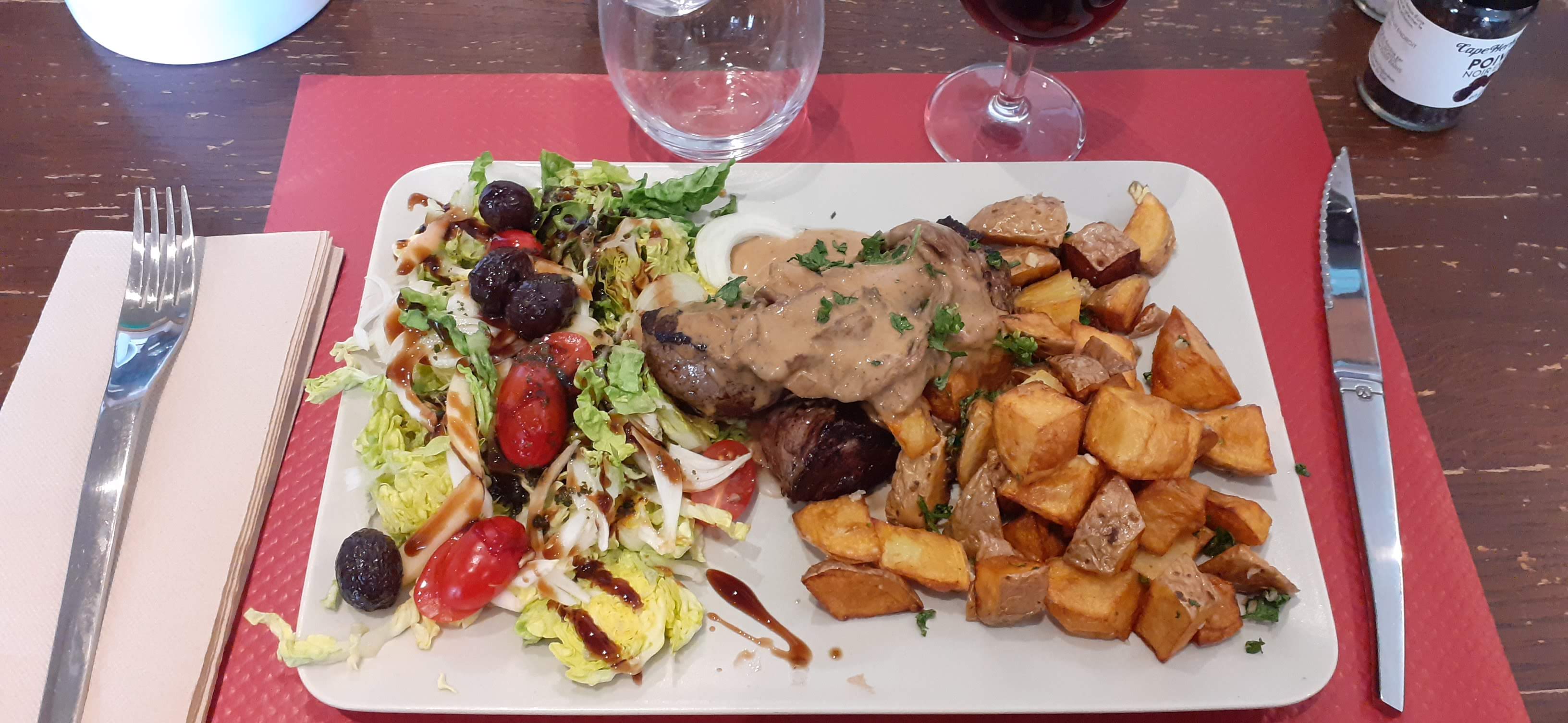 Accueil et lieu sympas, cuisine... Bof... Une carte d ici ou d ailleurs mais rien de local. Pavé de boeuf, magret, souris d agneau, rien de vraiment cuisiné, une sauce aux cèpes proposée dans presque toutes les viandes et les mêmes accompagnements pour tous les plats dont des courgettes (en avril)...assez déçue par la carte. Bref très bof.