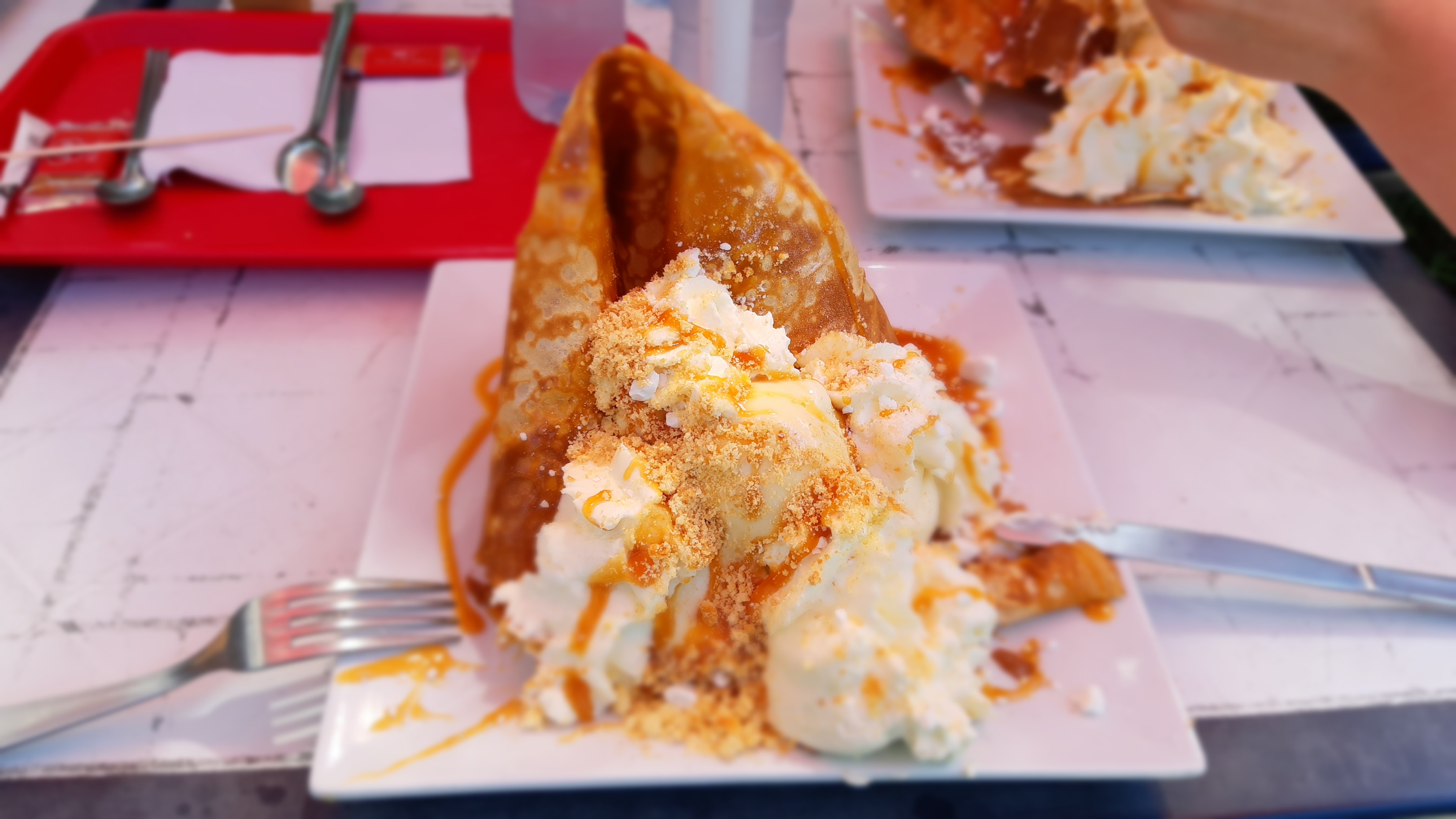 Crêperie généreuse et gourmande, une belle carte et un emplacement idéal proche de la mer. En photo la crêpe Adam et Ève : une crêpe craquante, 3boules de glace, des pommes caramélisées, du caramel et de la chantilly.