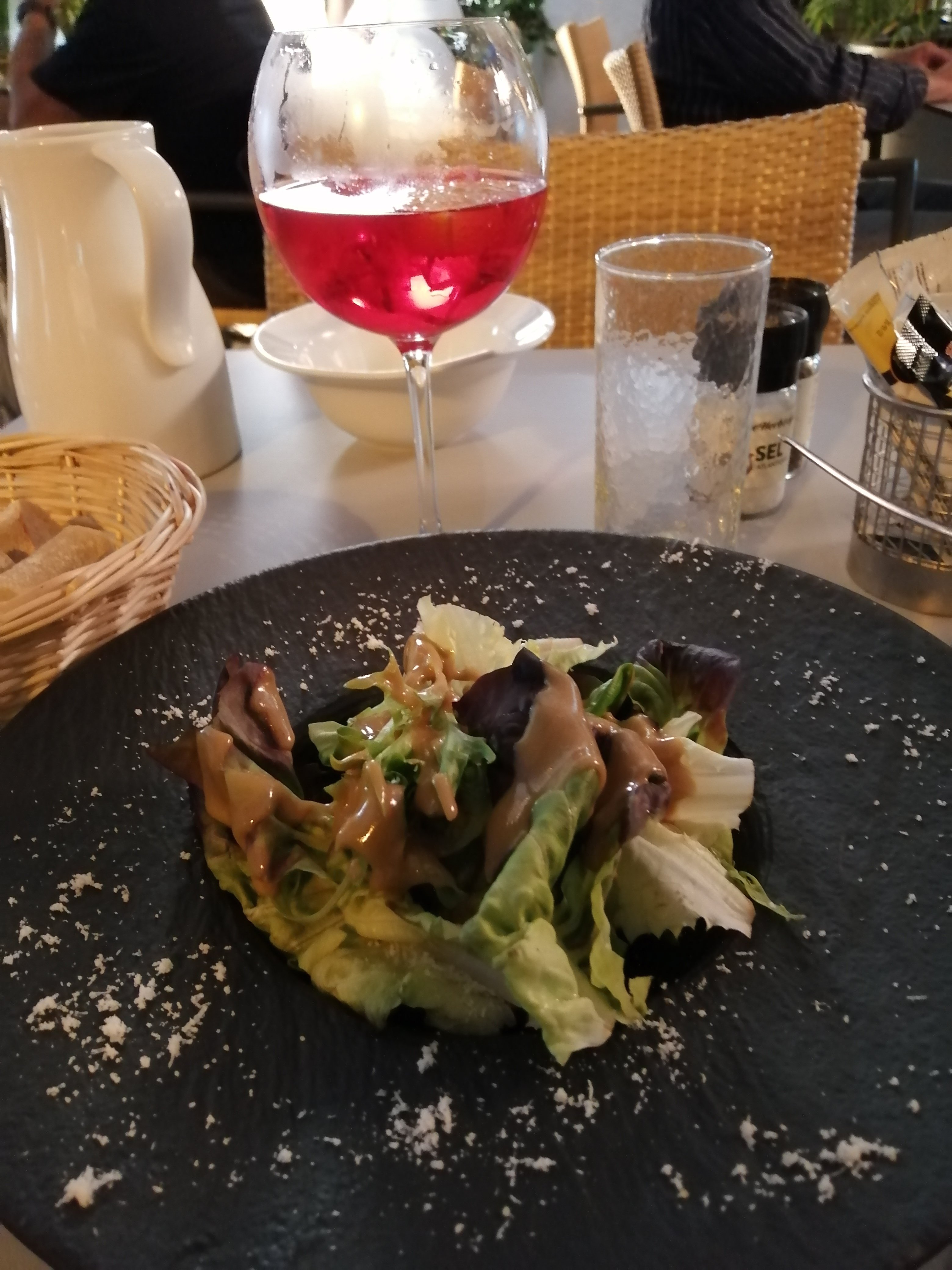 Restaurant décevant. Il n'y avait pas assez de pain pour tout le monde. A la place, nous avons eu droit à du pain de mie industriel, sans aucune excuse. C'est la première fois que je vois cela. La carte des boissons est excessivement chère. Comptez 7€ pour un cappuccino et la carafe d' eau est payante. Salade correcte mais peu garnie.. Le service était plutôt souriant mais les serveurs étaient mal organisés.