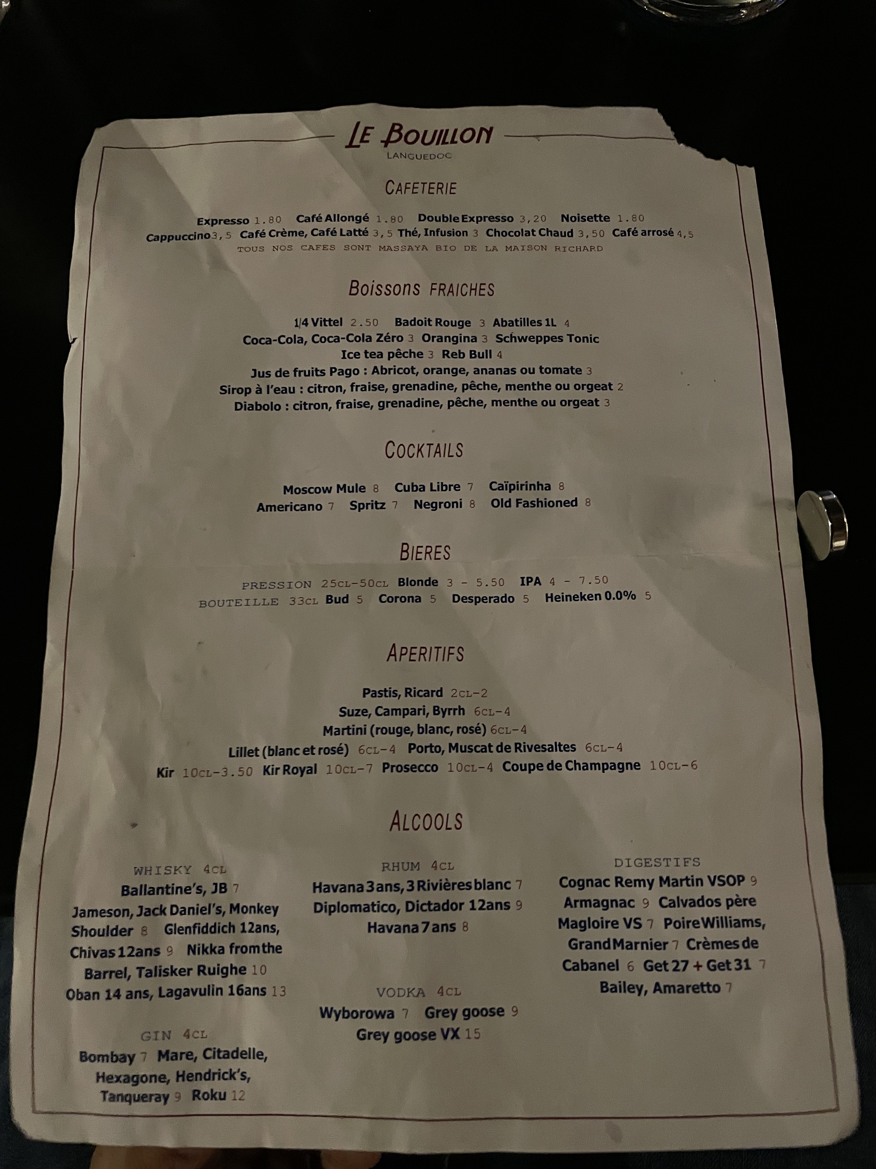 Super soirée! Un très bon rapport qualité/prix et bon vivre. Merci au bouillon Languedoc pour l’accueil !