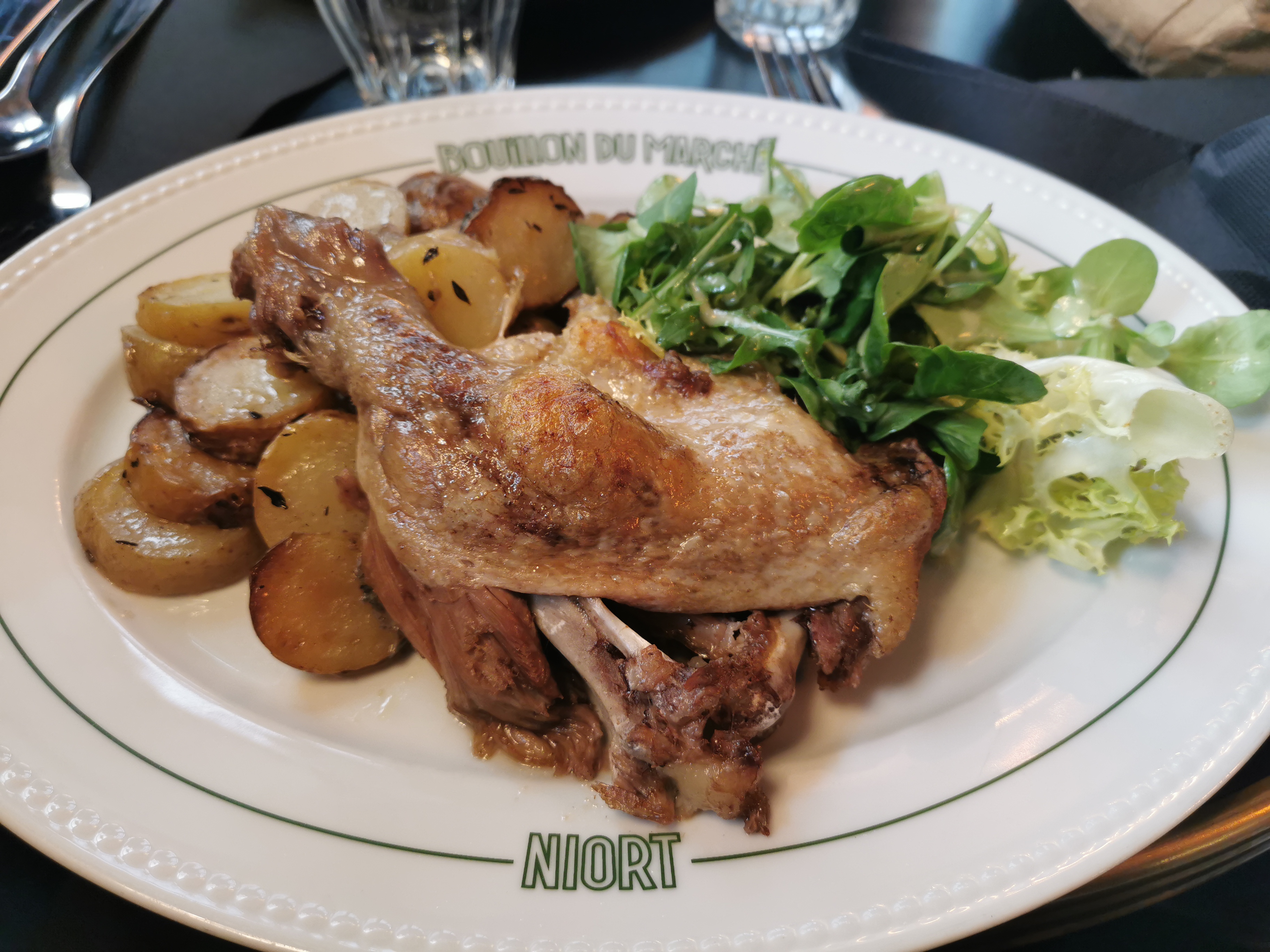 Lieu très sympa autant à l'intérieur qu'à l'extérieur ainsi que l'environnement face au vieux marché et au donjon, c'est top ! La cuisine plutôt traditionnelle française, ce qui est génial car ça manque cruellement aujourd'hui !!! En plus c'était délicieux et pas excessif Le porc à l'os vraiment excellent Enfin le personnel très accueillant et gentil rien à dire Pour une première visite à Niort c'était super ! Seul les tarifs avec les plats et les menus ne sont pas claires. Je recommande vivement :)