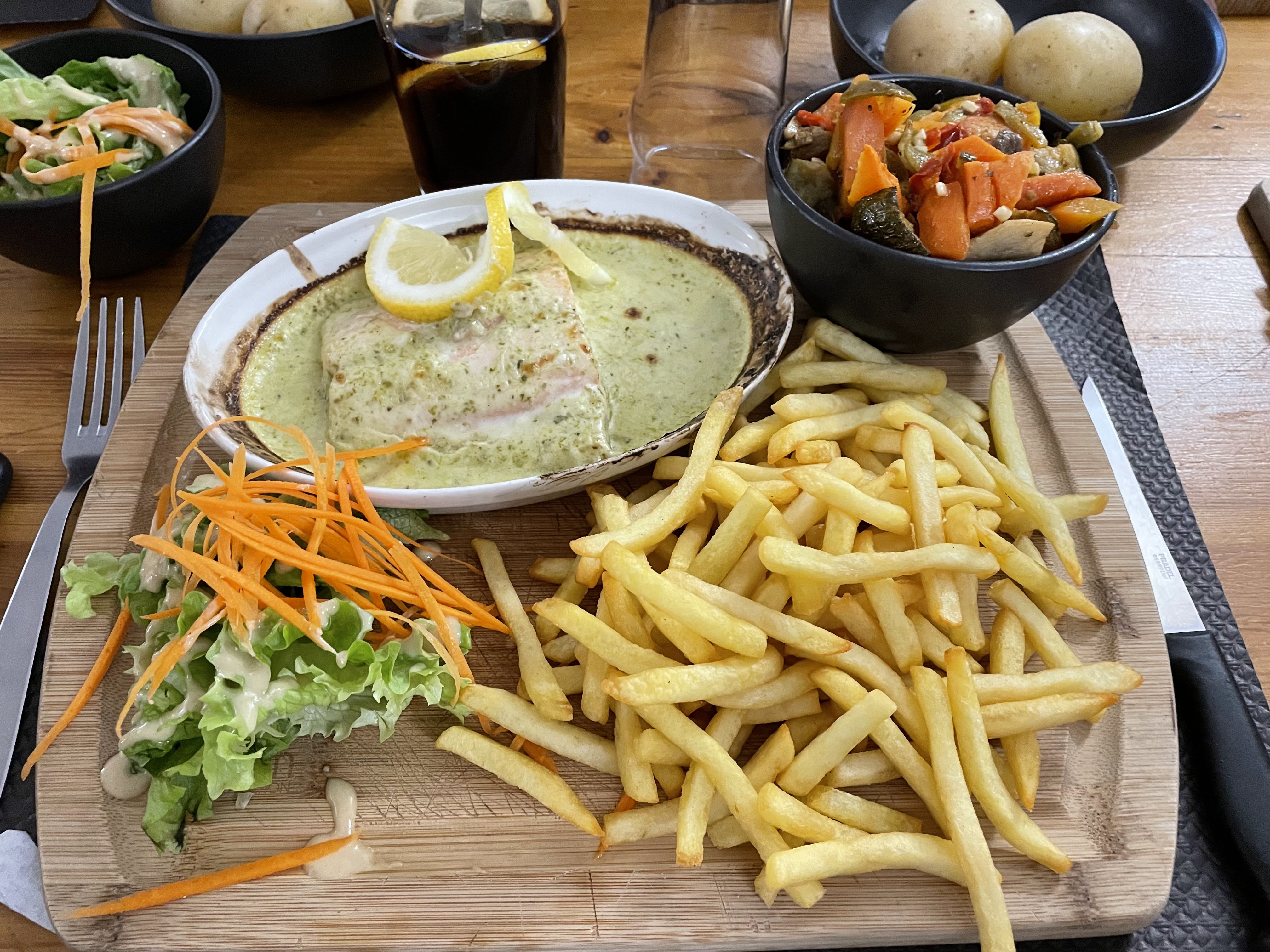 Repas très copieux et délicieux, le patron super cool un peu bavard ( ce qui je trouve apporte une complicité client, cuisinier ( patron) ). Il m'a personnellement donner des astuces pour être cuisinière et ma même racontait son parcours professionnel qui été très enrichissante pour mon futur.