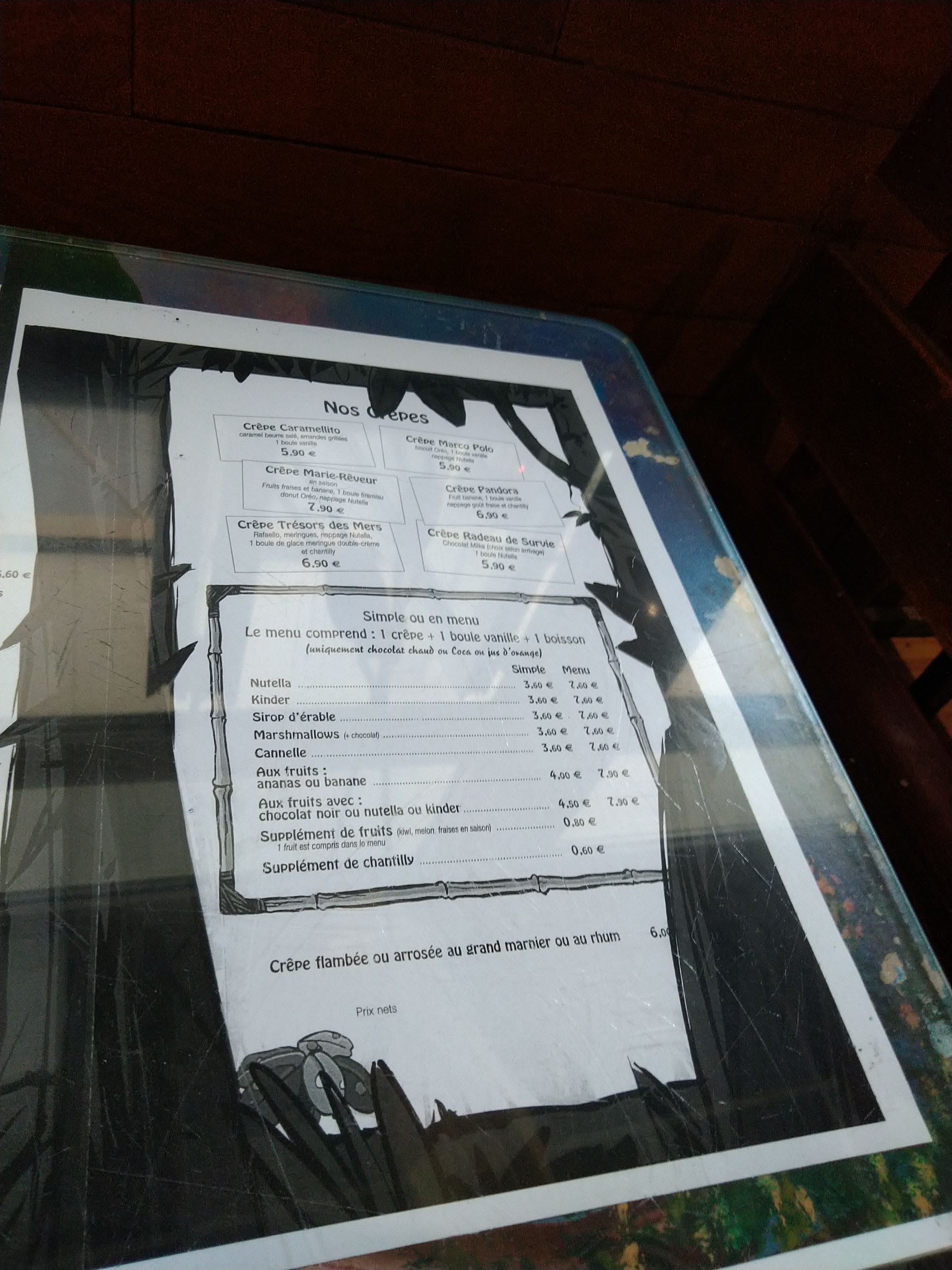 Crêpes délicieuse. Serveuse sympa. La déco superbe bateau pirate. Dommage on n'a pas pu en profiter les chiens ne sont pas acceptés à l'intérieur nous sommes donc restés en terrasse