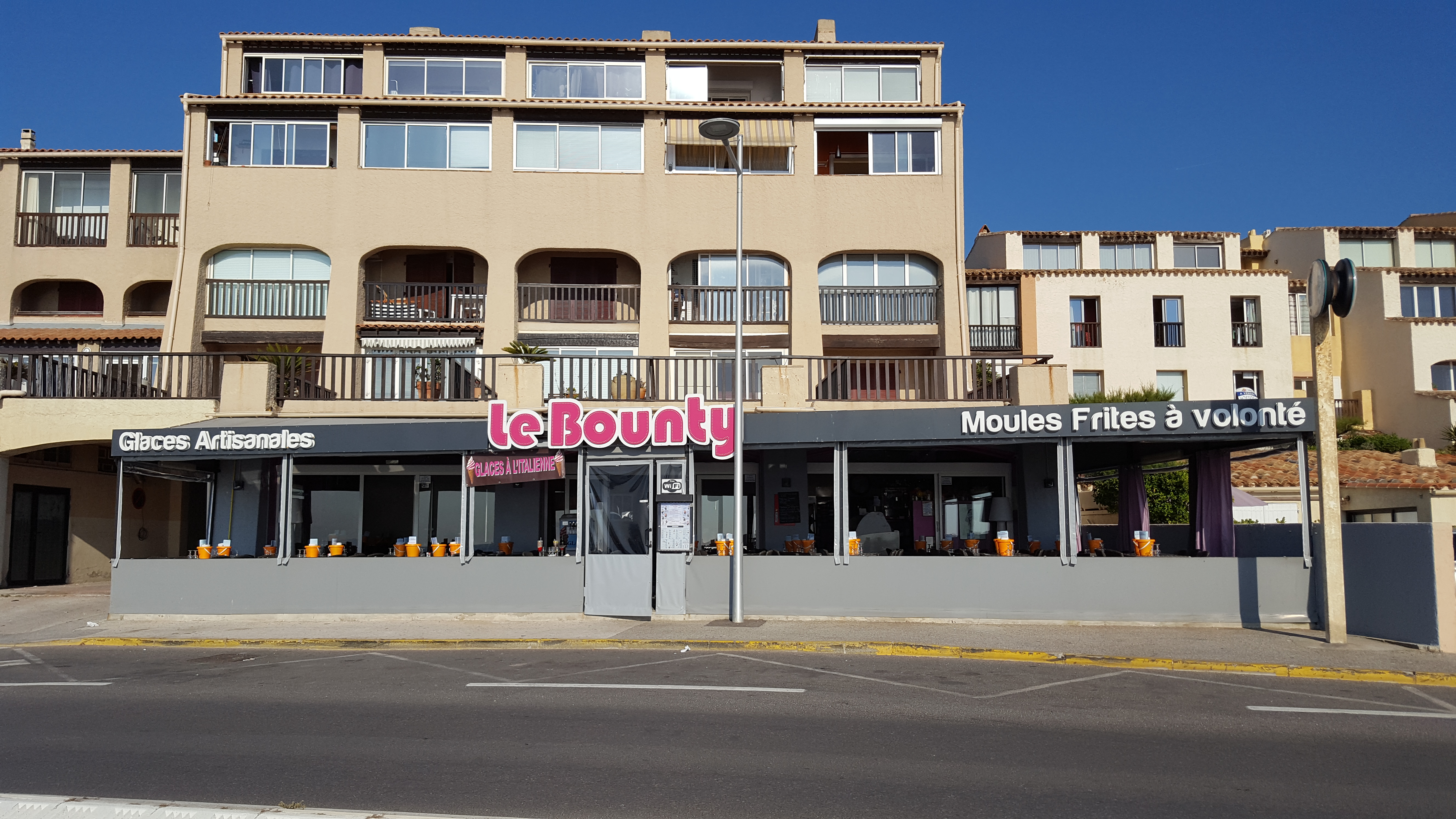 moules à volonté… assiette enfant amplement généreuse…personnel au top! spécial dédicace à la charmante femme qui a servi Cloé chaque soir tardivement pour les glaces café/framboise et pistache /nougat et devrait nous reconnaître du coup… le jeune homme tatoué est quand à lui tout aussi gentil… un grand merci pour ce soir du 15 août…bonne suite à toute l’équipe du Bounty!!!!