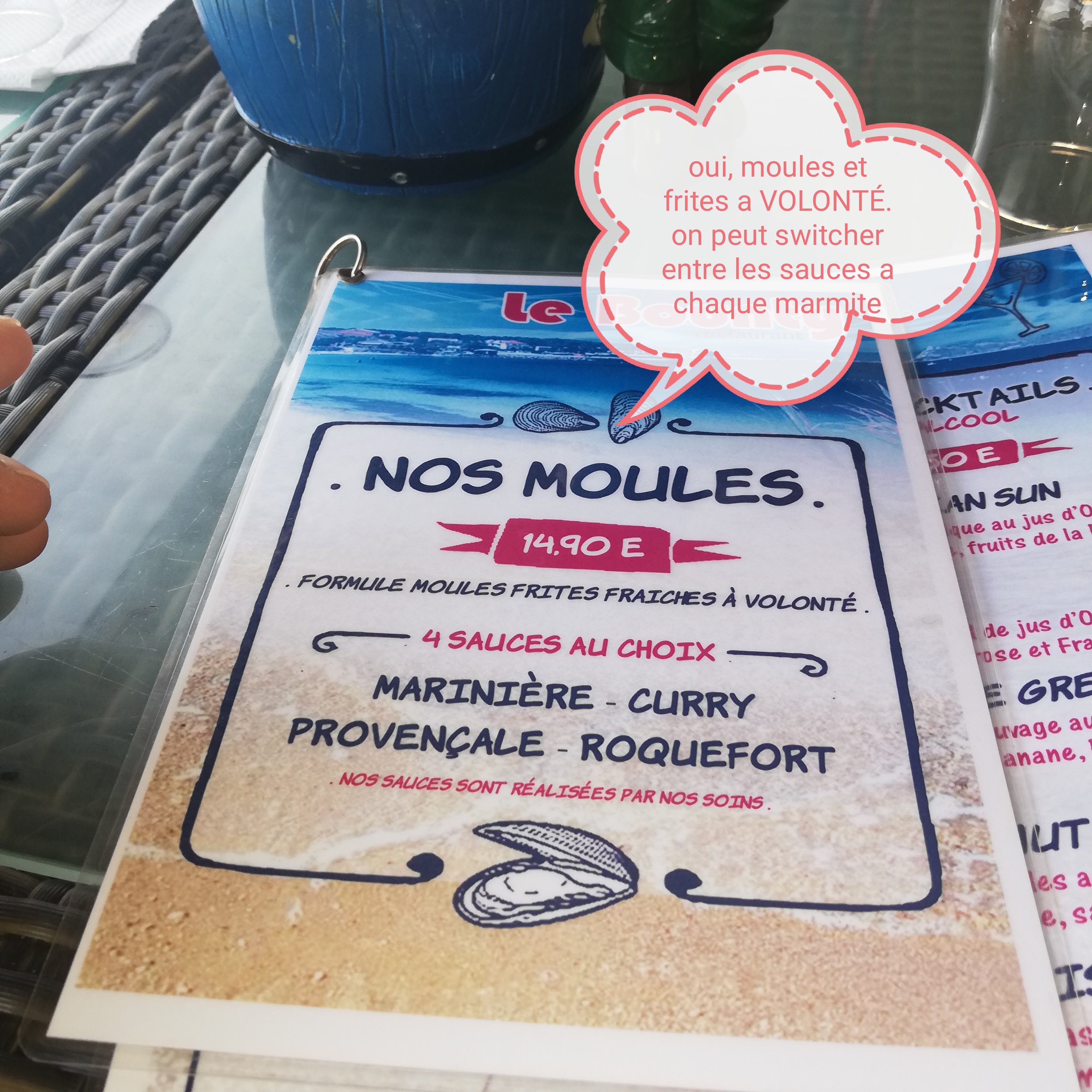 Points positifs : serveuses souriantes et disponibles, concept moules frites à volonté , jolis et bons cocktails et surtout emplacement permettant d aller manger entre deux baignades. Points negatifs: coriandre dans les moules marinières, tenders hyper épicés dans menu enfants, mauvaise fois du responsable qui ne nous accorde pas la réservation en bordure de terrasse alors que durant tous notre repas plusieurs tables restent libres. Peut être avons nous été jugés faire mauvaise vitrine 🤨😄😄