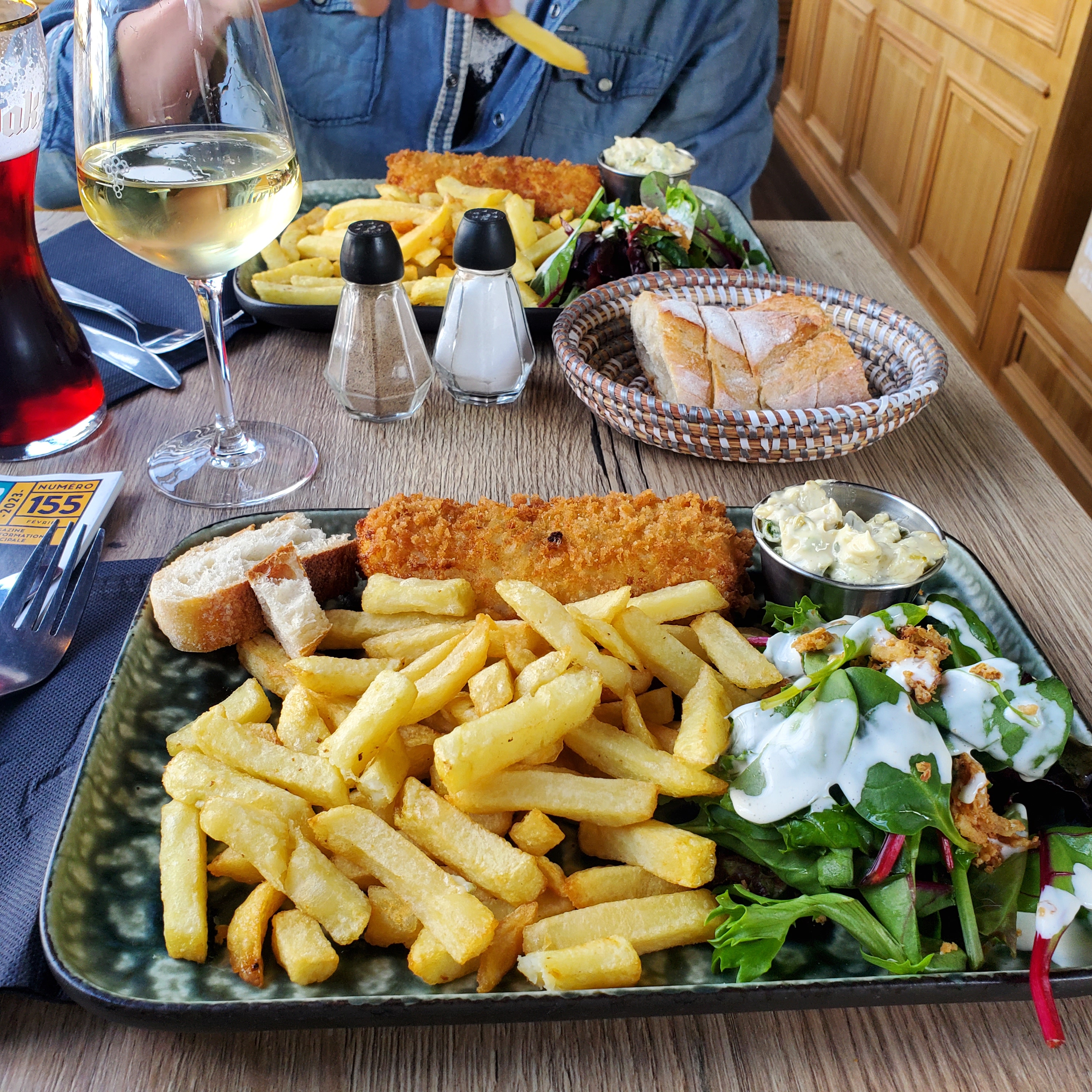Situé place du marché choisi fish and chips toit fait maison sauce tartare maison excellente..et ma chienne a été acceptée avec nonoss et eau..