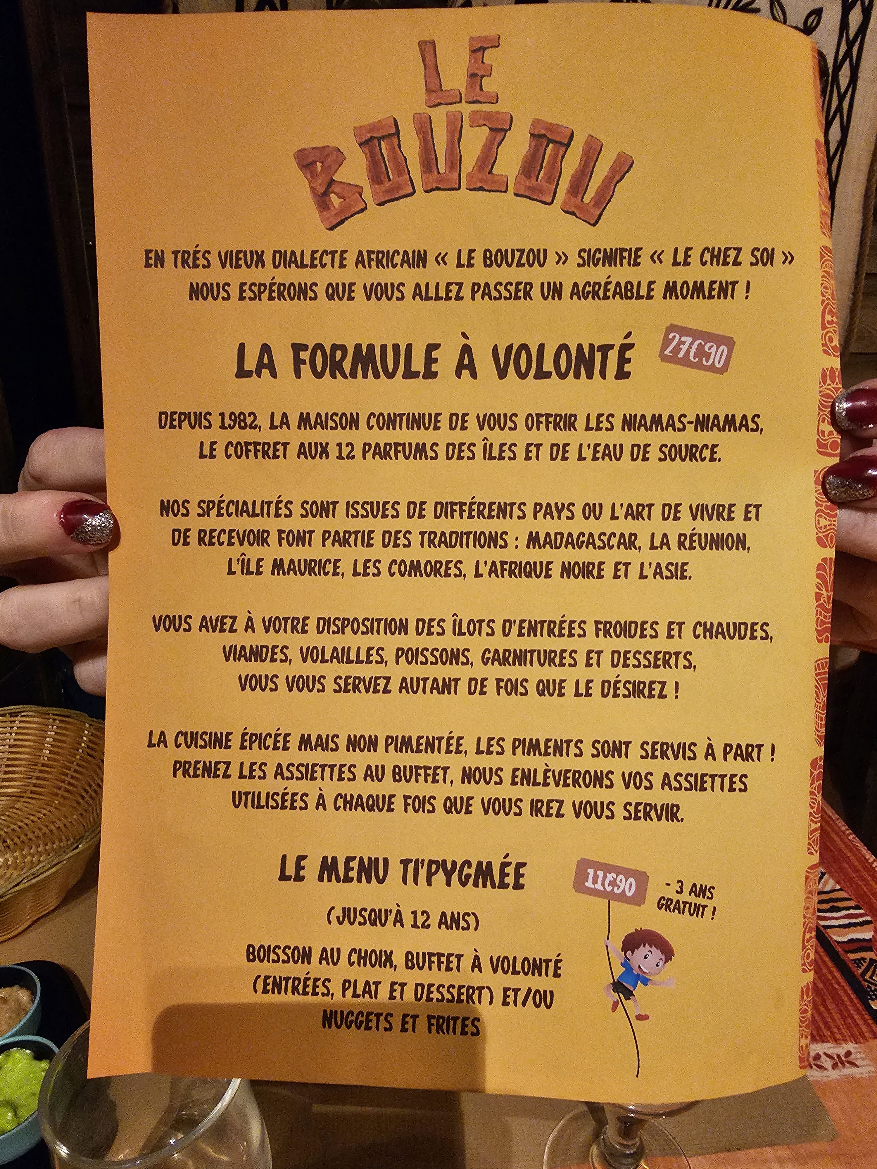Dépaysement garanti. Le bouzou est un restaurant exotique qui dispose d'un buffet L'accueil est chaleureux et commence avec des jeux d' adresse qu'il faut réussir pour bénéficier d'un digestif offert Nous avons commencé par 2 cocktails maisons à base de banane : delicieux Puis le buffet très varie avec des plats classiques de la cuisine créole mais aussi des plats moins attendus comme fu kangourou, du requin et même des insectes Tout est bien cuisine et fin Nous nous sommes régalés et vous recommandons cette adresse