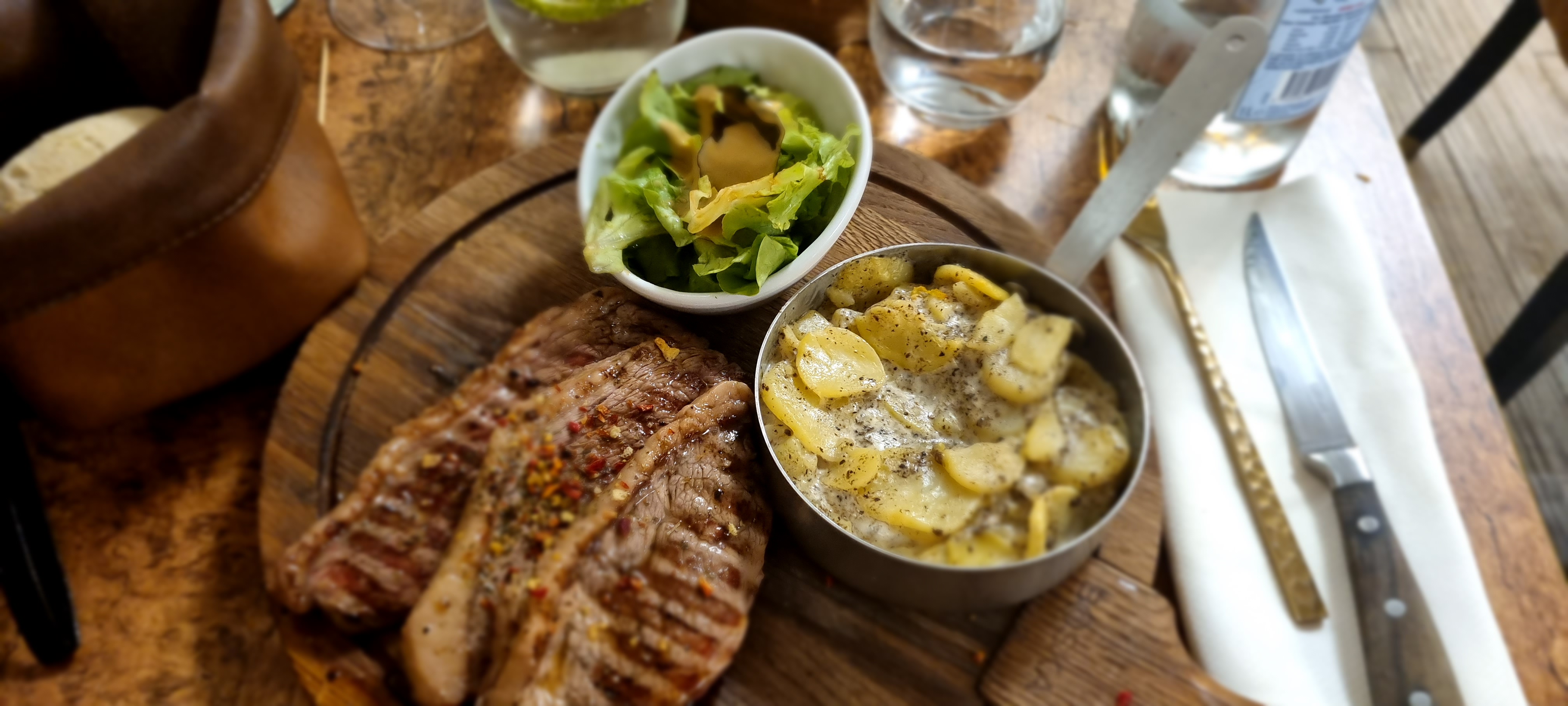 Le rumsteck sauce gorgonzola avec un gratin dauphinois délicieux Comme dessert un profiterole