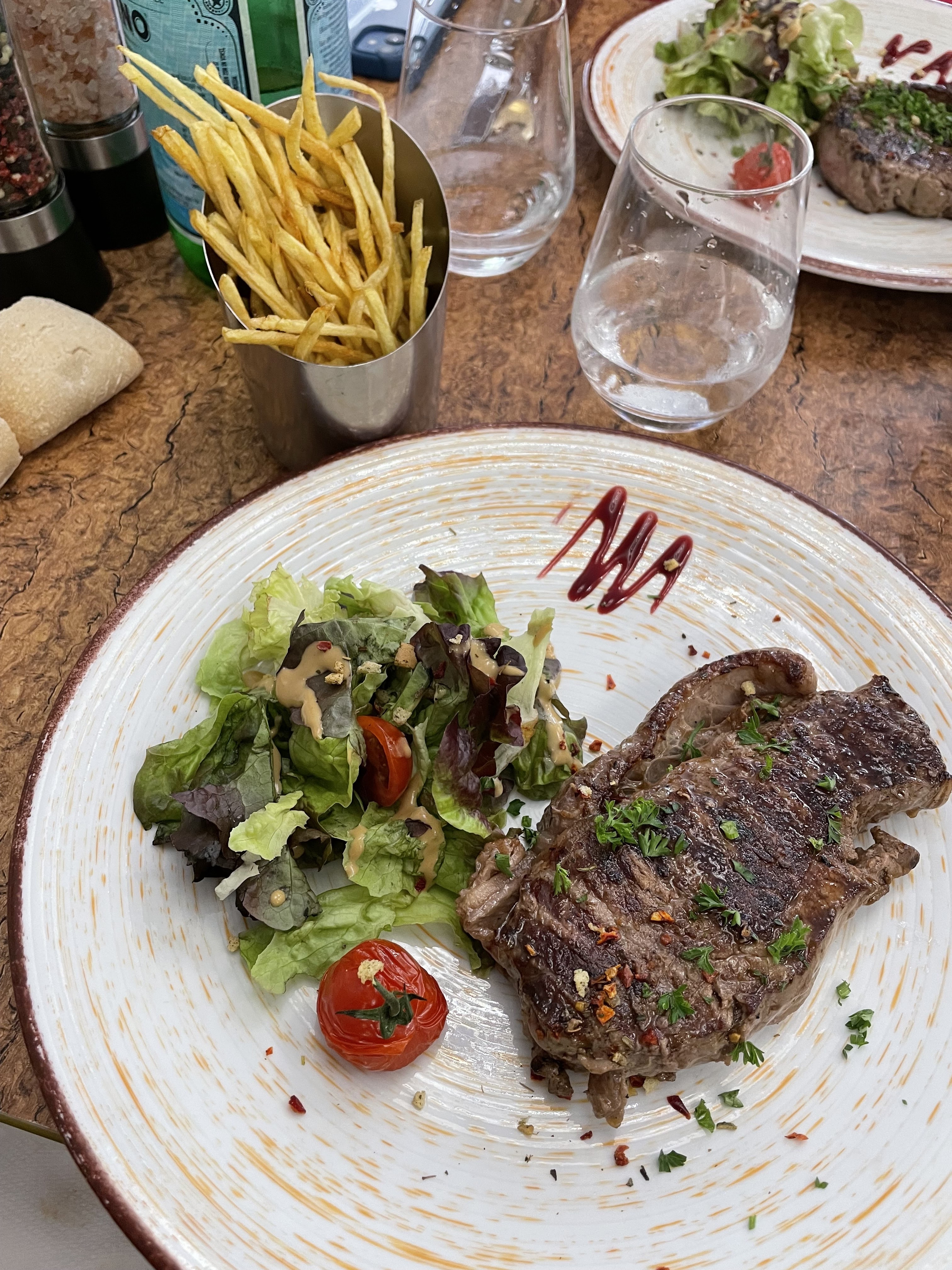 Nous avons mangé une côte de Boeuf et du filet de Boeuf succulent et juteux suivi d'un Baba au Rhum inoubliable. Service et hospitalité inpeccable. Nous reviendrons.