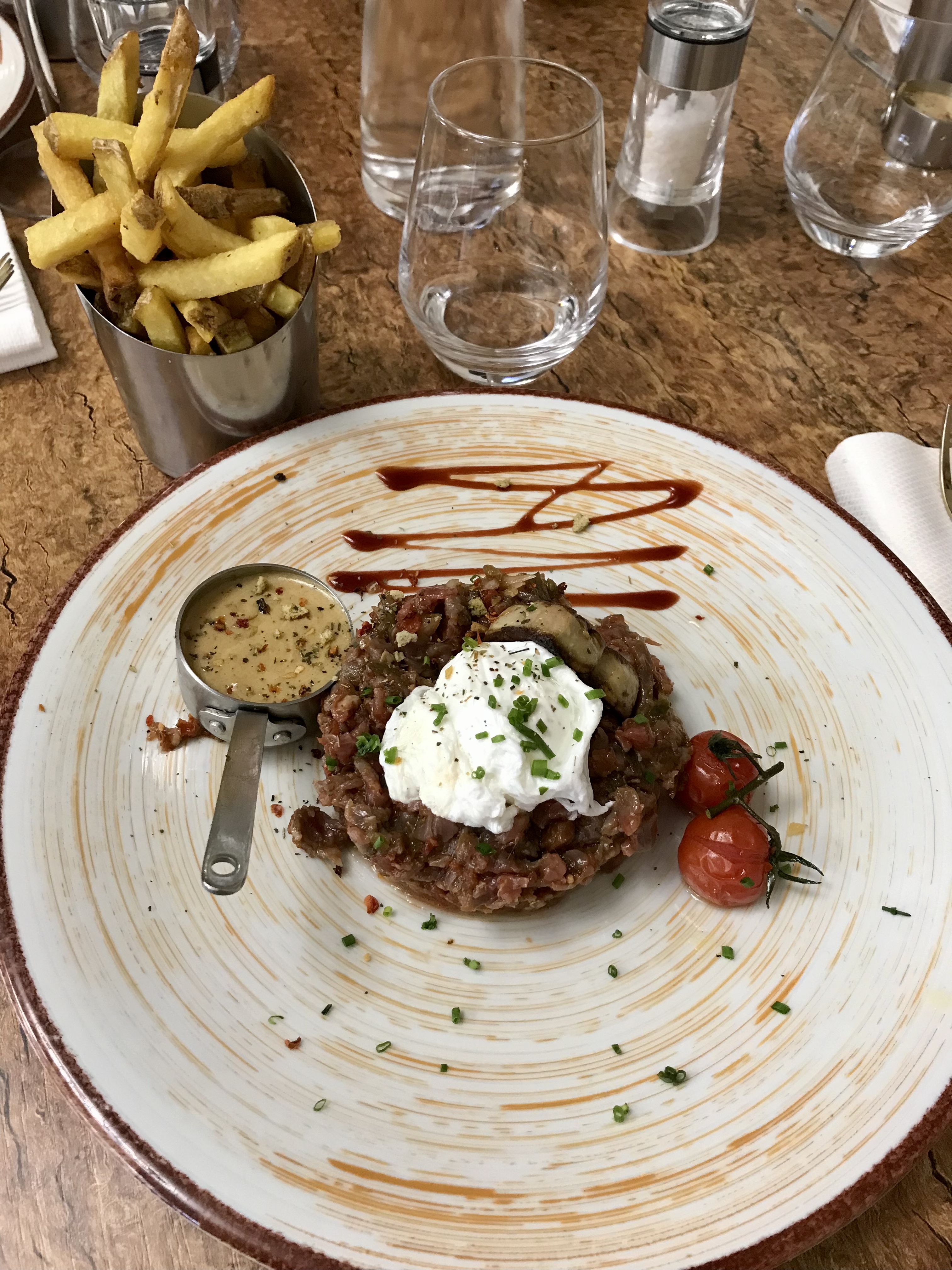 Je ne recommande absolument pas ce restaurant !!!!! Je suis sans viande et je suis allée avec mon épouse, manger en entrée j’ai pris un Tataki de thon qui était affreusement répugnant m’la sauce nul. Et enfin en plat la masse de tartare déposée sur l’assiette qui n’avait aucun gout. 50€ juste pour une personne. Je ne le recommande pas du tous très déçu