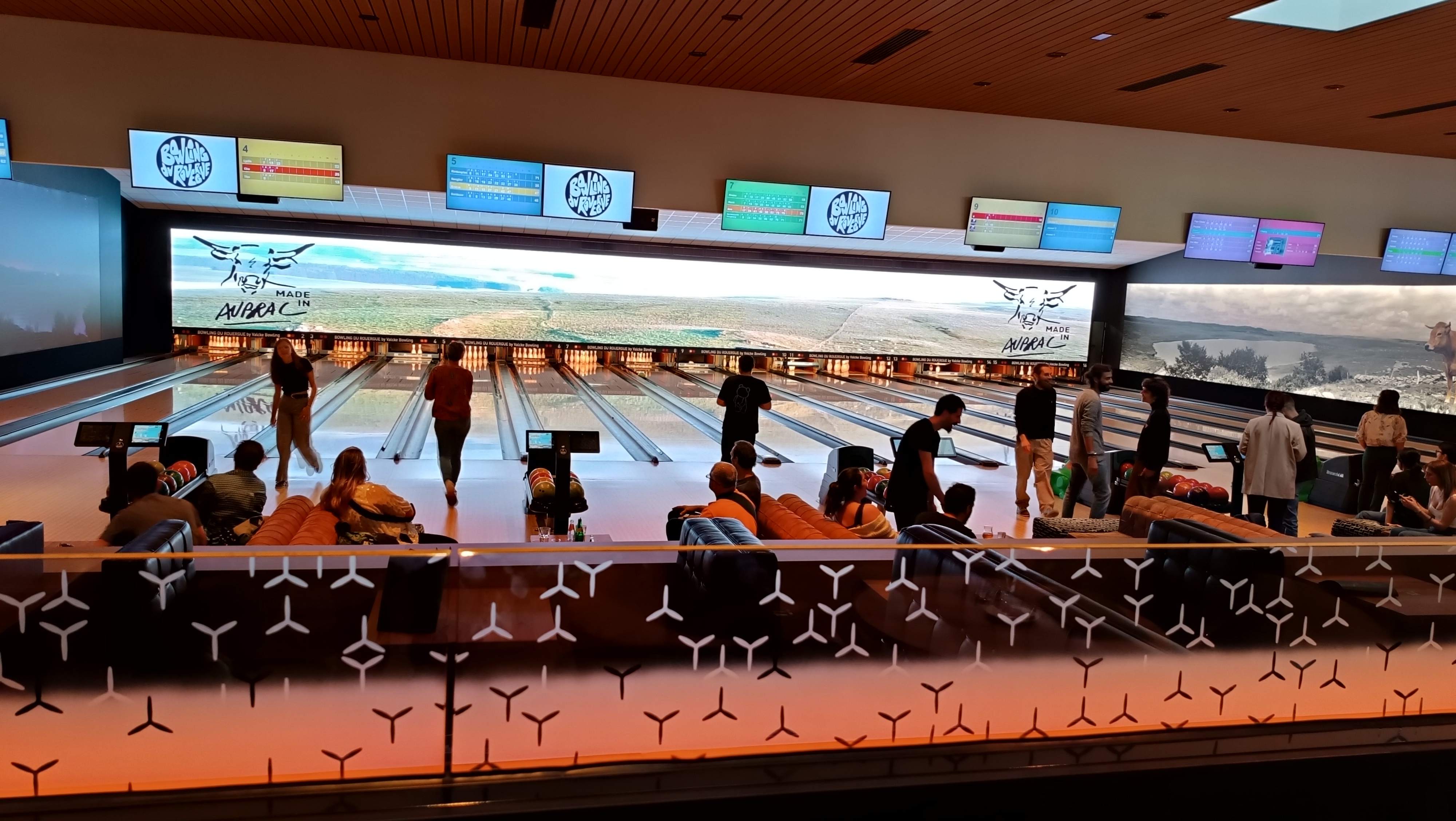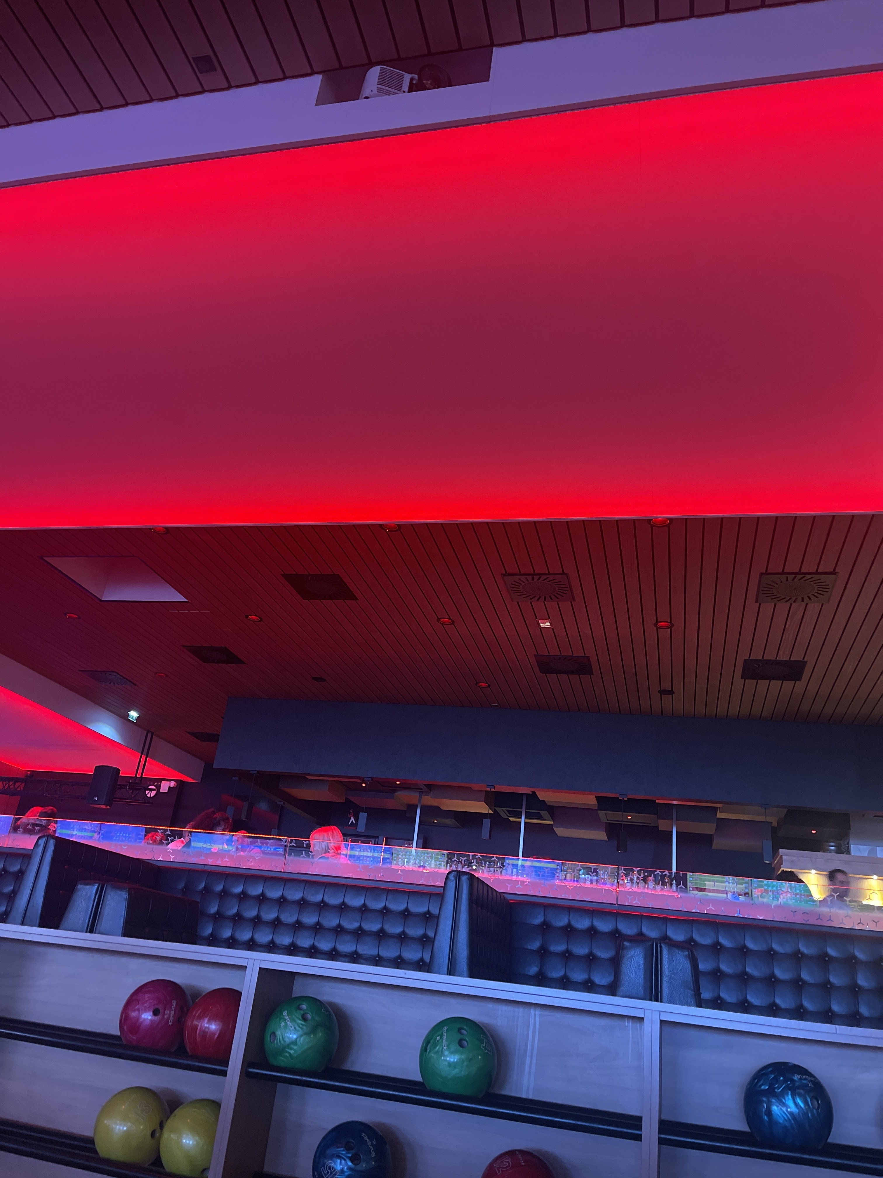 Ce bowling est magnifique !! Super moderne et super cosy à la fois. Une merveille. Très pratique la petite salle sécurisée où les jeunes enfants peuvent s'amuser pendant que les adultes jouent au bowling (parcours matelassé, piscine à balles, toboggan). Bravo!