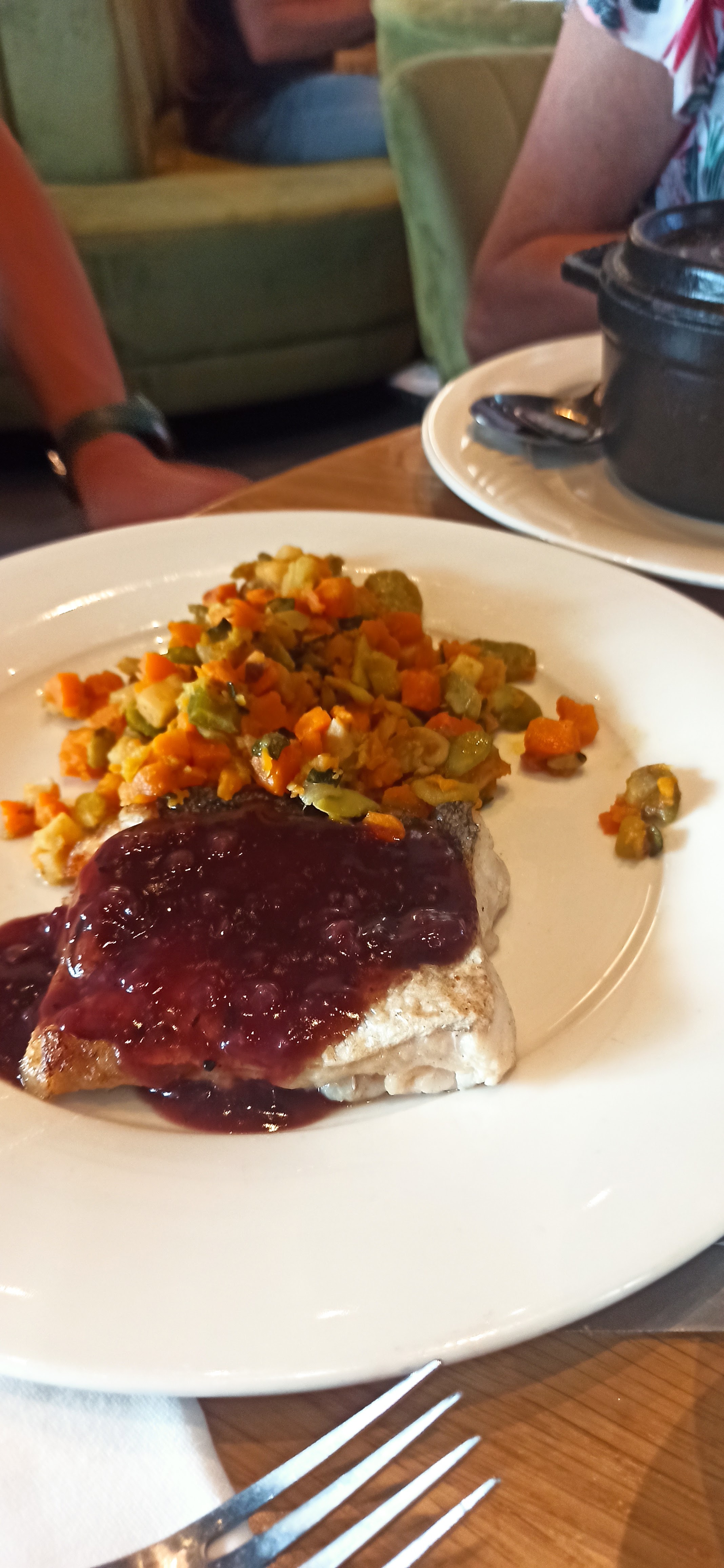 Repas terre et mer dans l’assiette… - Côte de veau (énorme) de l’Aubrac, sauce normande et pavé de saumon des mers du nord de l’Aubrac, sauce au beurre blanc (une tuerie)… 🍽🍷sublimissime !!! 🤪 Un seul bémol ♭ = l’attente ⏱⏳ car on est victime de leur succès vu le monde qui vient manger et un peu trop bruyant…🔊