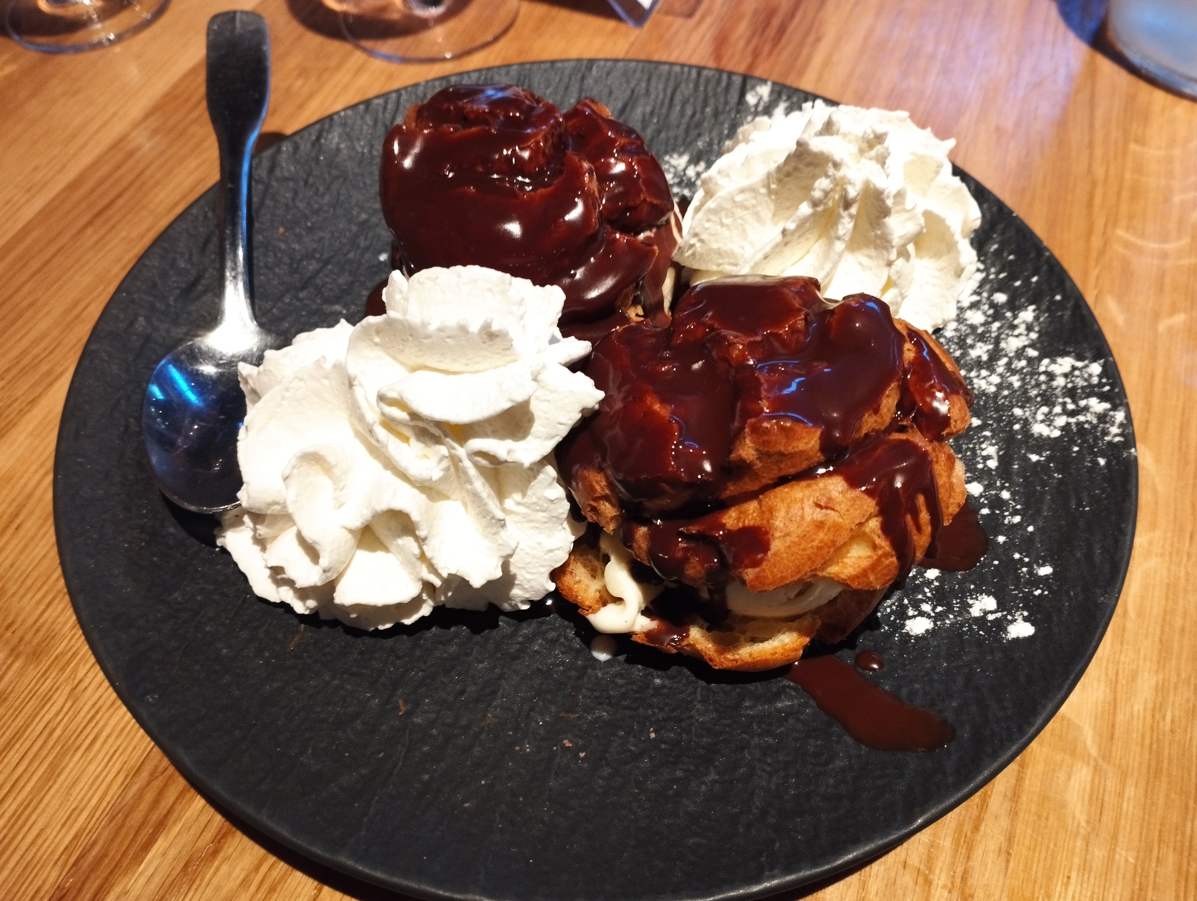 Endroit très agréable et chaleureux, les plats sont de très bonne qualité. Cependant, quelques petits bémols dont les desserts. Le gâteau au chocolat était sec tout comme les profiteroles : pour le prix, cela laisse à désirer.... Tout comme la très petite portion des frites servie. Pour 5 (dont la commande d'une grande assiette de frites), nous avons reçu une portion pas très nourrissante à partager !