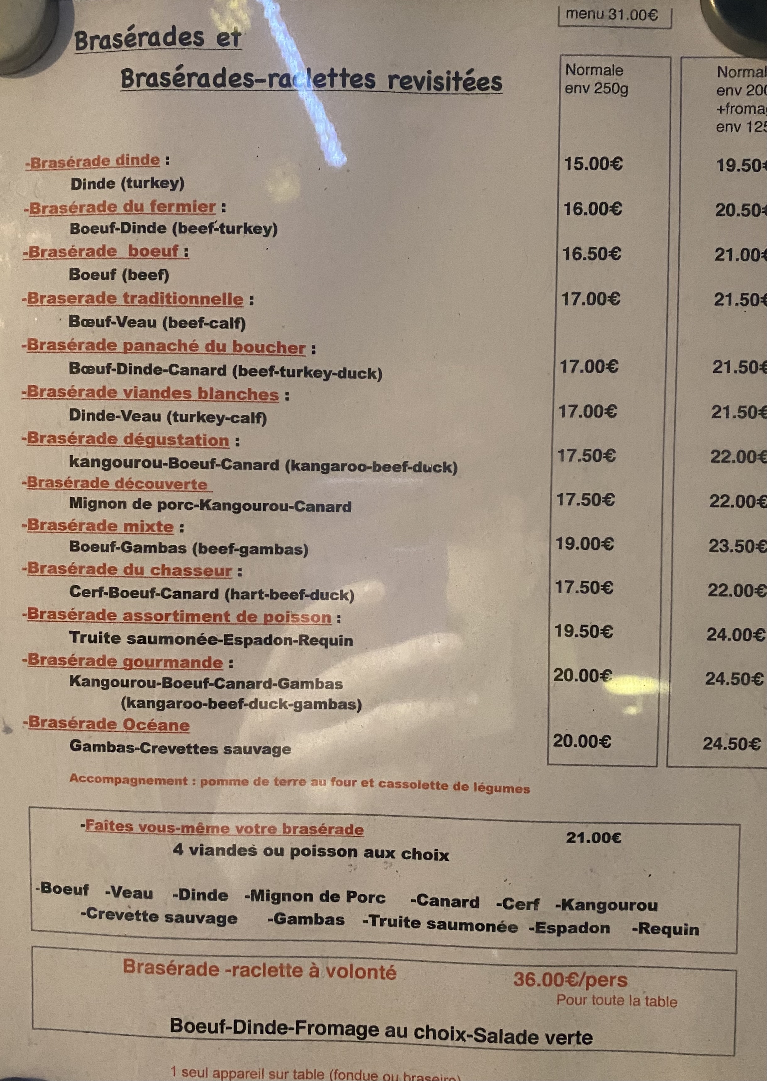 Du choix. De la braserade viande ou poisson. Des plats autre. Accueil sympa. A faire en petit groupe pour la convivialité.